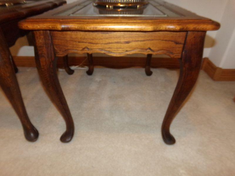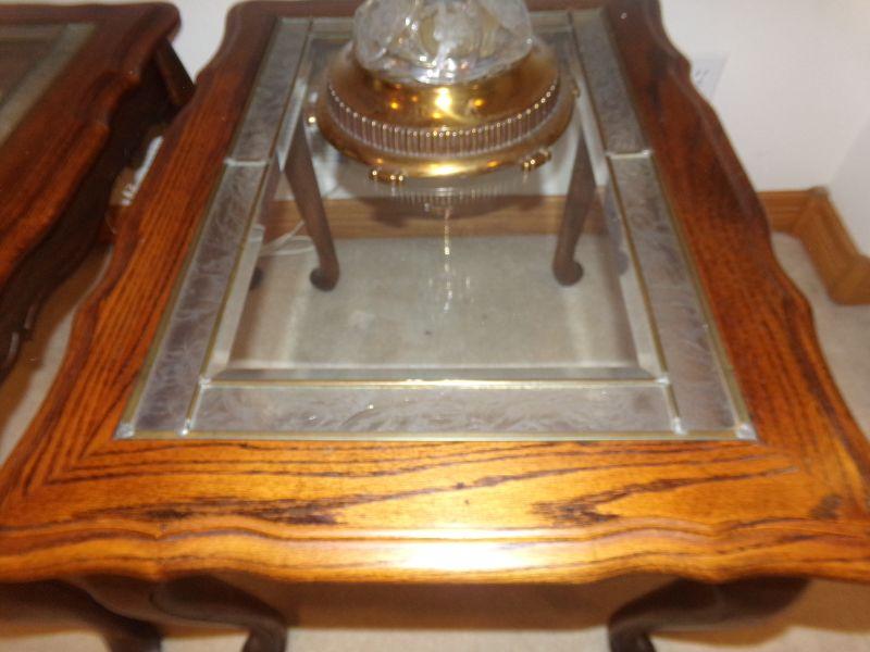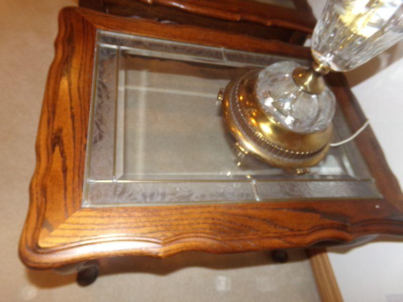 ETHAN ALLEN WOOD FRAMED END TABLES WITH FROSTED GLASS ALONG THE PERIMETER AND CLEAR GLASS IN THE MIDDLE DIVIDED BY A BEAD OF LEAD 23" X 30" X 22"