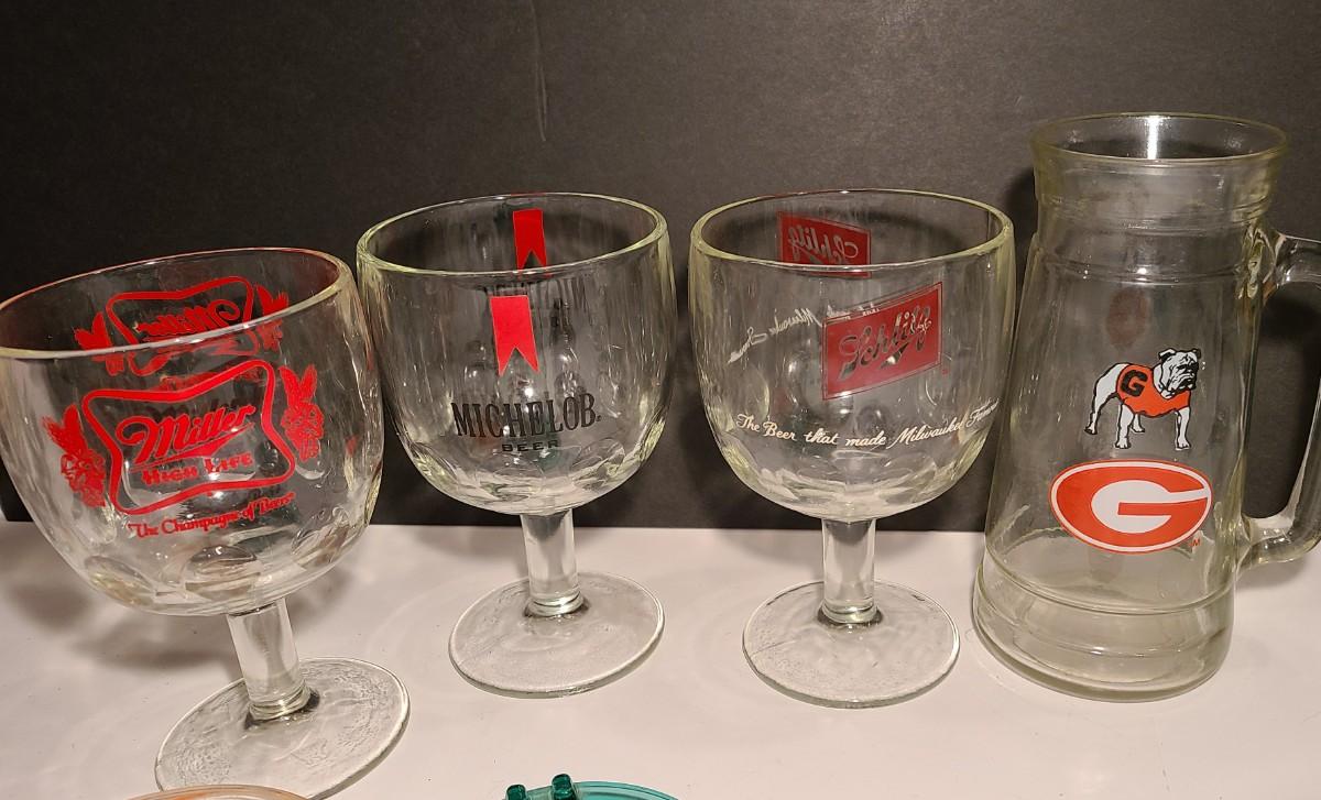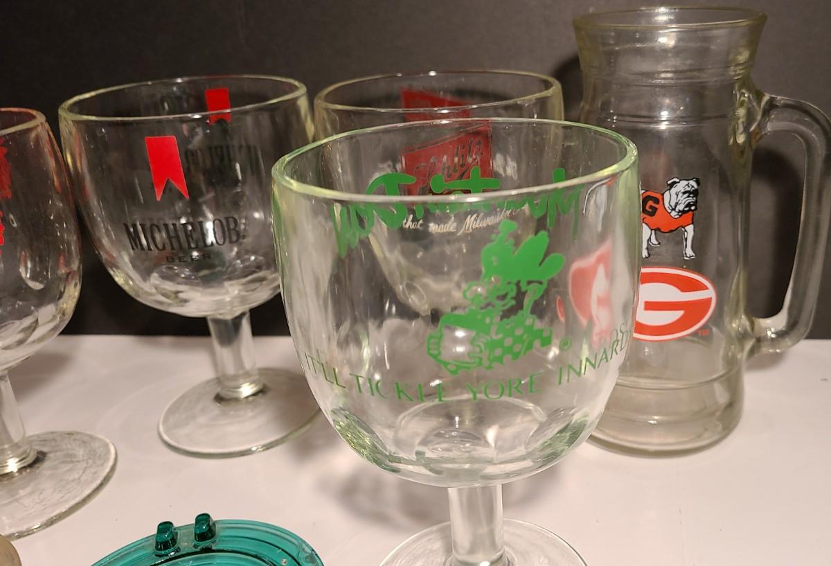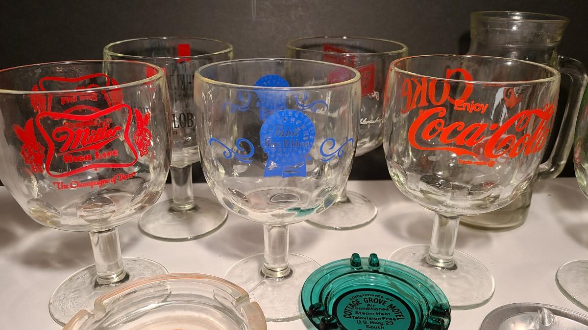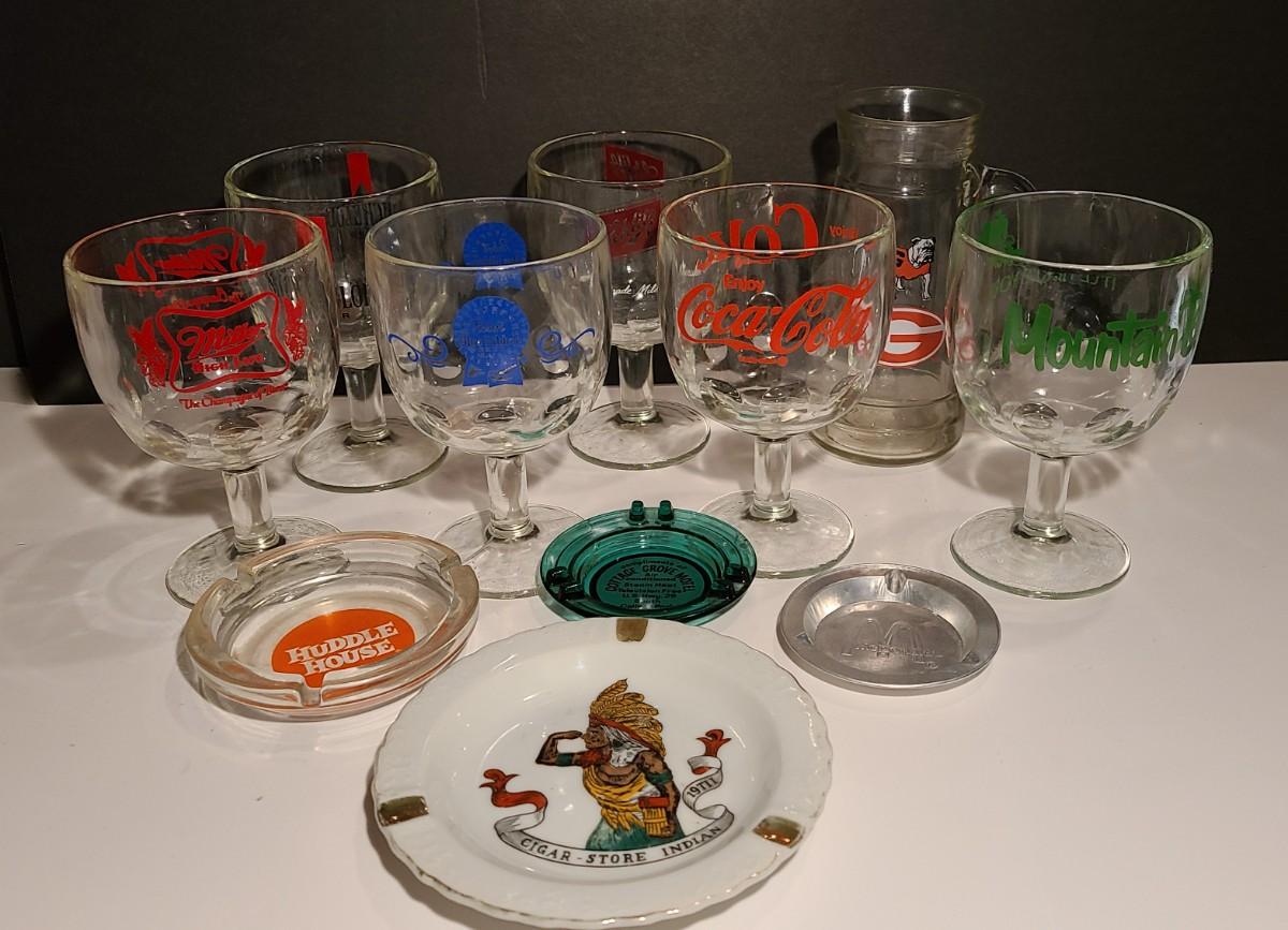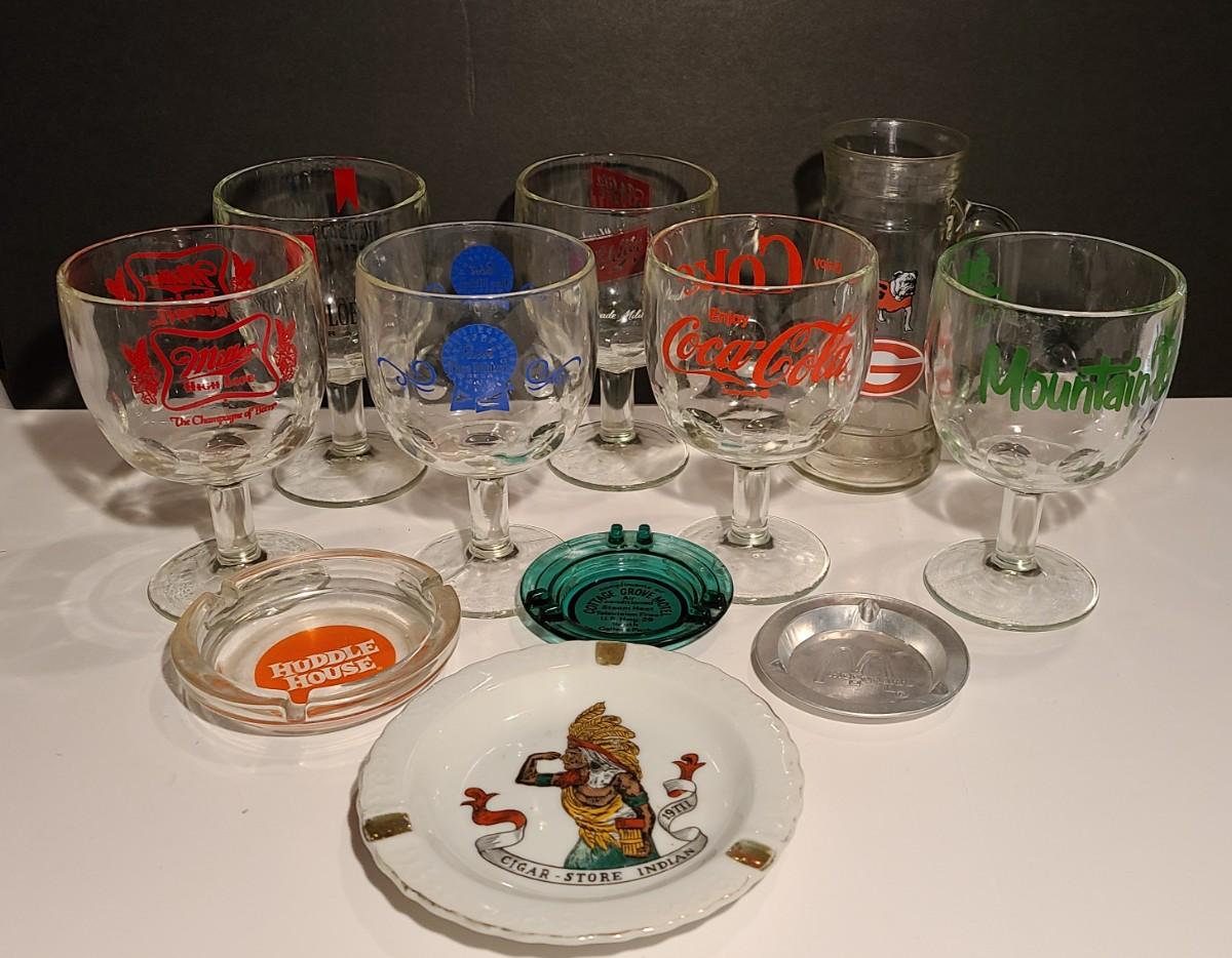 Vintage beer and soda glasses, and ashtrays. Huddle House Ashtray shows some wear to glass. Please see all pictures for content of the lot, condition of the lot, and measurements if taken. Pictures are the best representation of the items listed and items are untested unless indicated in description. Thank you for looking and have fun bidding!