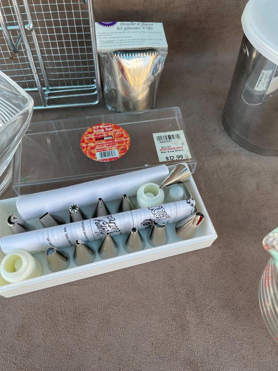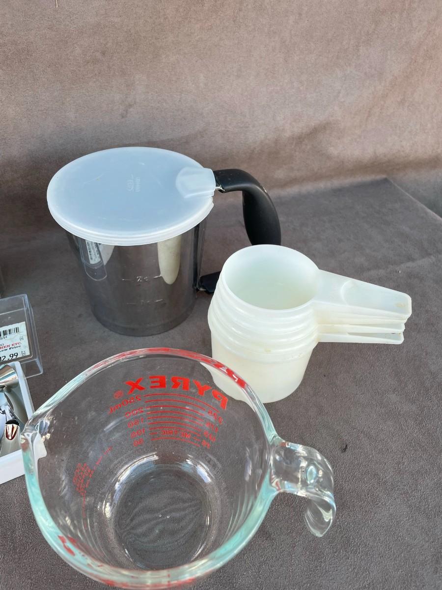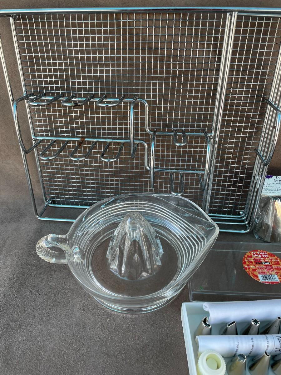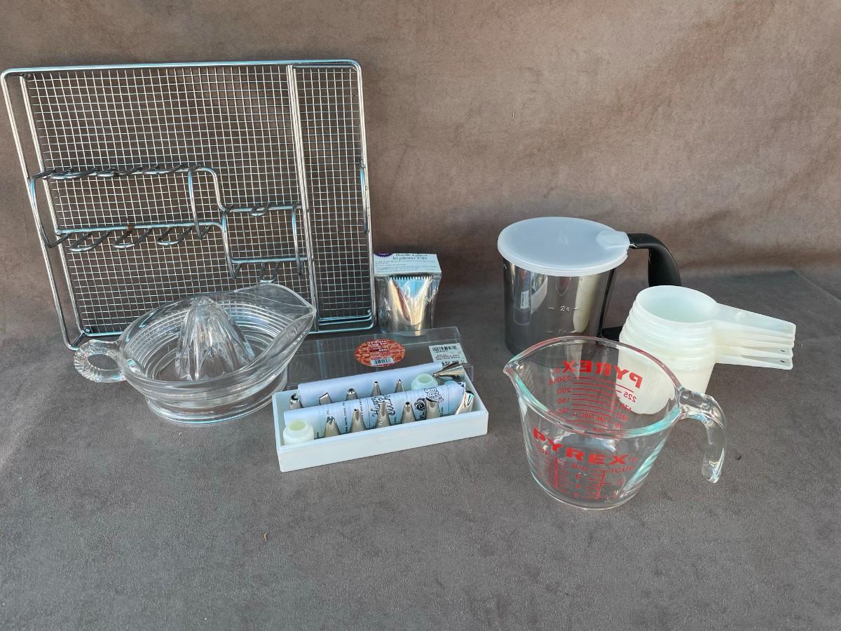 Vintage Juicer, Cake Decorating Kit, Pyrex Measuring Cups, Tupperware Measuring Cups, Sifter, & Drawer Organizer.
