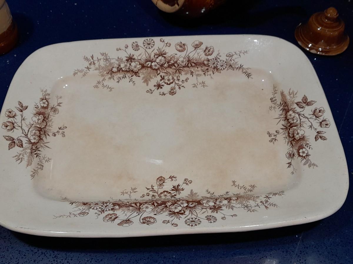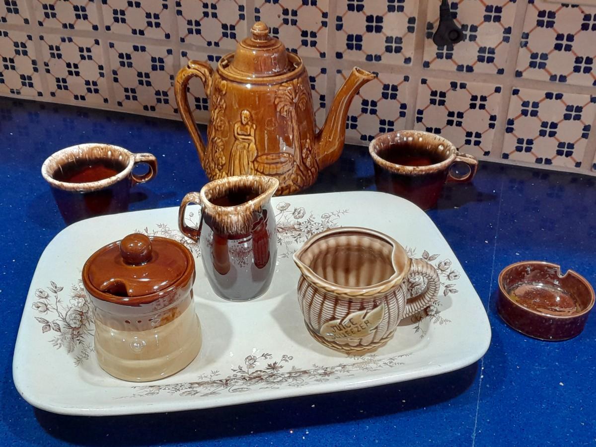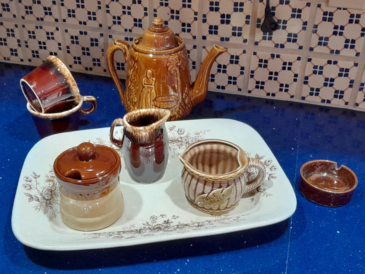 VINTAGE KITCHEN POTTERY PIECES INCLUDING, ENGLAND PLATTER, TEA POT, AND AN ASSORTMENT OF CONDIMENT SERVING DISHES.