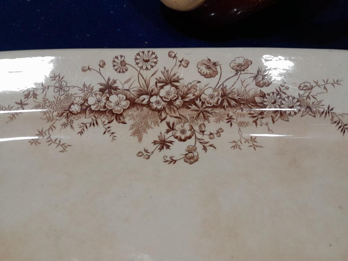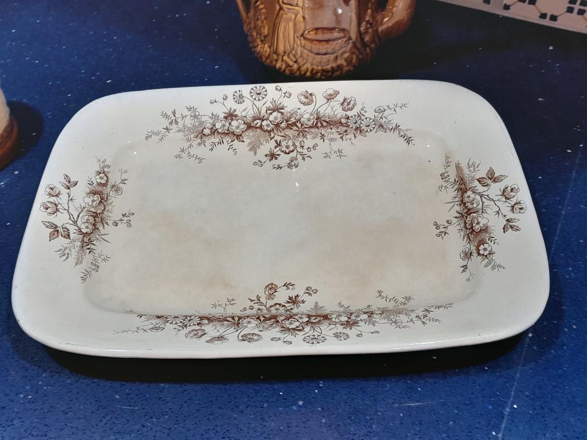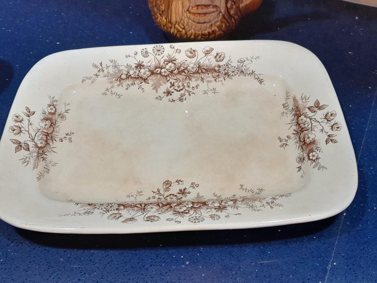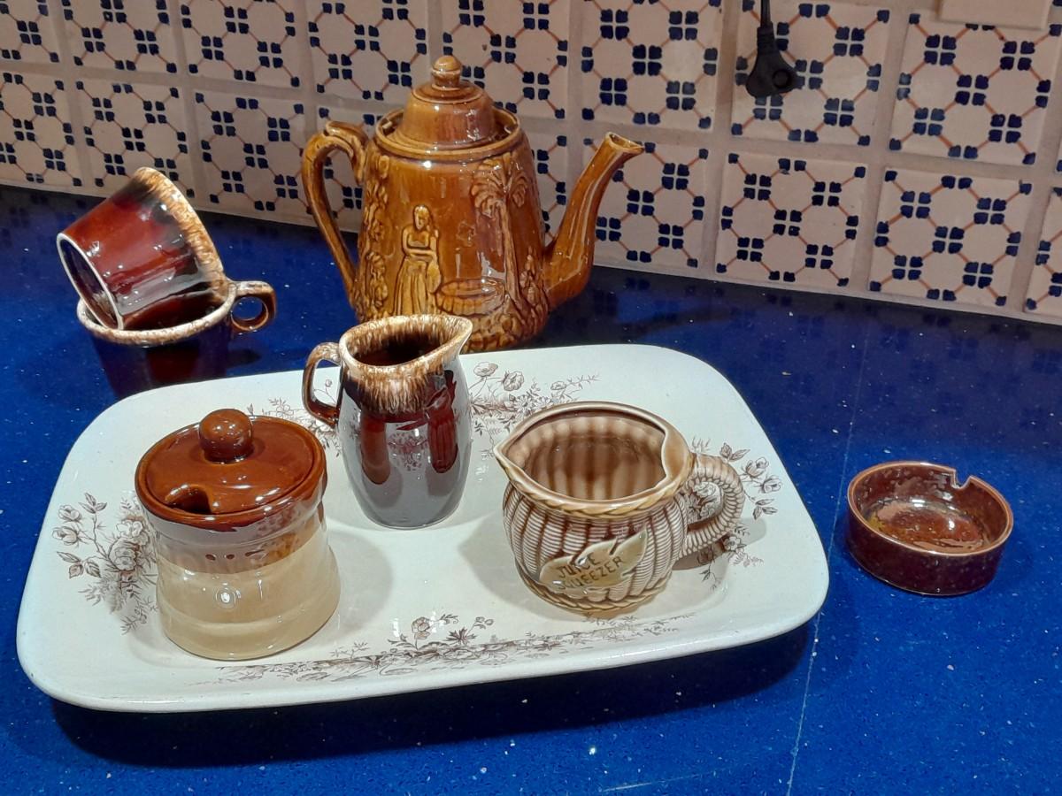 VINTAGE KITCHEN POTTERY PIECES INCLUDING, ENGLAND PLATTER, TEA POT, AND AN ASSORTMENT OF CONDIMENT SERVING DISHES.