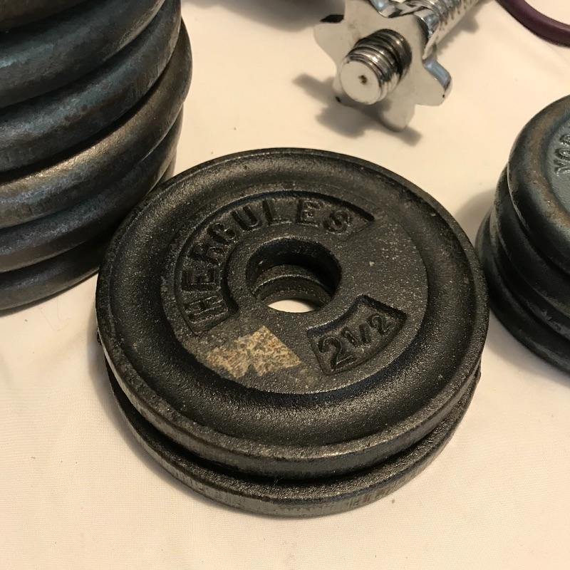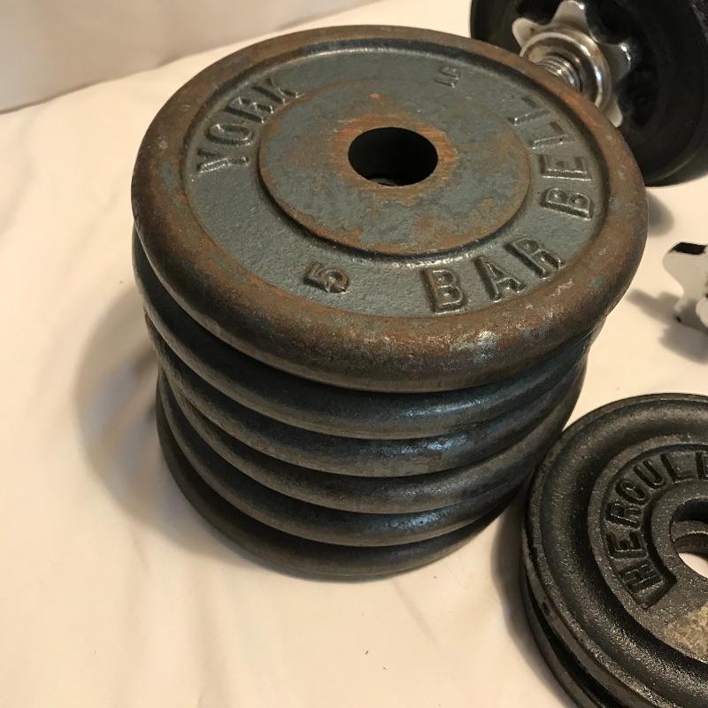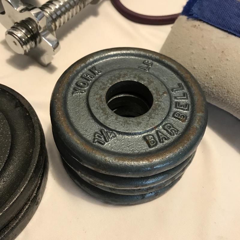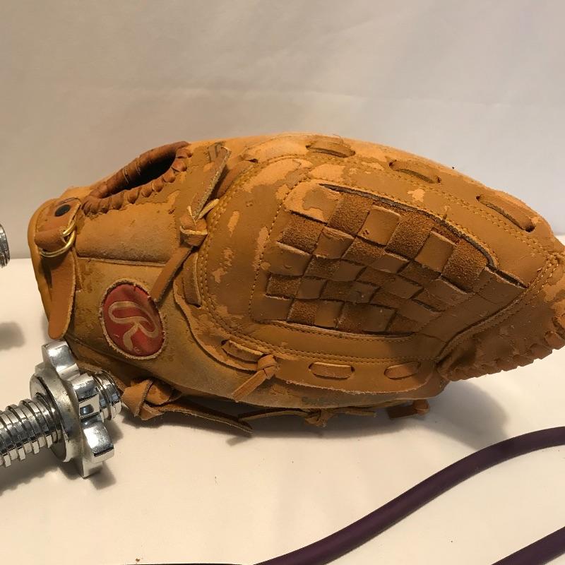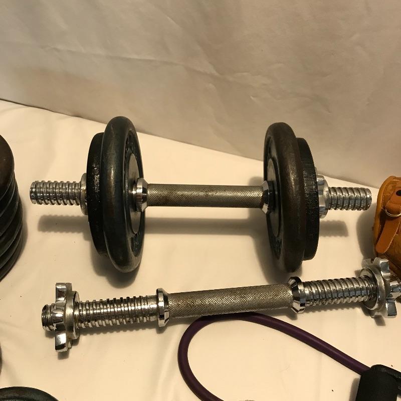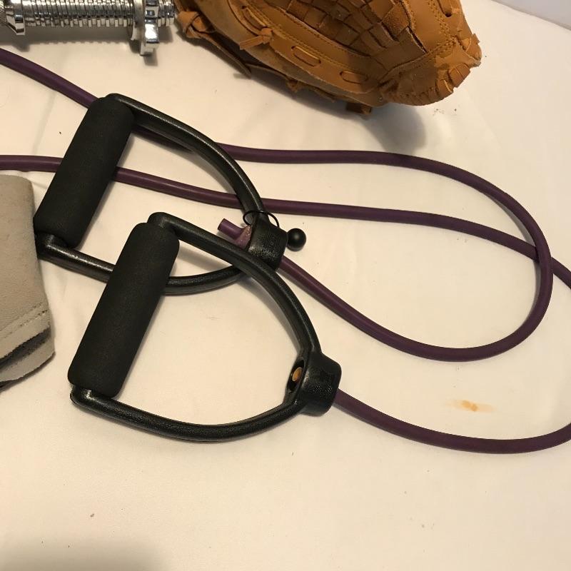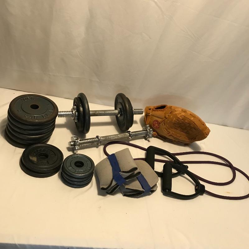 Get those muscles tone with two barbells with a total of 65 pounds of weights (in 5lb, 2.5lb and 1.25lb weights). Two leg/arm weights for easy exercise and a resistance rope, just for some variety! Lot also includes Rawlings mitt. See photos. Local pick up only.