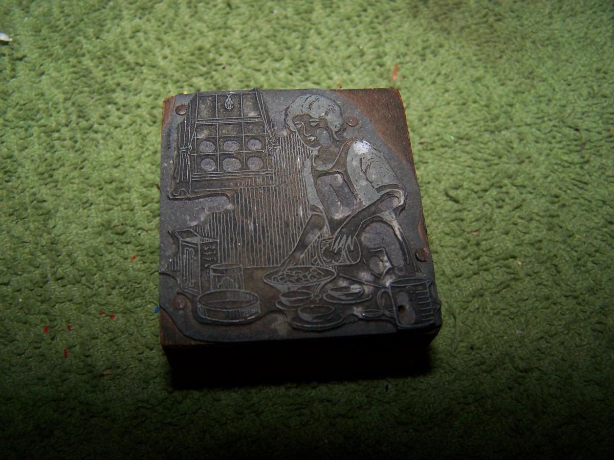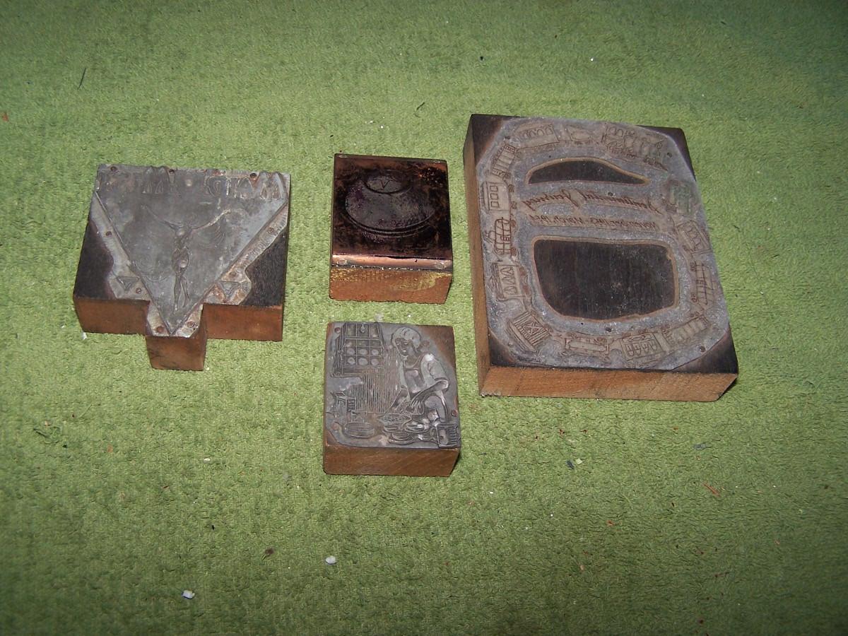 THESE ARE WONDERFUL VINTAGE PRINTING BLOCKS!!!! LARGE BLOCK IS 3 1/4'' X 4 1/4''..SOME WRITING ON THE BACKSIDE, OTHERWISE, LIGHT WEAR... THEY HAVE BEEN USED..