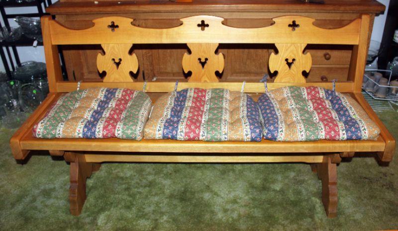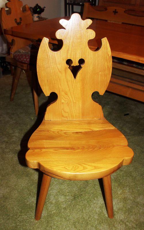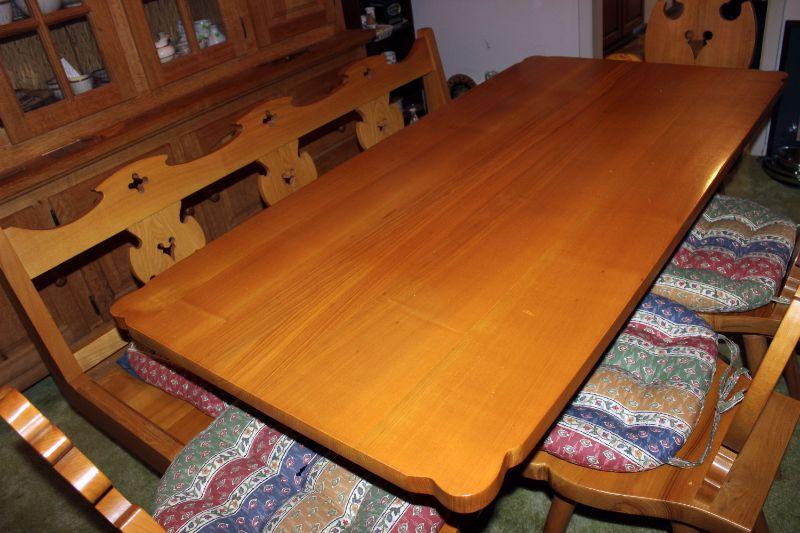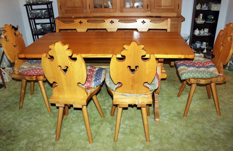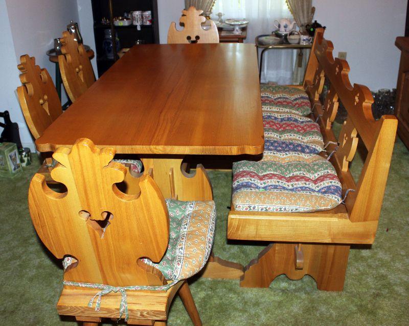 Great Mid-Century Polish hand-crafted set. Table is in excellent condition 58 " x 29 1/2" , Bench id 59" long. Includes 4 chairs and all pads and cushions. You must bring help to move these very solid pieces of furniture