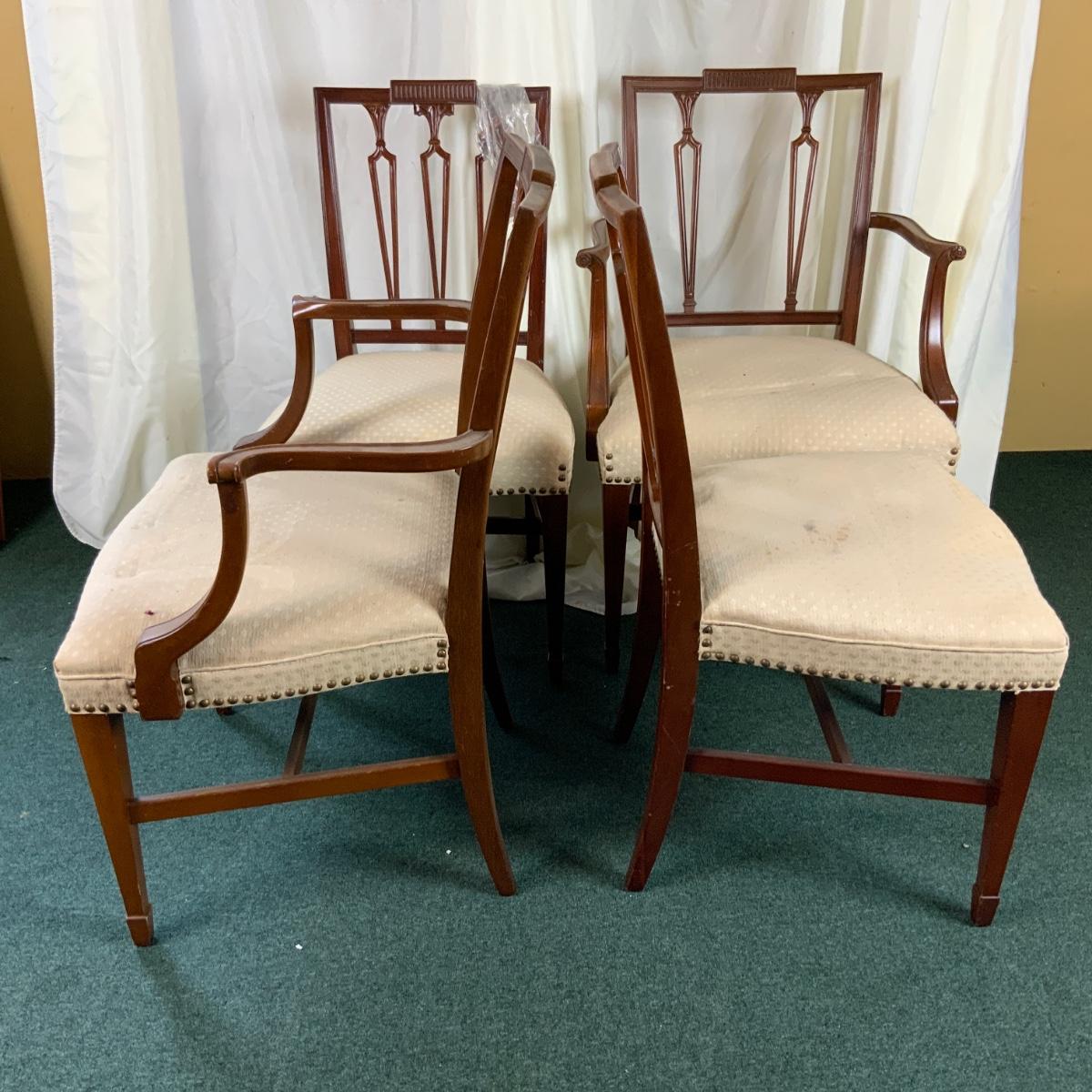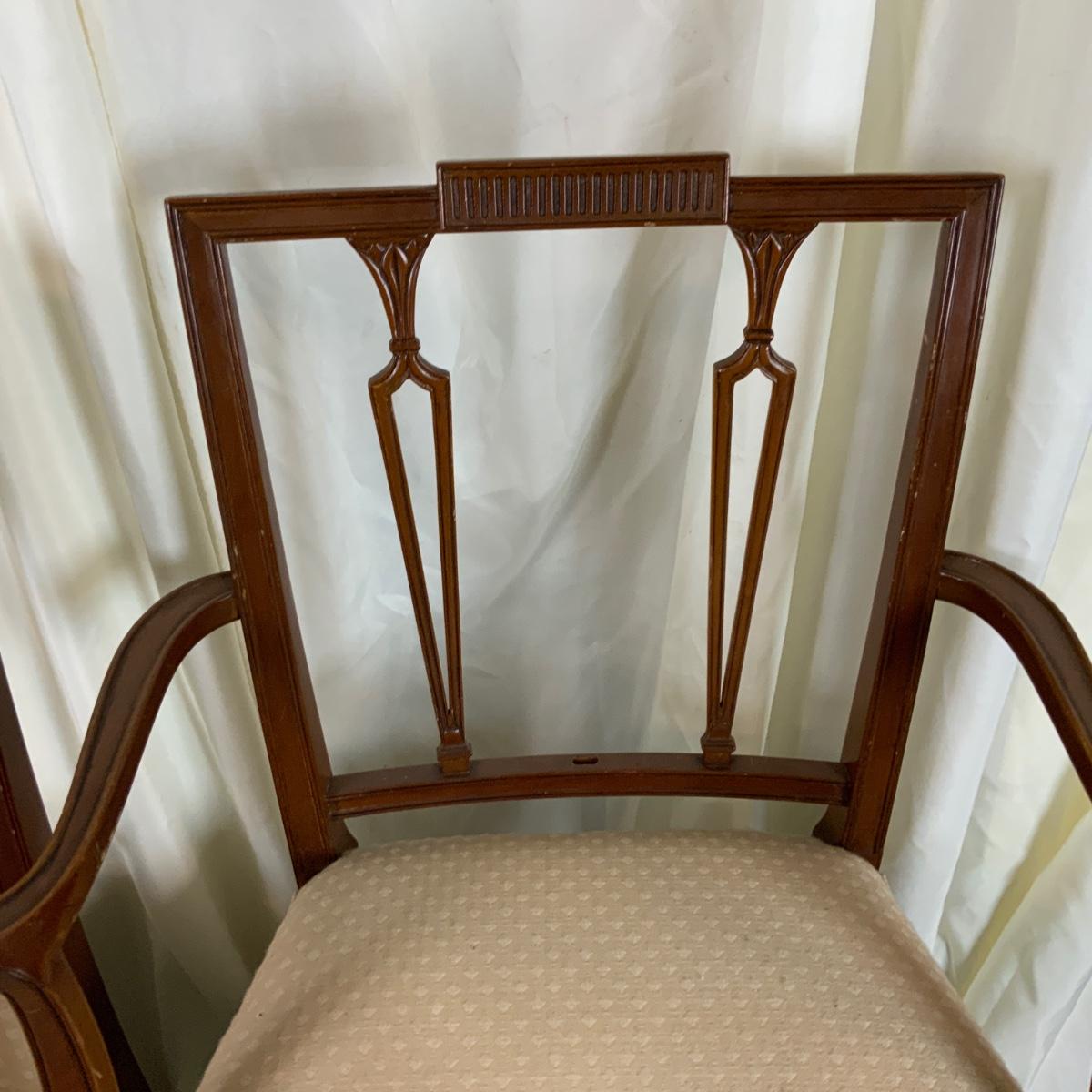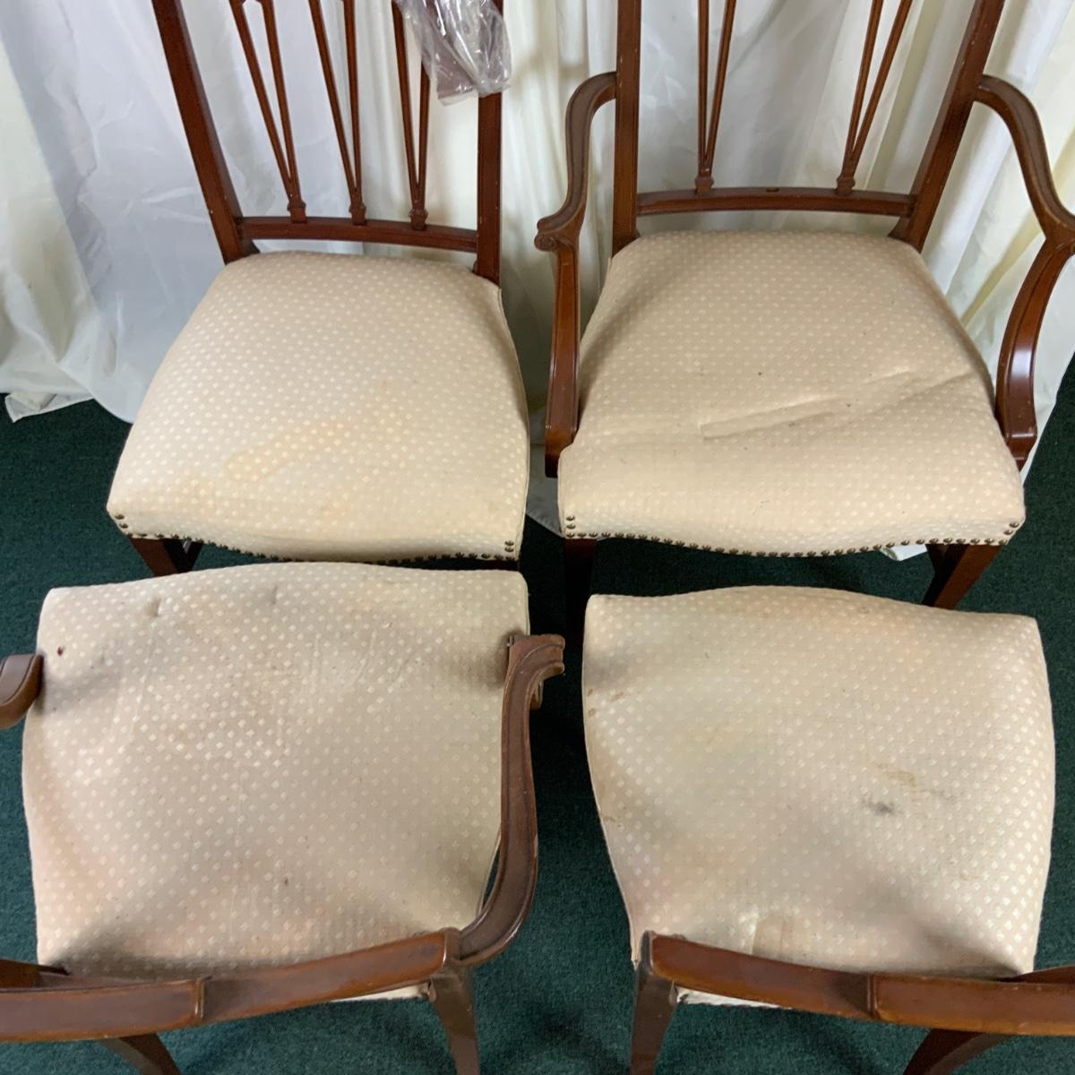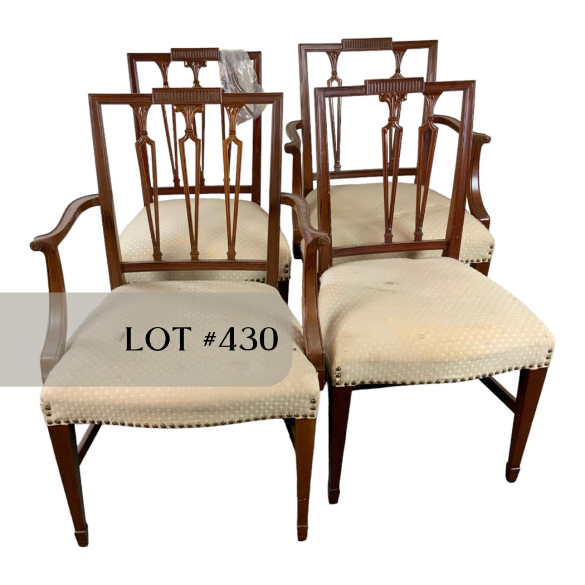 Set of 4 Dining Chairs. Two with arms, two armless. Just need some cleaning. //::\\ Please see photos for details and condition. No attempt has been made to hide any imperfections. All items listed in this auction are warehouse items, and need to be cleaned. A majority of the items need restoration as well. All items are sold AS IS and WITHOUT GUARANTEE. If you are uncertain about an item, DO NOT BID. Due to the nature of this online auction in-person inspection is HIGHLY recommended. All Sales are FINAL. Pick Up Times are FIRM. Please confirm with your own schedule that you can pick up in the scheduled times listed in the Terms and Conditions. Any questions please message the auctioneer. DO NOT Contact The Harp Gallery.