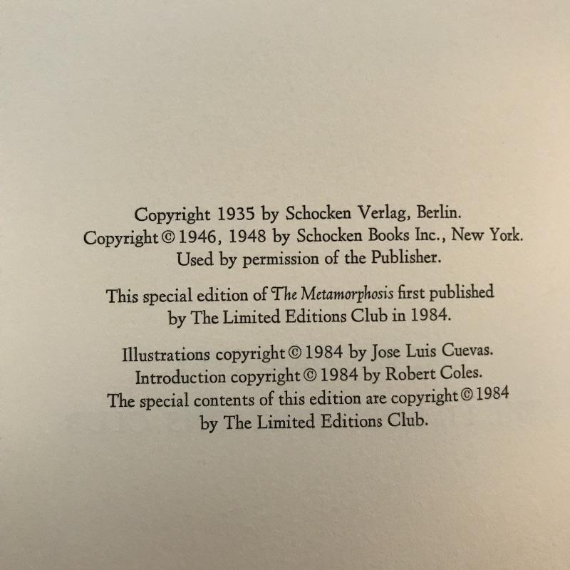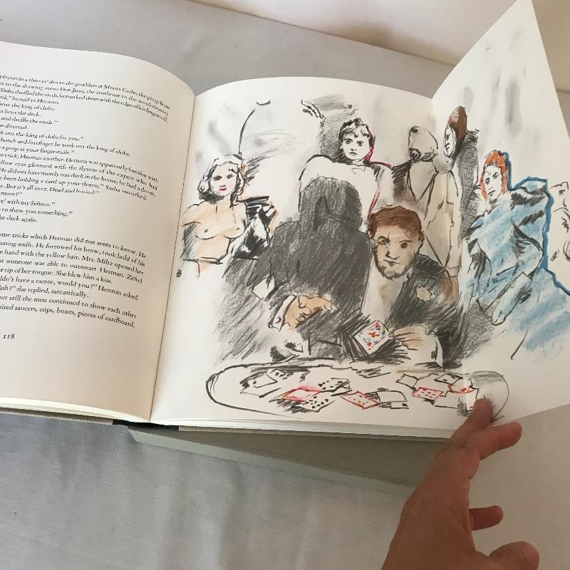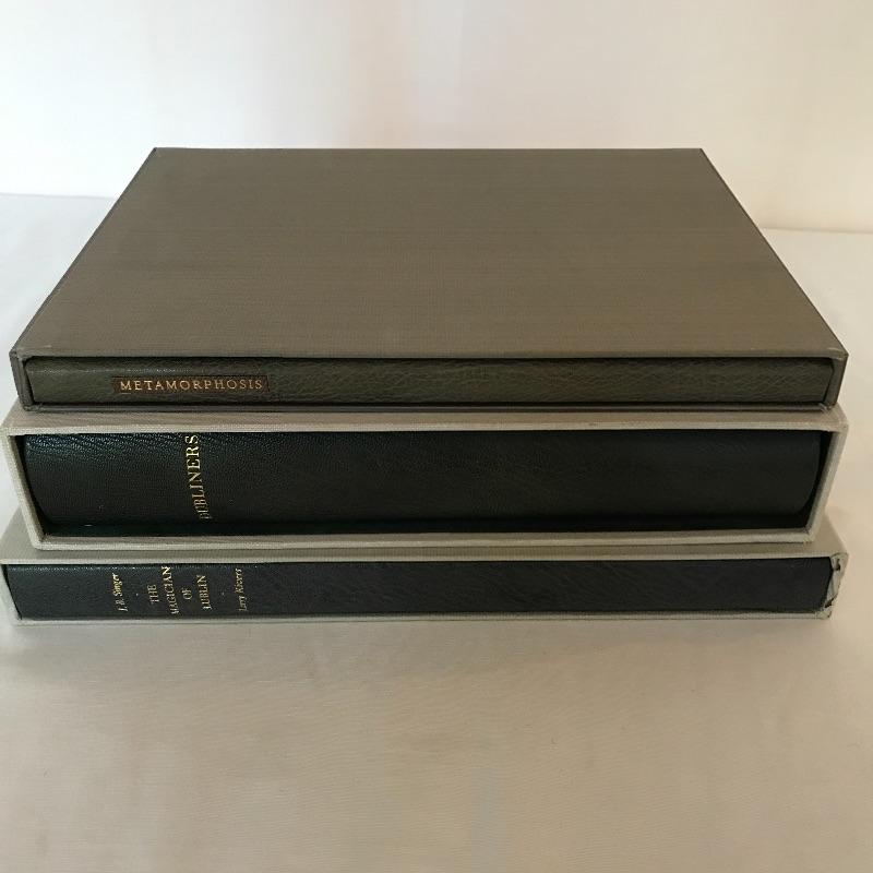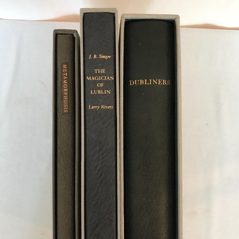 These lovely collectible books are made for each other with their lovely greenish tones. Your shelf or table top will look great with these three Limited Editions Club books. They include Metamorphosis by Frank Kafka with drawings and etchings by Jose Luis Cuevas. Measures 11” x 8.5” Also includes Dubliners by James Joyce. Photogravures by Robert Ballagh measuring 11.5” x 9.25”. Lastly you find The Magician of Lublin by Isaac Bashevis Singer with Lithographs by Larry Rivers. All books and cases are in excellent condition. Shipping available