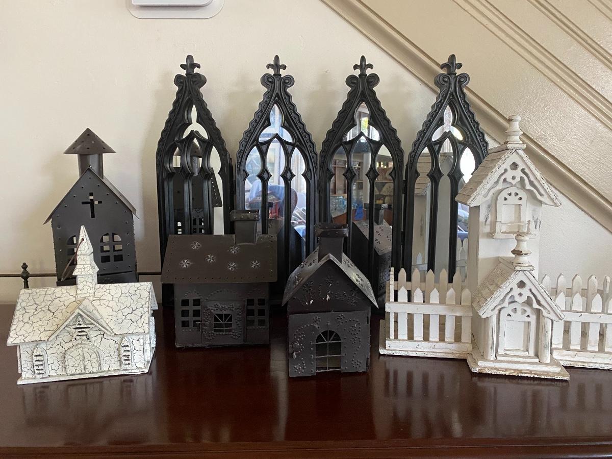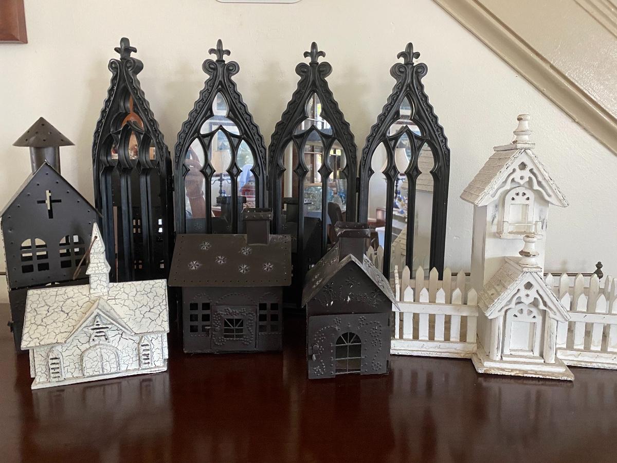 Tin church candle holders, white church decor, and a paneled screen of mirrors in the shape of cathedral windows. Pretty on furniture as decor or hanging! Please see all pictures as they are the best representation of the items. The pictures show condition, measurements if taken, and what is included in the lot. Due to the large amount that we photograph and the time frame, we are not always able to take measurements. All items unless noted, are pre-owned and have been used. If you purchased furniture, you must bring help. We do not allow one person to carry large furniture out on their own. Bring help, tools and a truck for the safety of our client’s homes, and your personal safety. Company policy. Thank you.