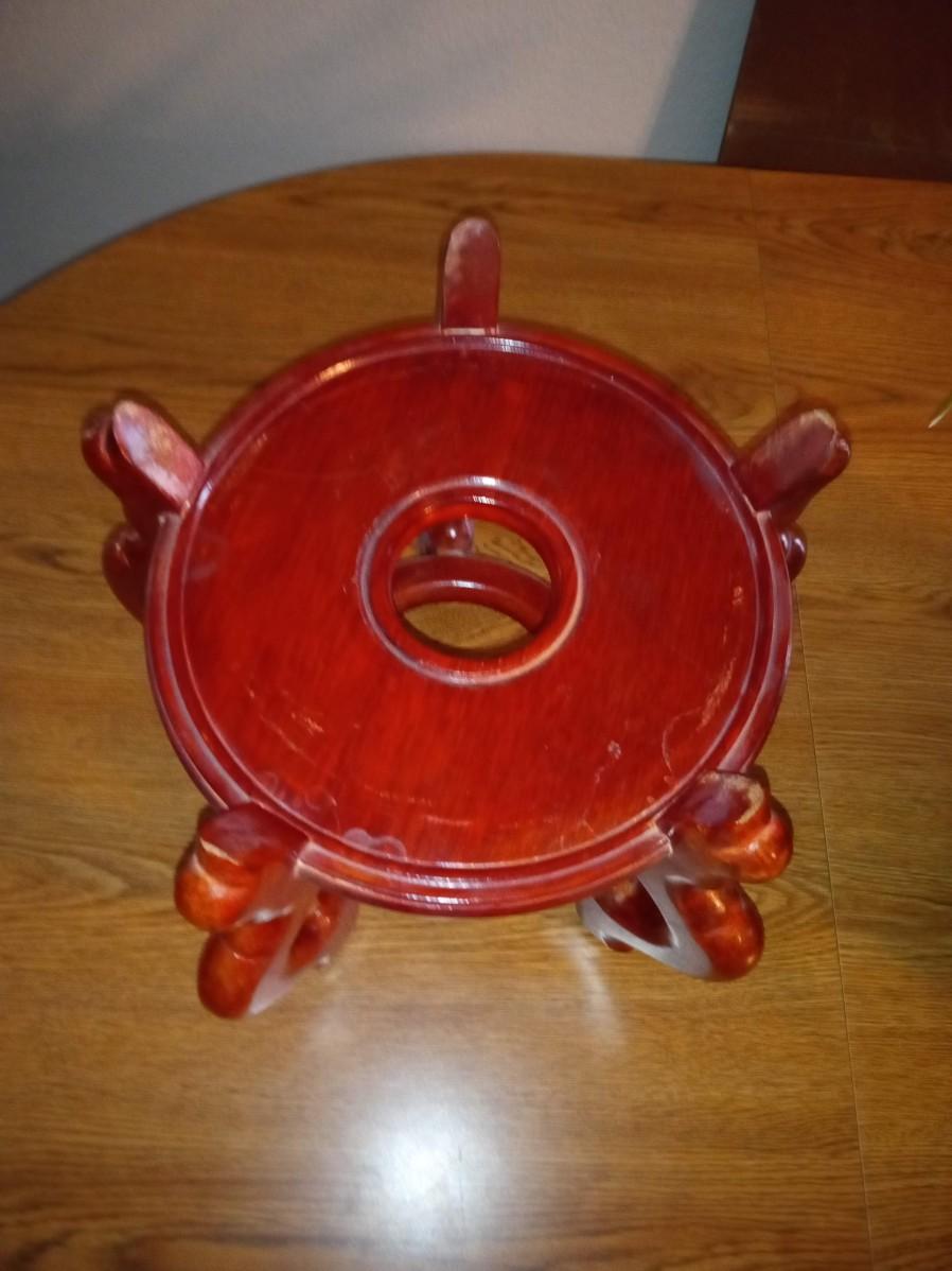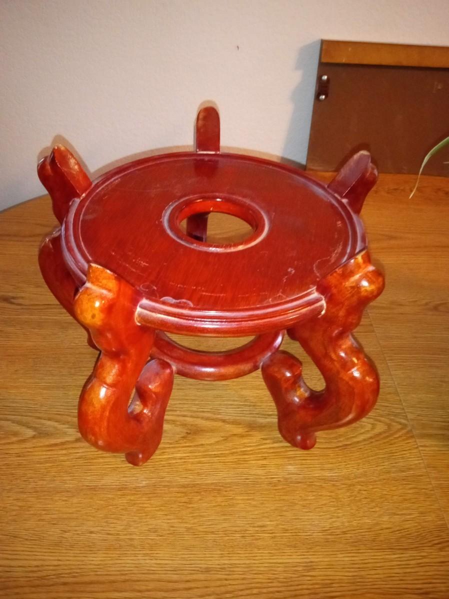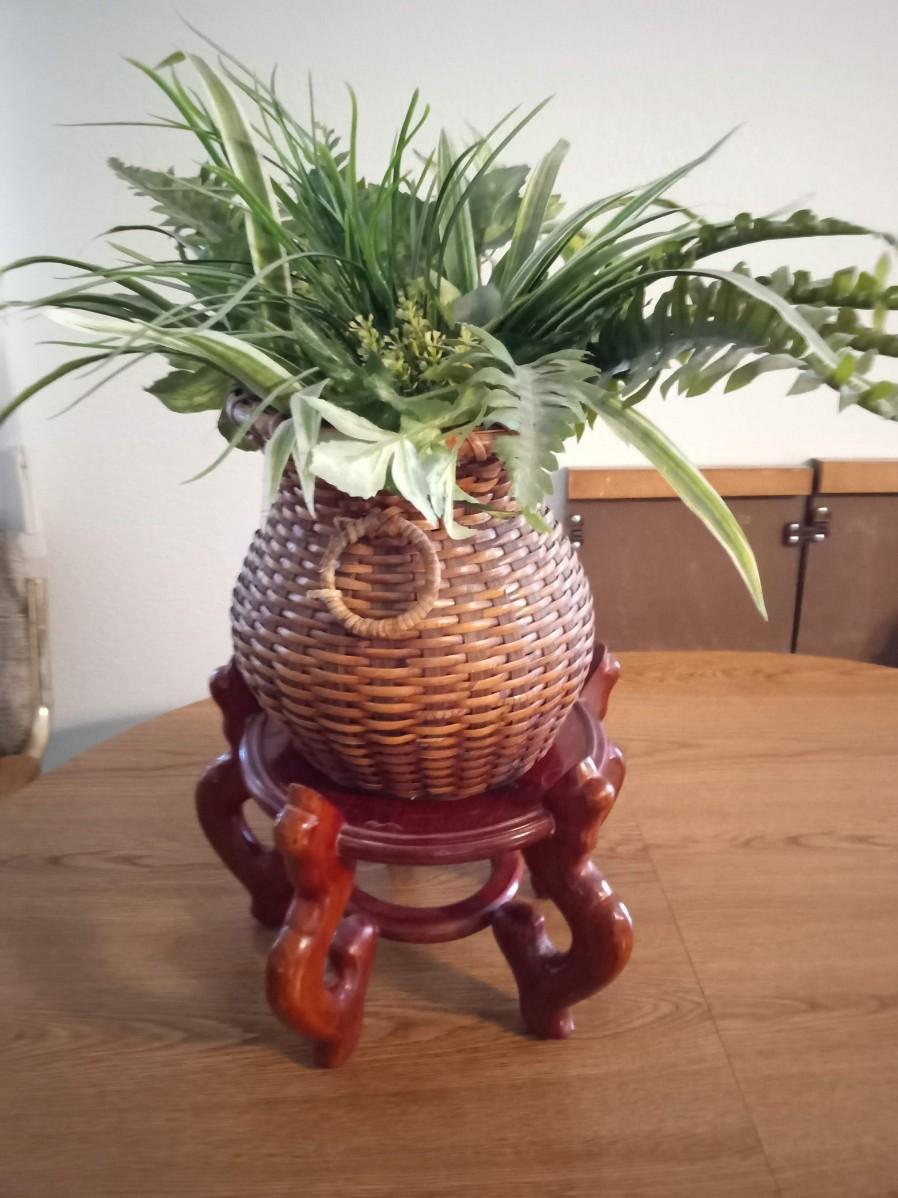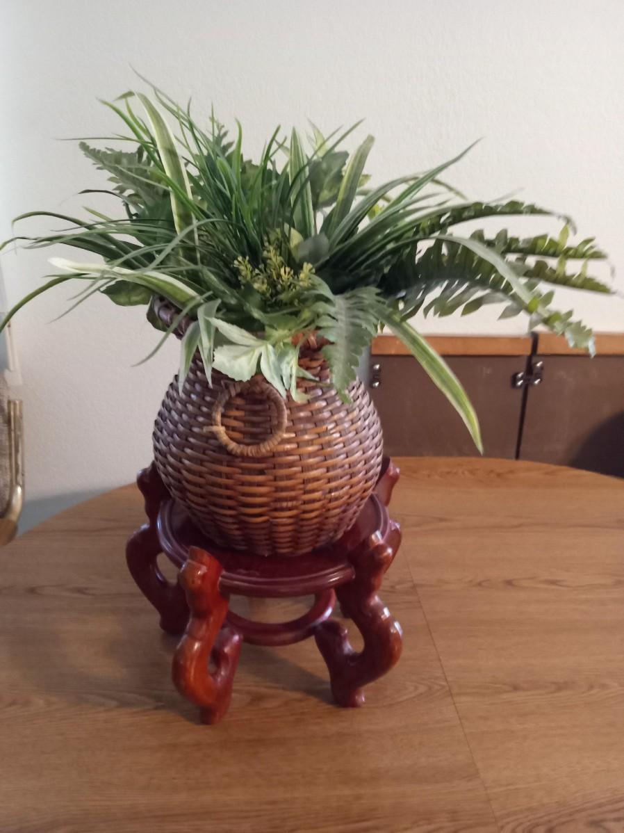 LOT 431  HANGING METAL CANDLE HOLDER, WOODEN PLANT STAND AND FAUX PLANT (Front room)