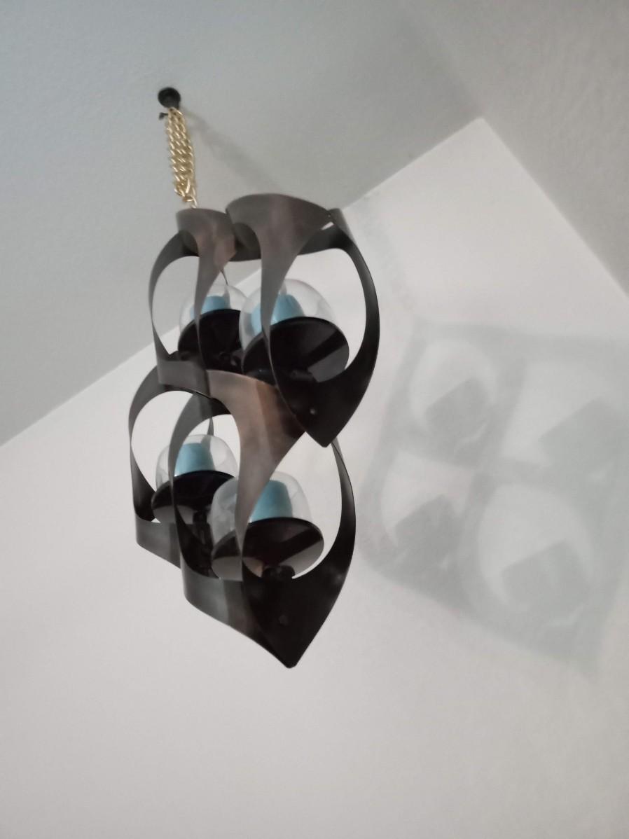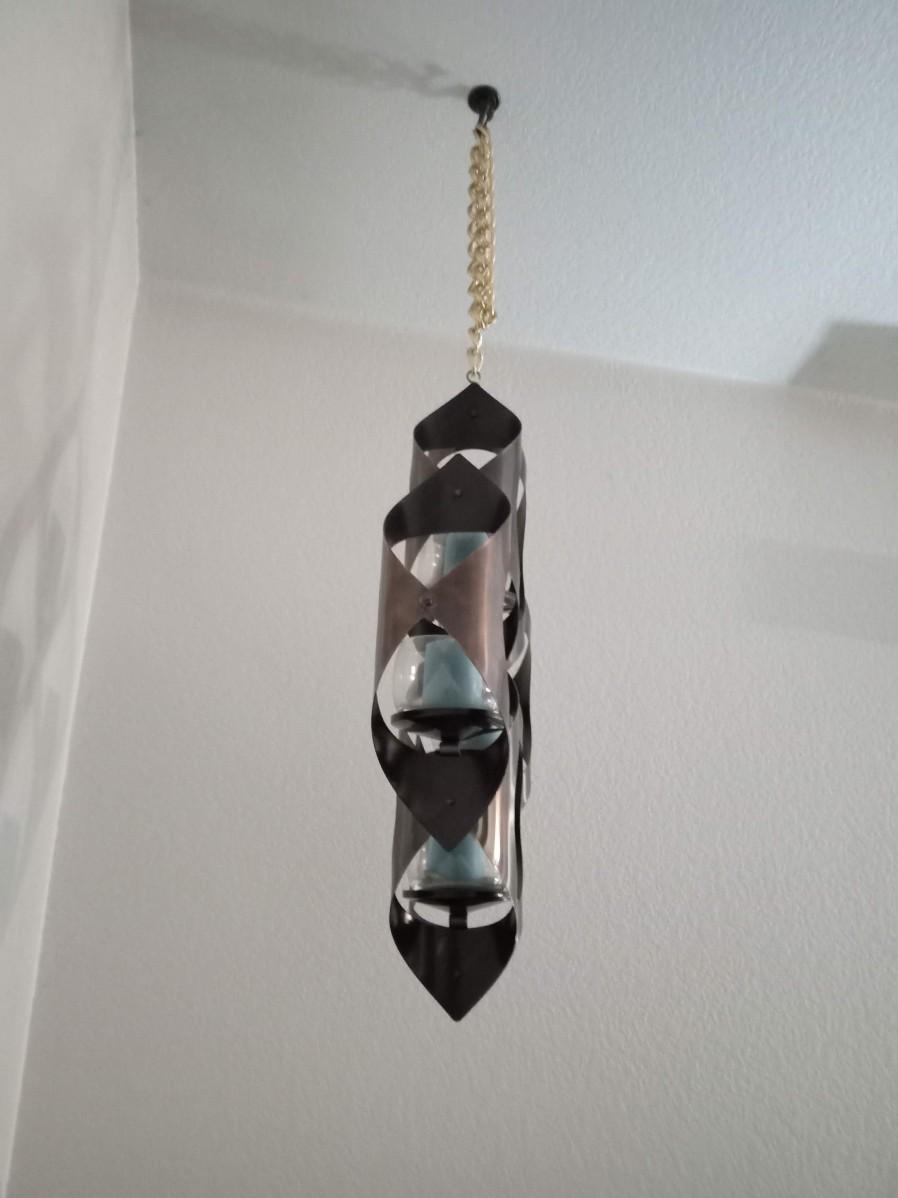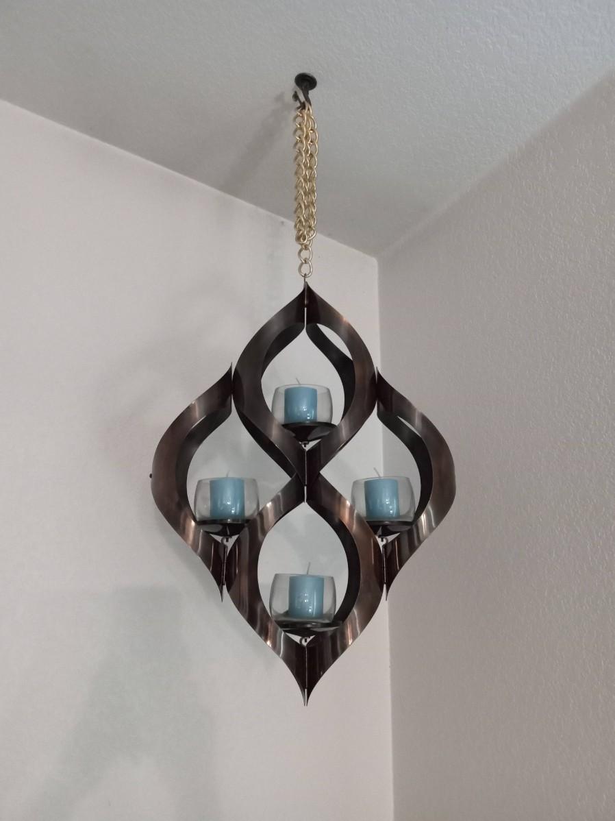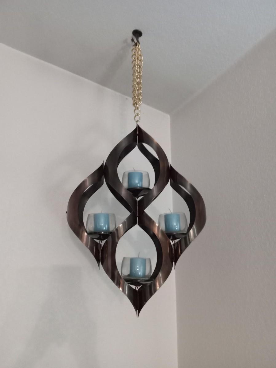 LOT 431 HANGING METAL CANDLE HOLDER, WOODEN PLANT STAND AND FAUX PLANT (Front room)