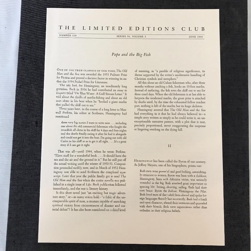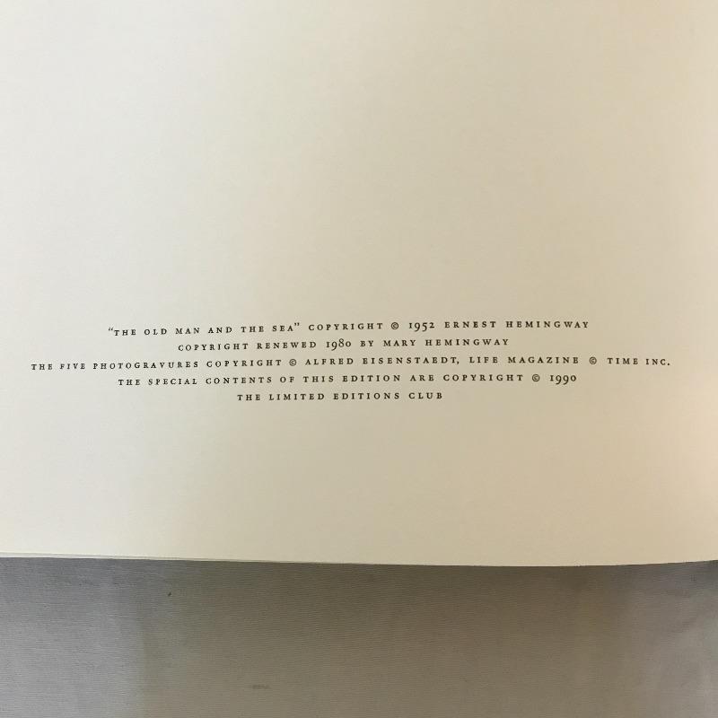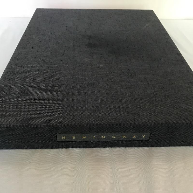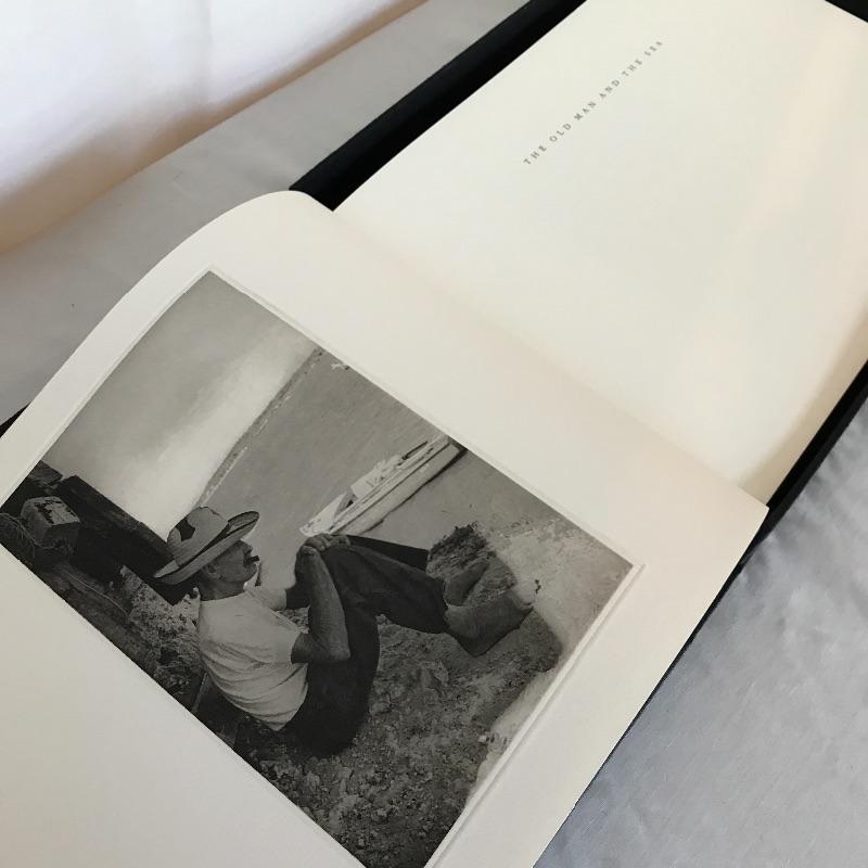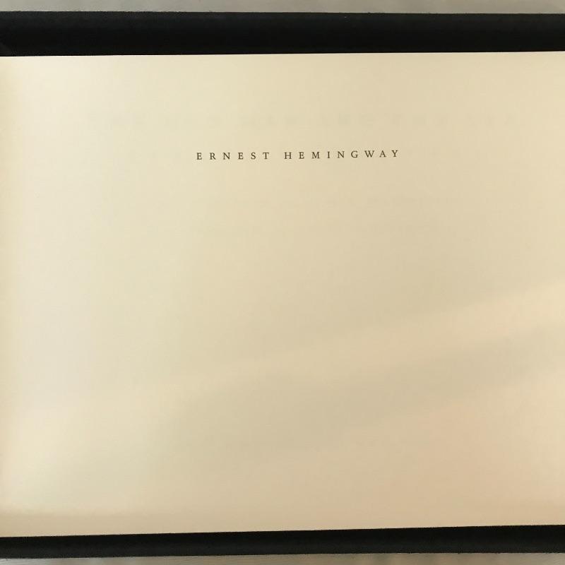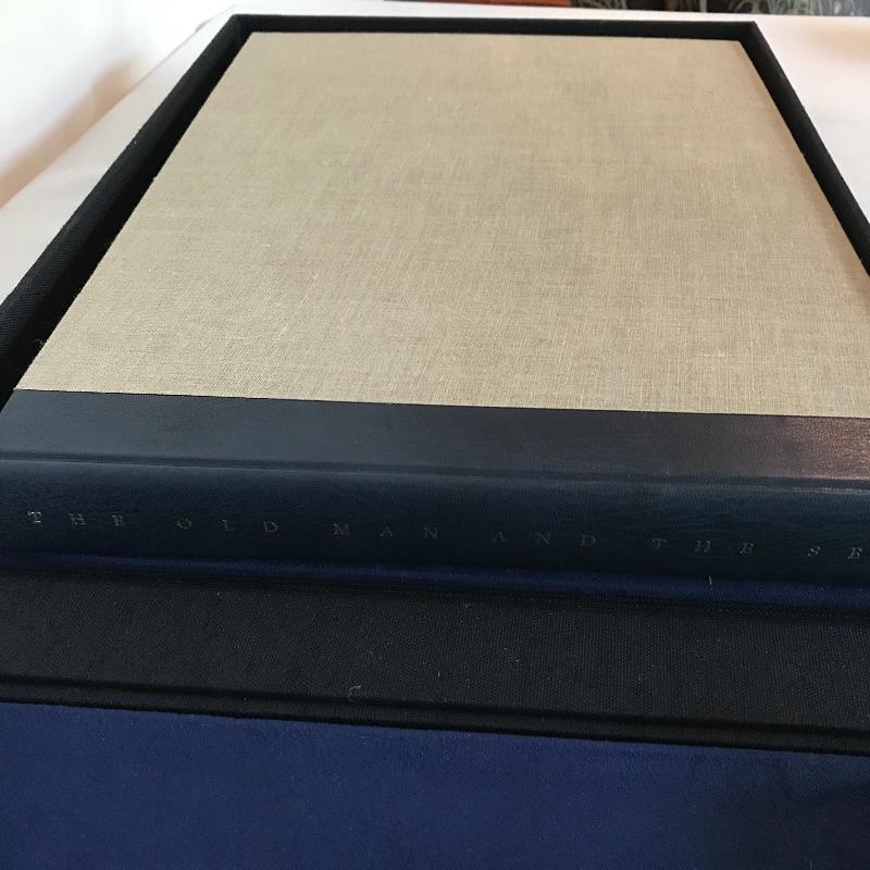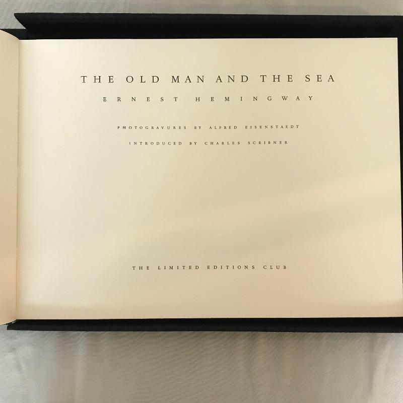 Gorgeous Limited Editions Club collectible by Ernest Hemingway. This classic novel comes in a clamshell case and the book has a leather spine and fabric cover that has a lite sun damage. What a better way to catch up on the classics than this lovely version of Old Man and The Sea. Photogravures by Alfred Eisenstaedt. Measures 16.5” x 12.5”. Shipping available.