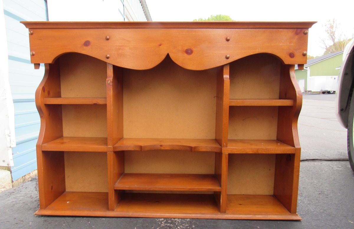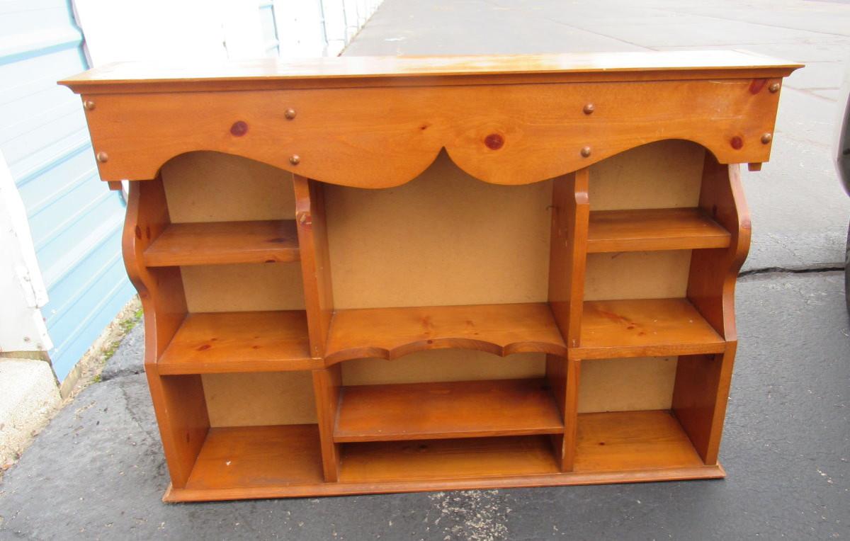 Good shape, Lots of cubbys for your decor. Solid wood front and shelves. Larger size, forgot to measure.