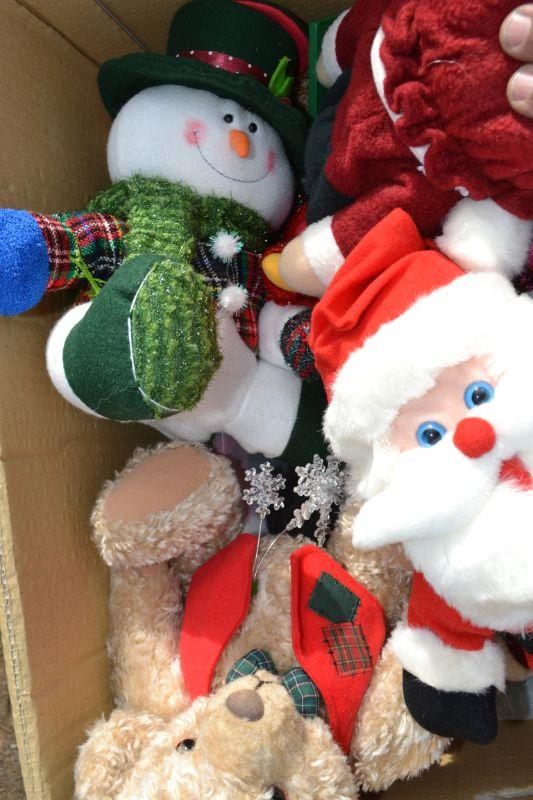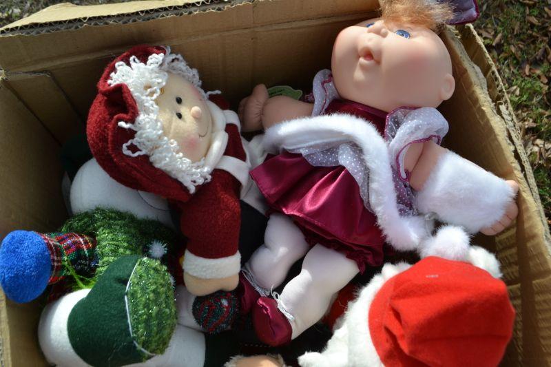 BOX OF HOLIDAY DECOR, CABBAGE PATCH DOLL AND GUND BEAR