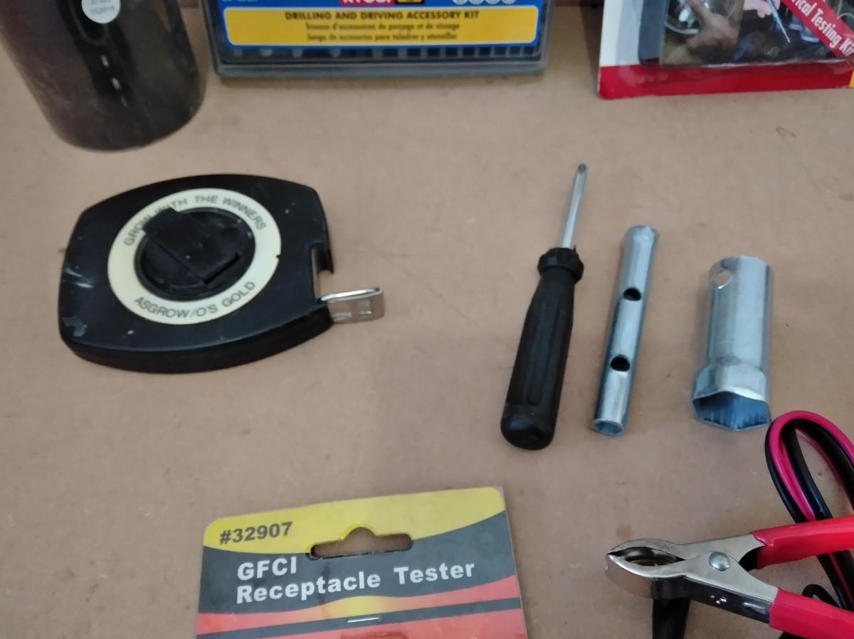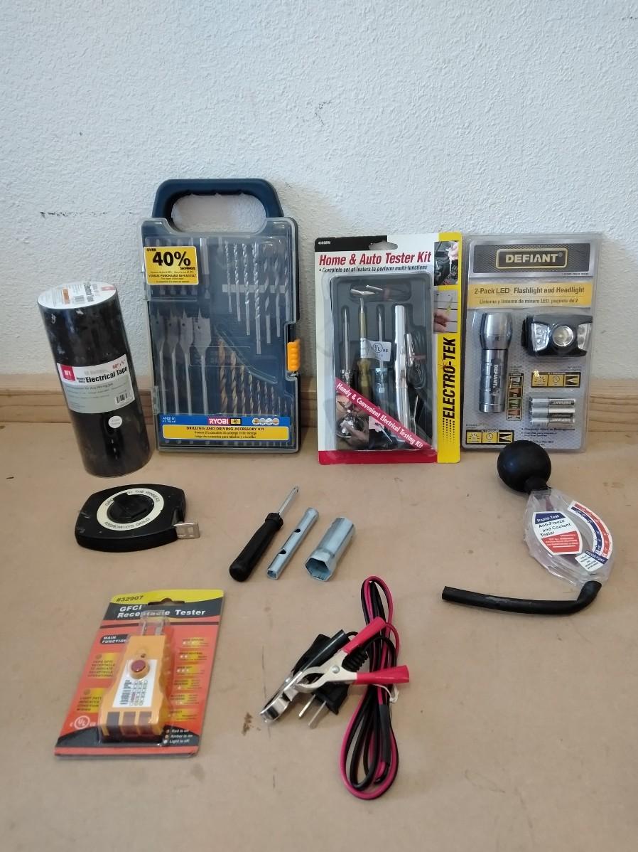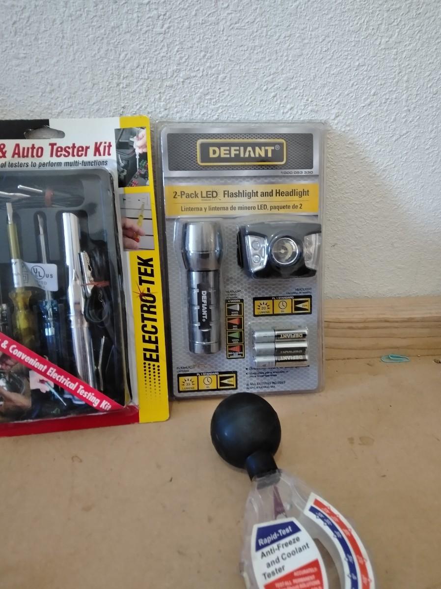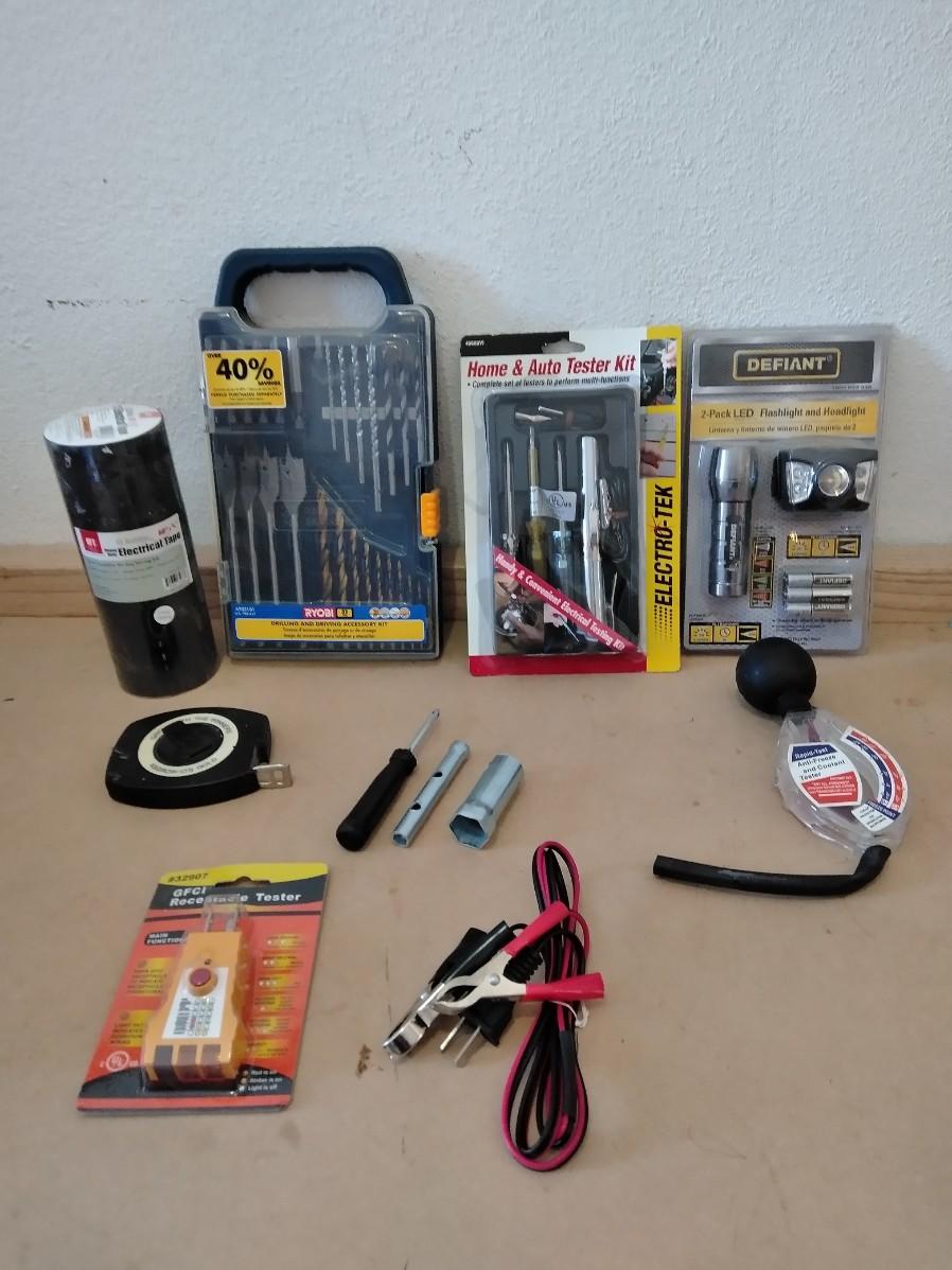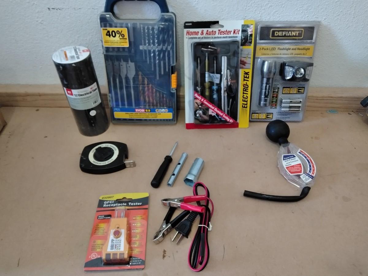 ROLLS OF ELECTRICAL TAPE, HOME AND AUTO TESTER KIT, FLASHLIGHT, ANTIFREEZE TESTER, AND MORE