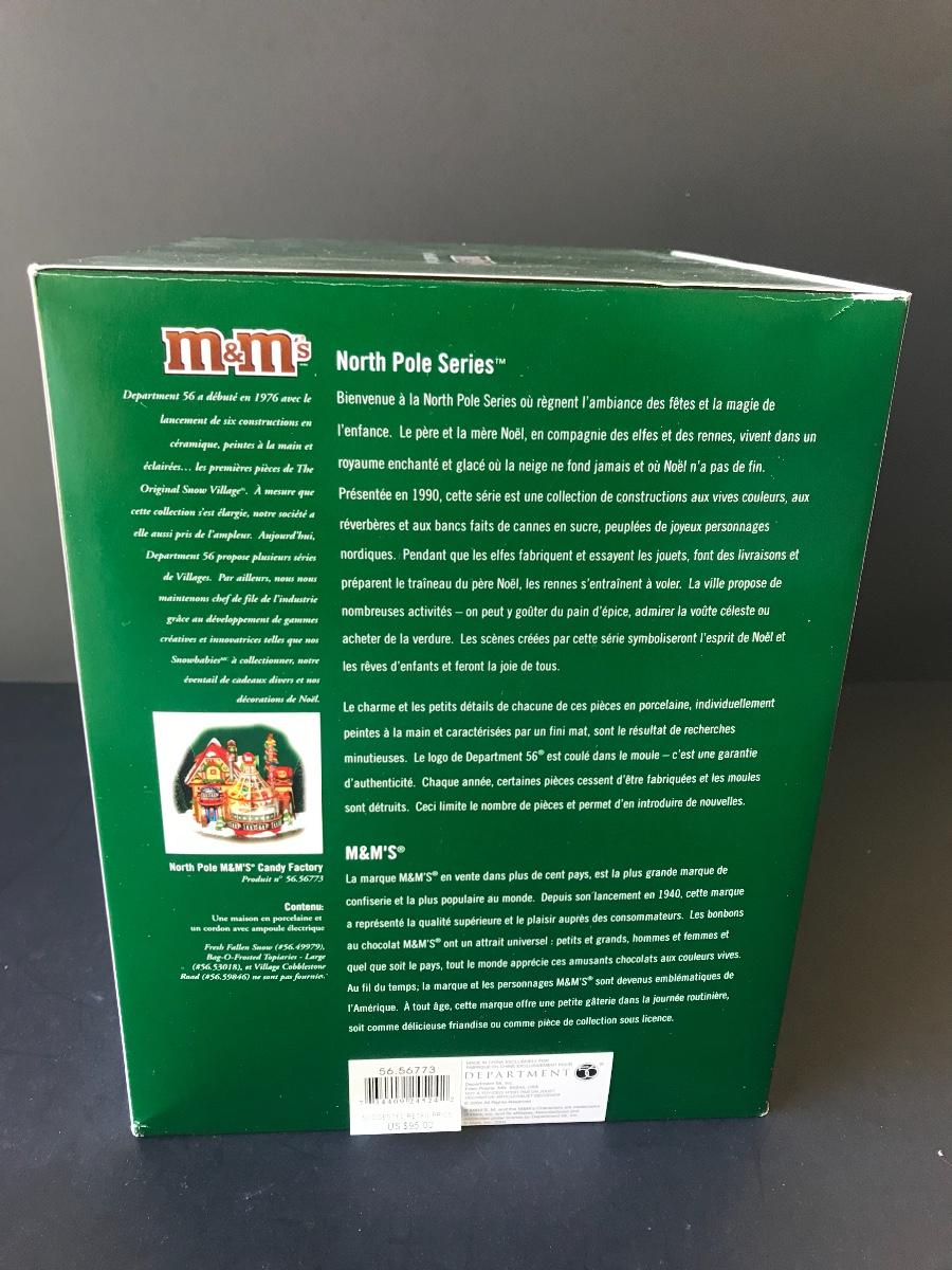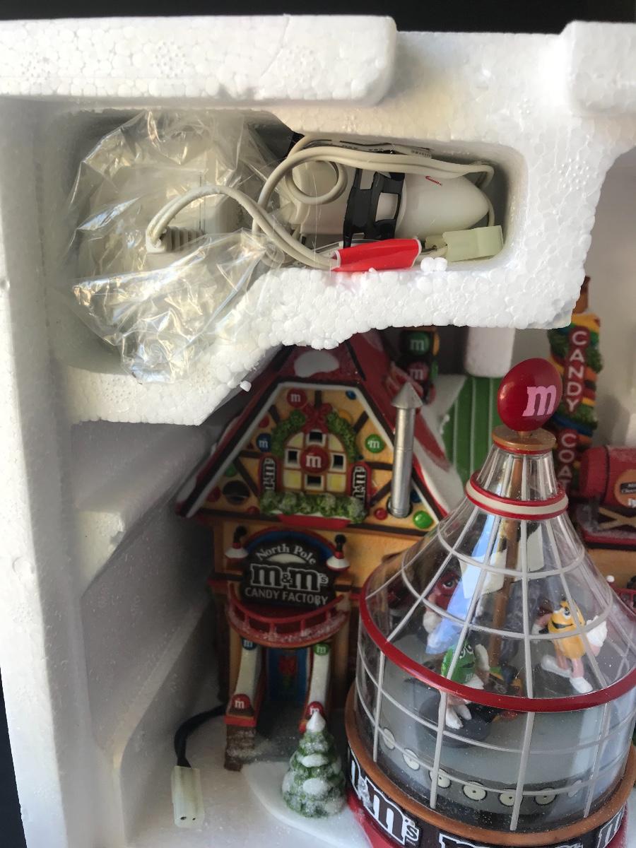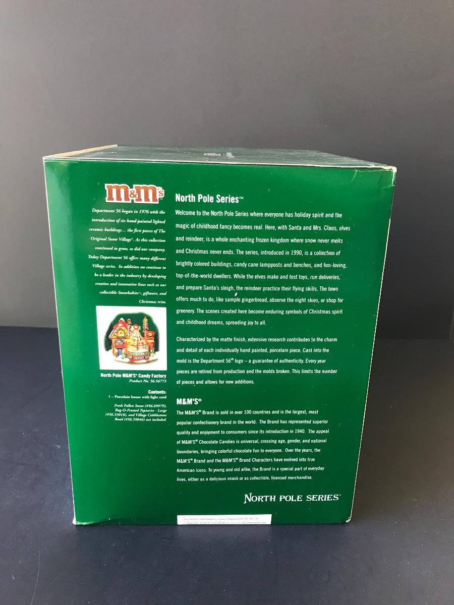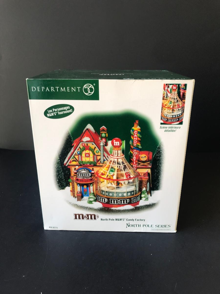 North Pole M&Ms Candy Factory - Department 56 - Christmas Decoration. All Holiday items in this auction are as-seen. The client collected a lot of holiday pieces and some are new in box, some were displayed once and come with original box, and some have been displayed and come with no box. They are all pre-owned in some fashion and have been stored in an attic or on shelf in library. Please see all pictures. The pictures show condition, measurements if taken, and what is included in the lot. Due to the large amount that we photograph and the time frame, we are not always able to take measurements. All items unless noted, are pre-owned and have been used. Thank you