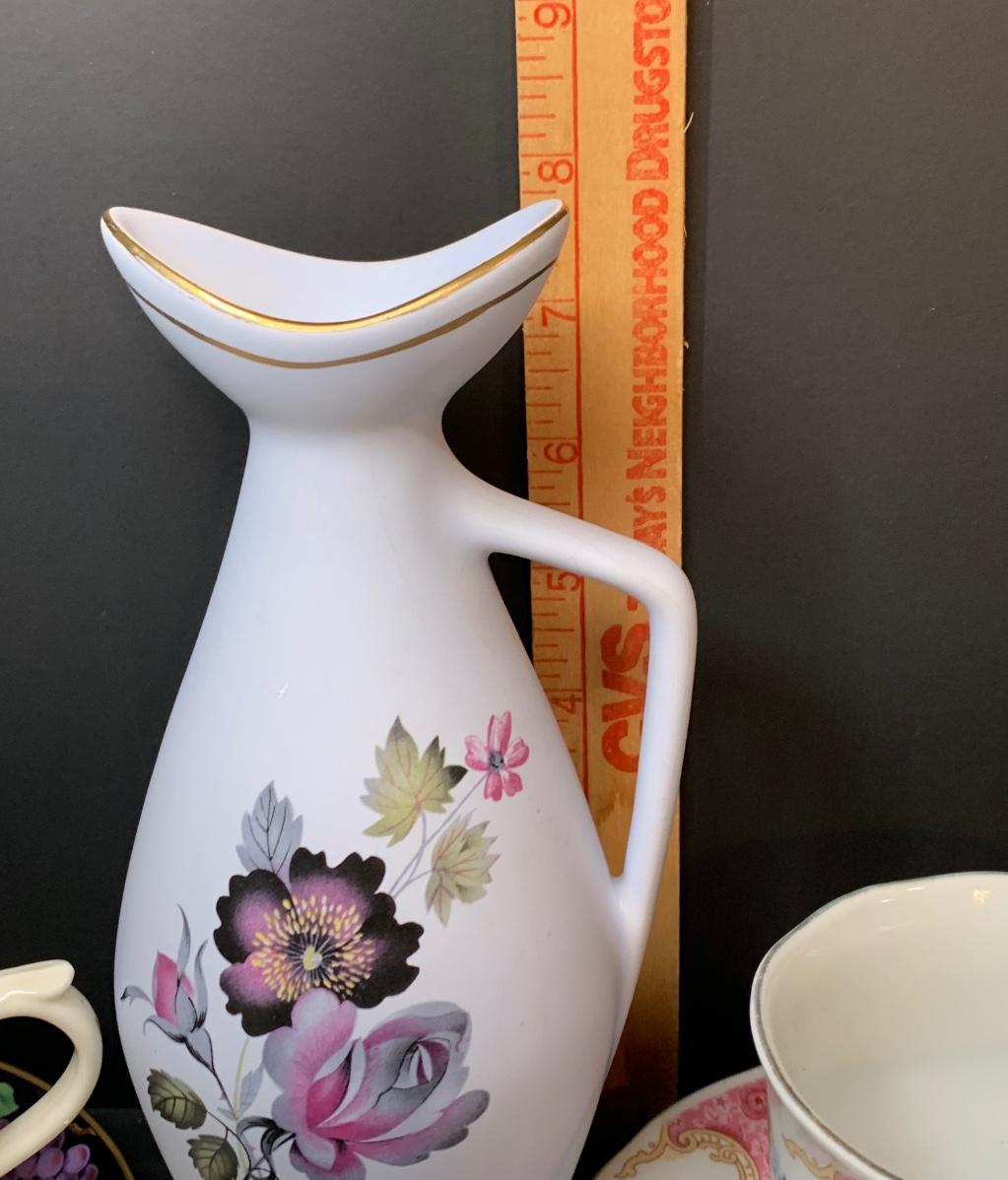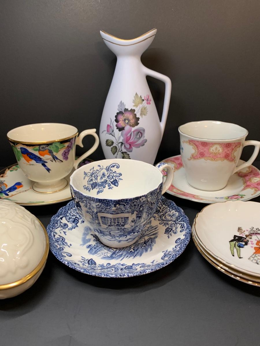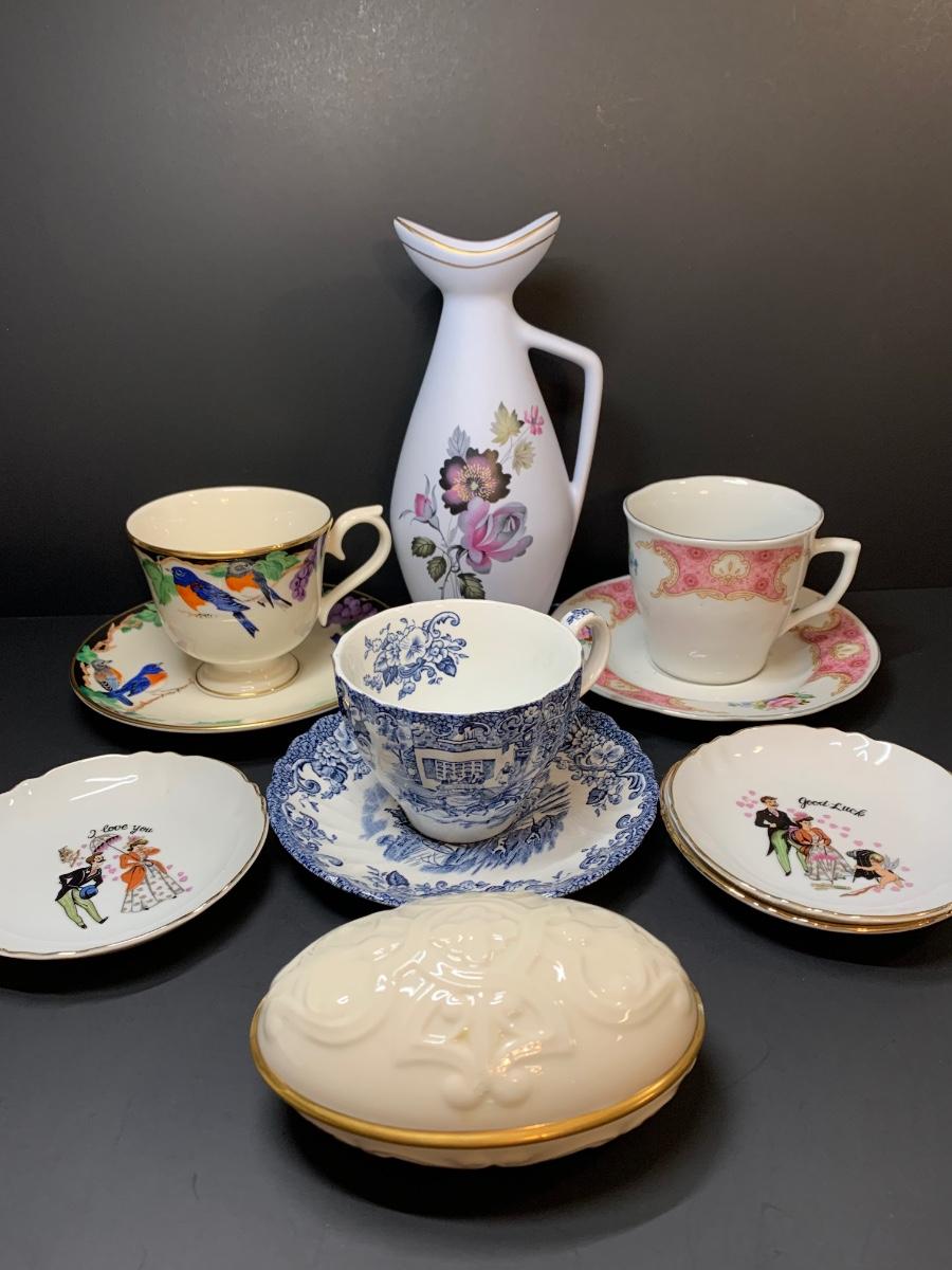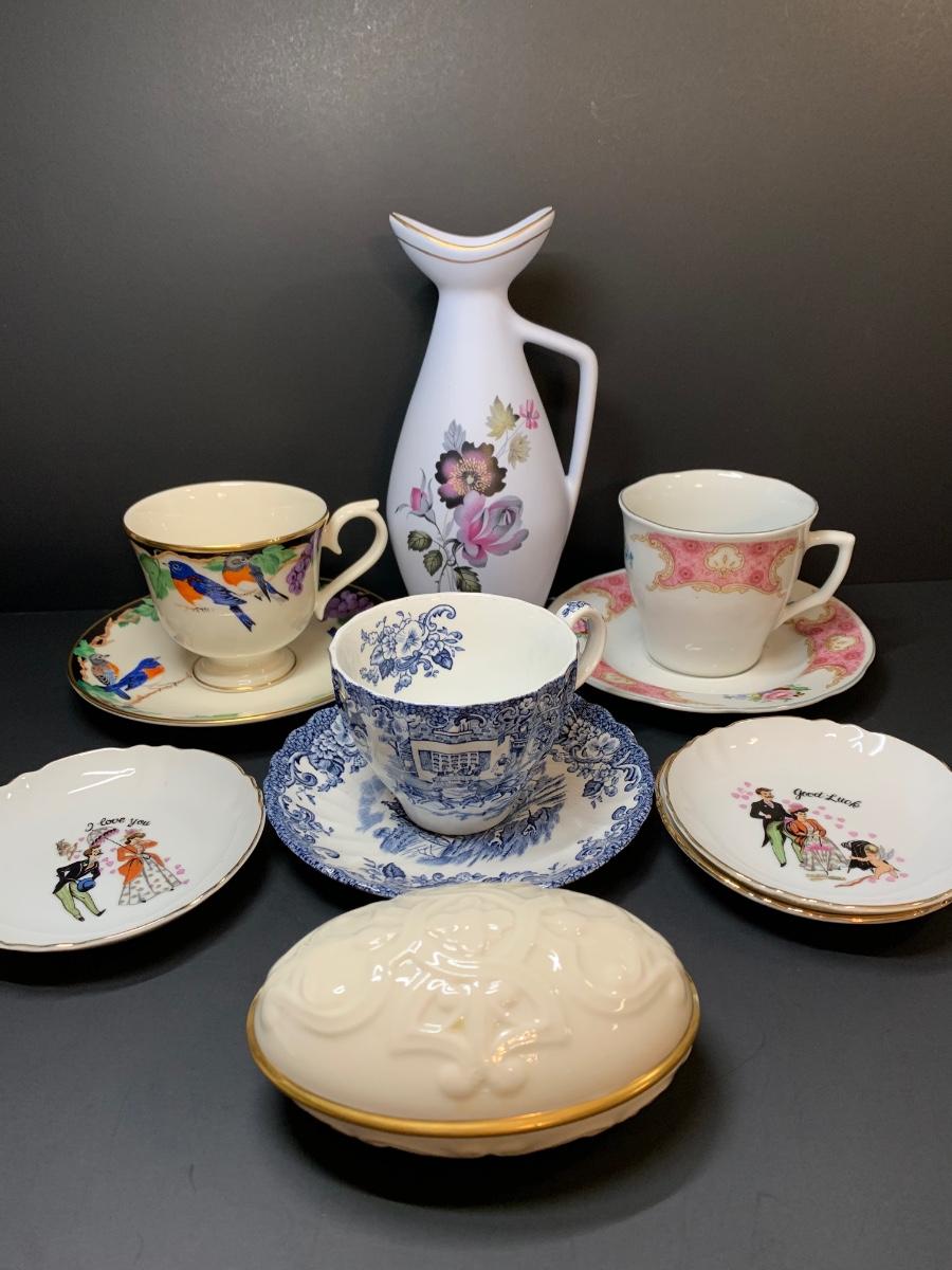 Beautiful collection of tea cups, a Karin Holland floral Gouda vase with roses and gold trim. , trinket dishes and trinket Lenox egg. Please see all pictures as they are the best representation of the items. The pictures show condition, measurements if taken, and what is included in the lot. Due to the large amount that we photograph and the time frame, we are not always able to take measurements. All items unless noted, are pre-owned and have been used. If you purchased furniture, you must bring help. We do not allow one person to carry large furniture out on their own. Bring help, tools and a truck for the safety of our client’s homes, and your personal safety. Company policy. Thank you.