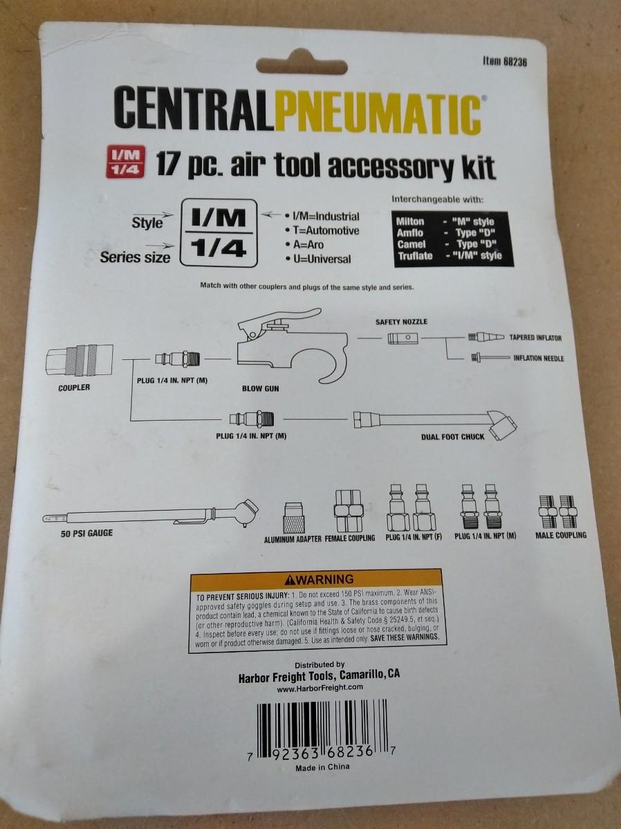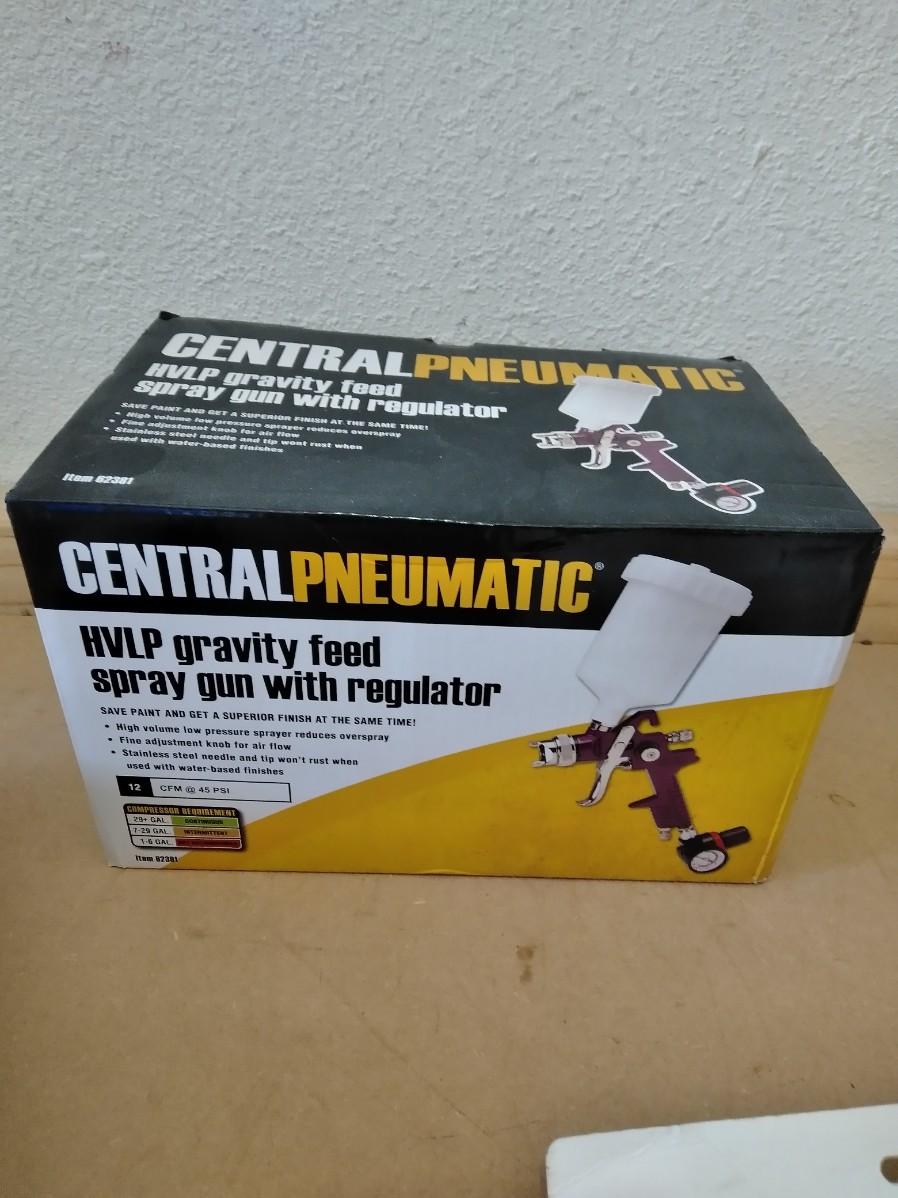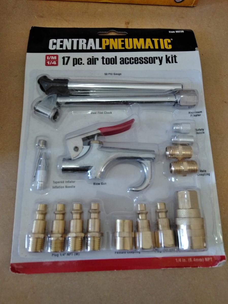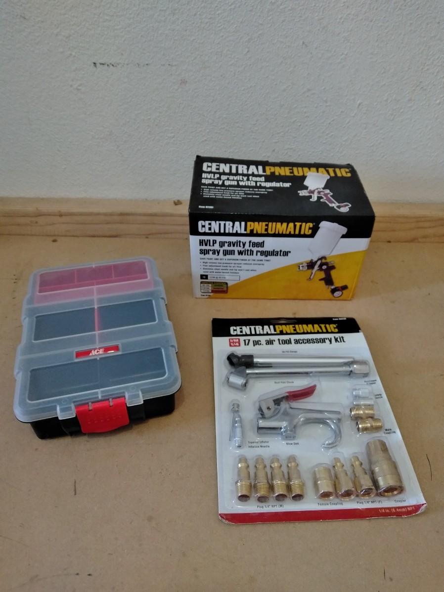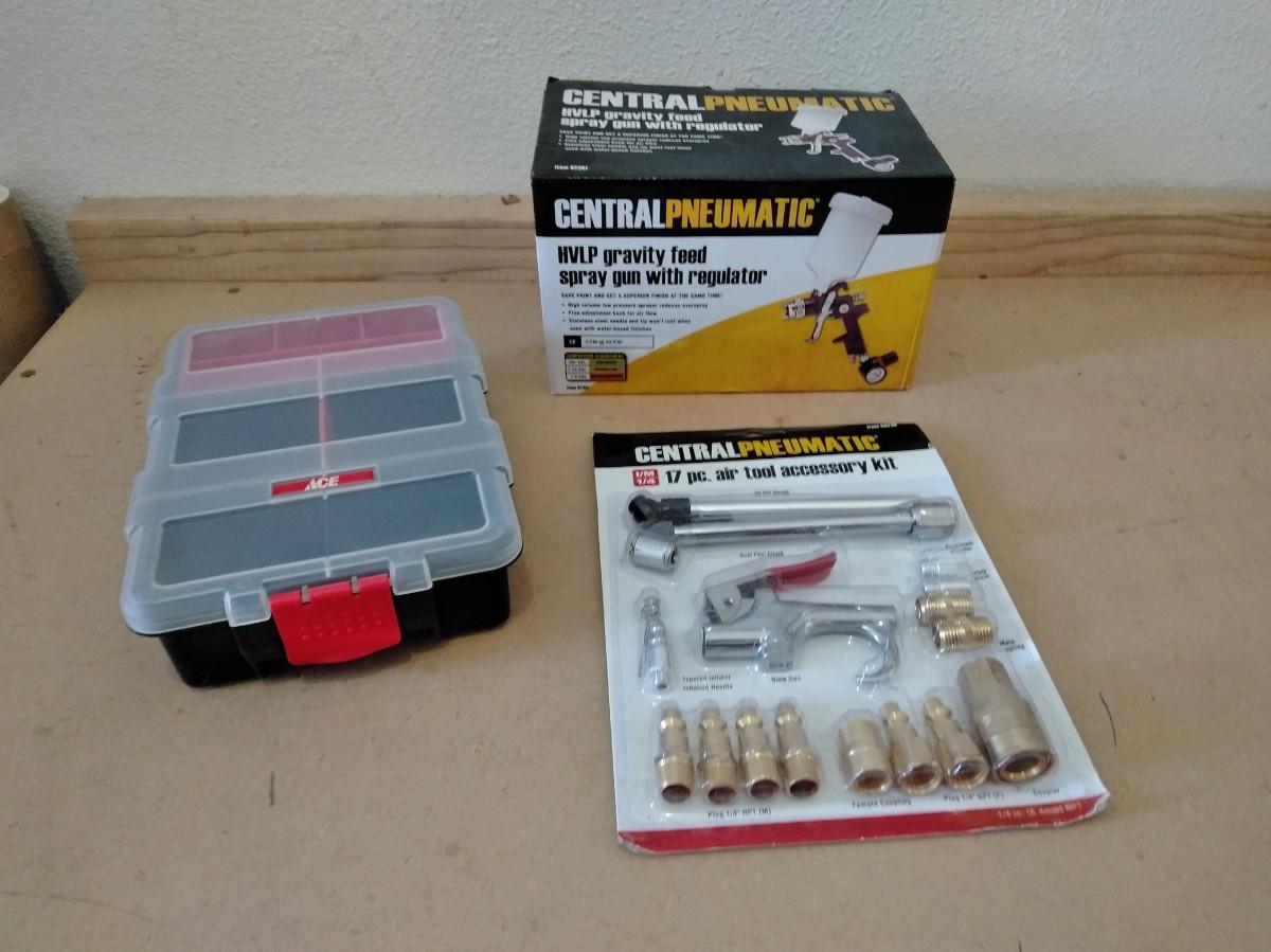 CENTRAL PNEUMATIC SPRAY GUN AND AIR TOOL ACCESSORIES KIT WITH ORGANIZING BOX.