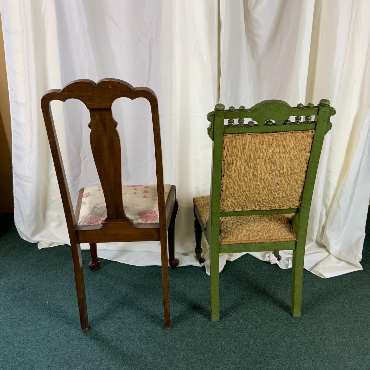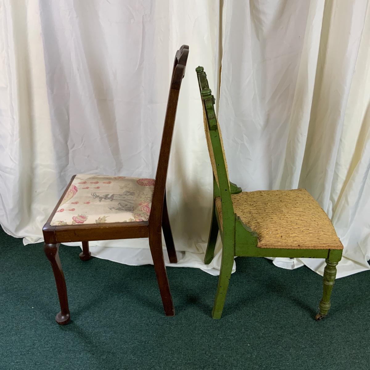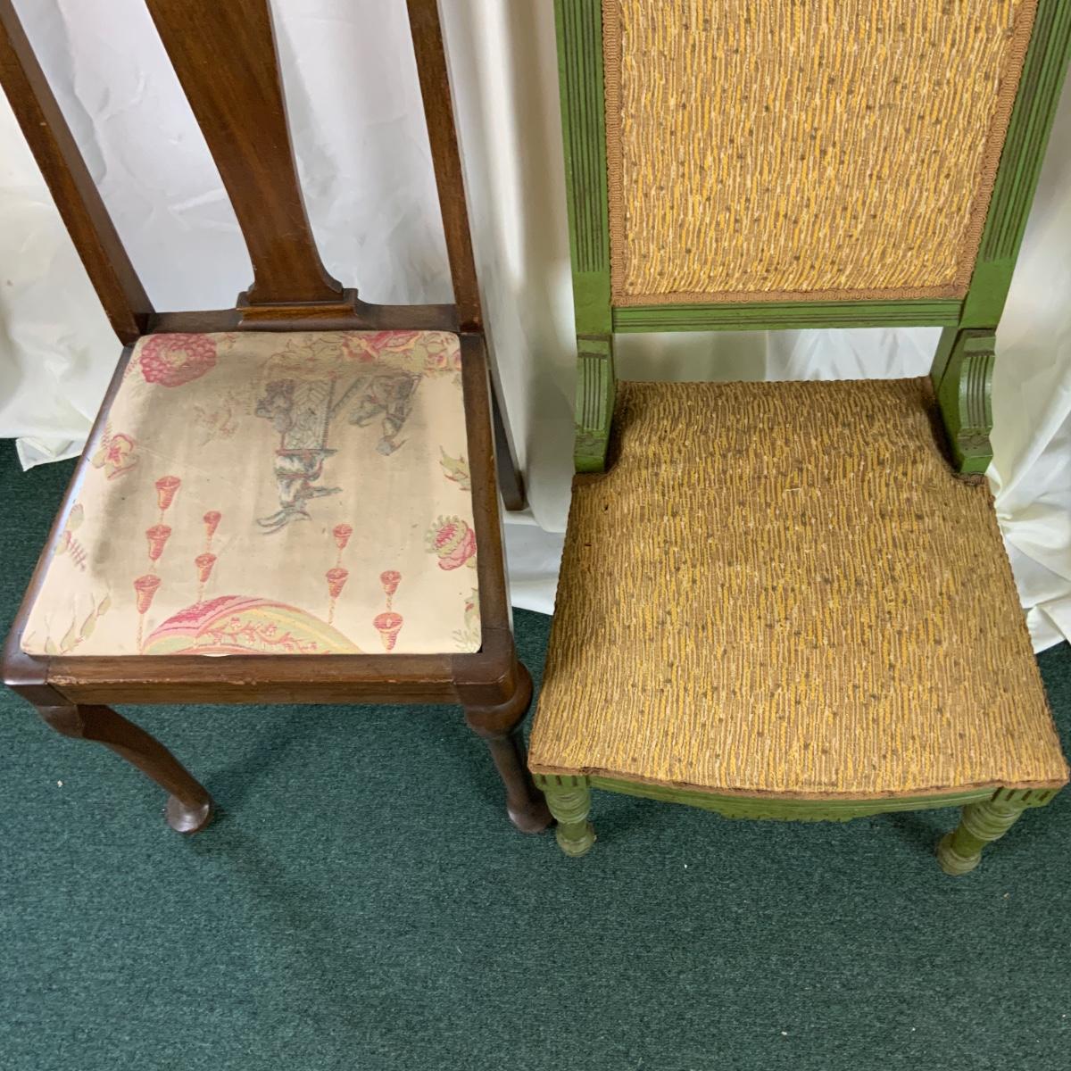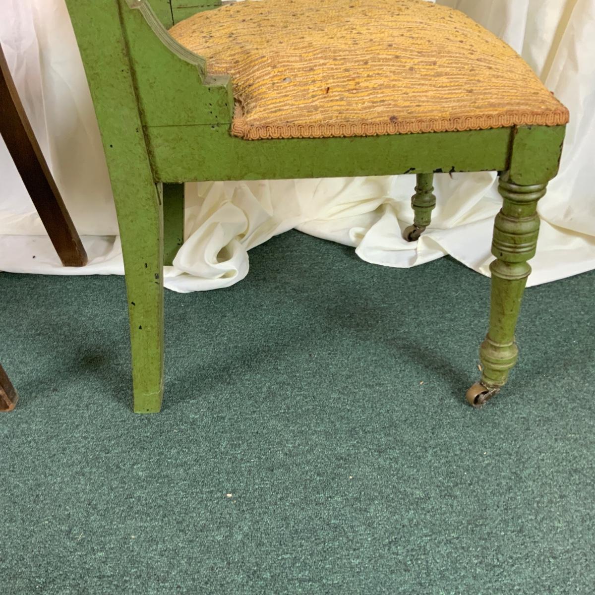 Mis-Matched Chair set with green parlor chair. Green chair has casters on the front two legs. //::\\ Please see photos for details and condition. No attempt has been made to hide any imperfections. All items listed in this auction are warehouse items, and need to be cleaned. A majority of the items need restoration as well. All items are sold AS IS and WITHOUT GUARANTEE. If you are uncertain about an item, DO NOT BID. Due to the nature of this online auction in-person inspection is HIGHLY recommended. All Sales are FINAL. Pick Up Times are FIRM. Please confirm with your own schedule that you can pick up in the scheduled times listed in the Terms and Conditions. Any questions please message the auctioneer. DO NOT Contact The Harp Gallery.