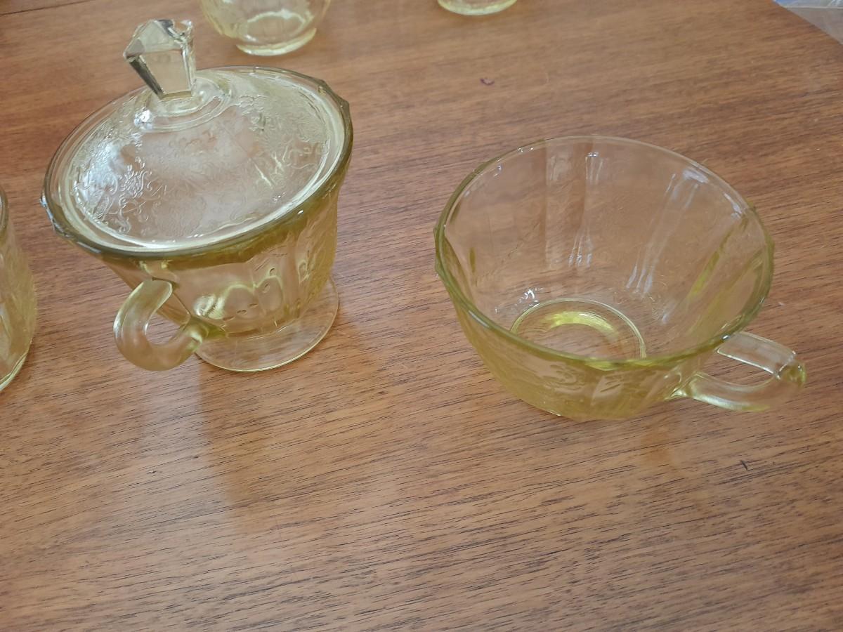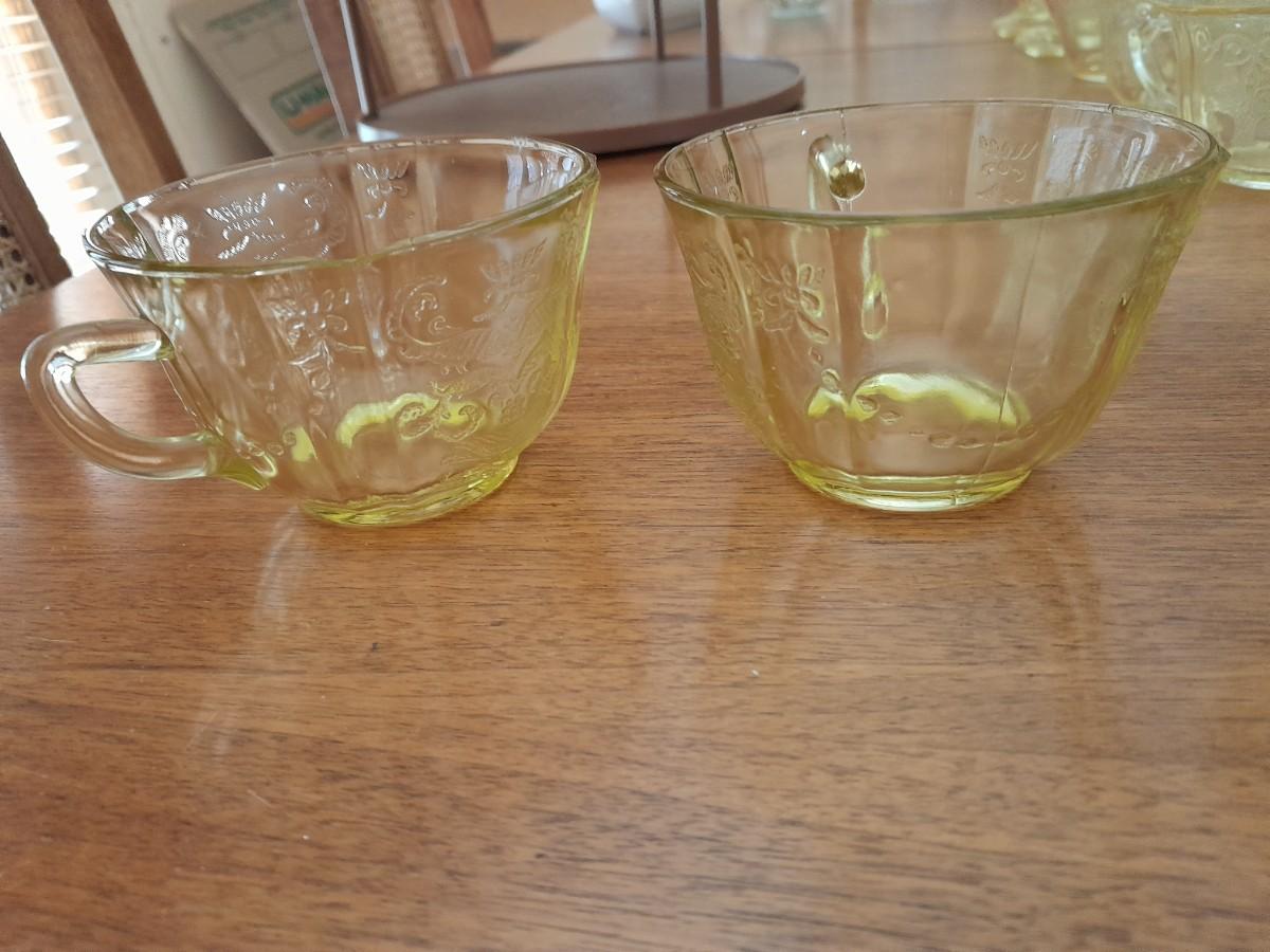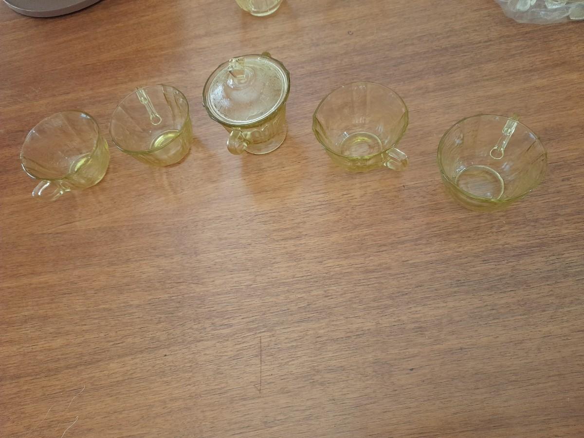 YELLOW DEPRESSION GLASS TEACUPS AND LIDDED SUGAR JAR