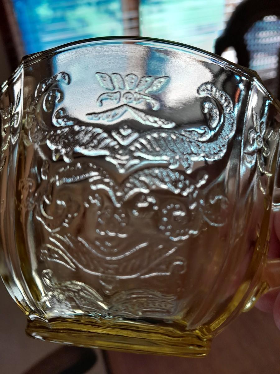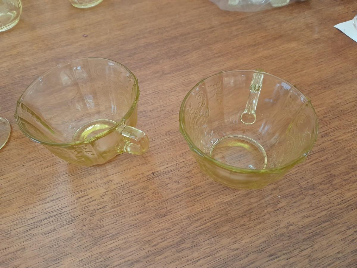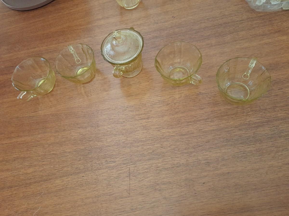 YELLOW DEPRESSION GLASS TEACUPS AND LIDDED SUGAR JAR