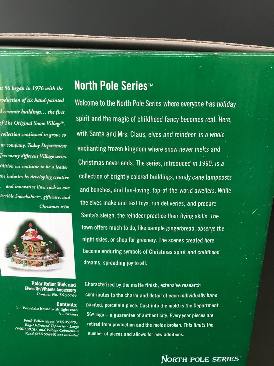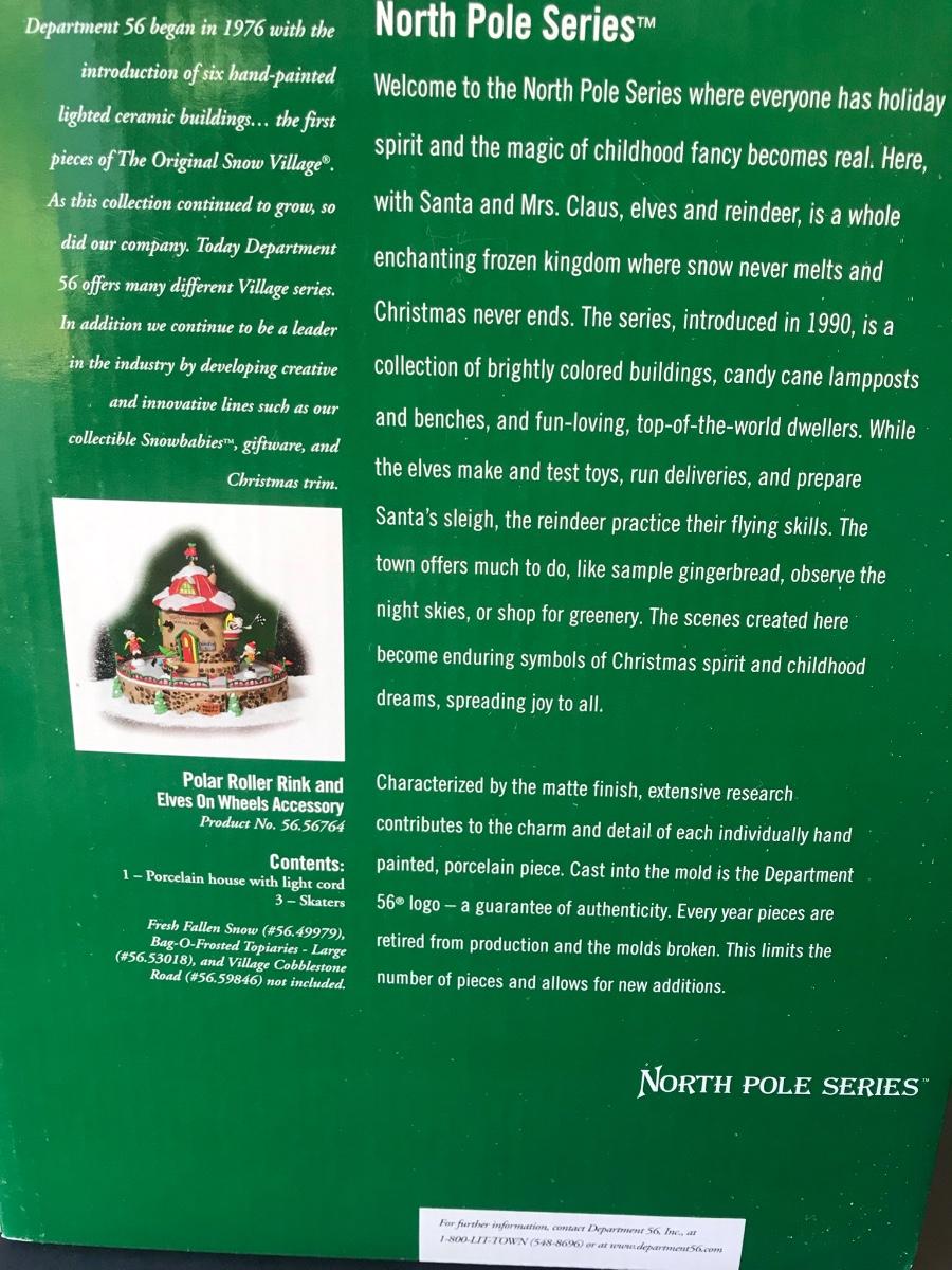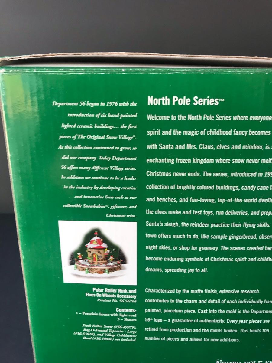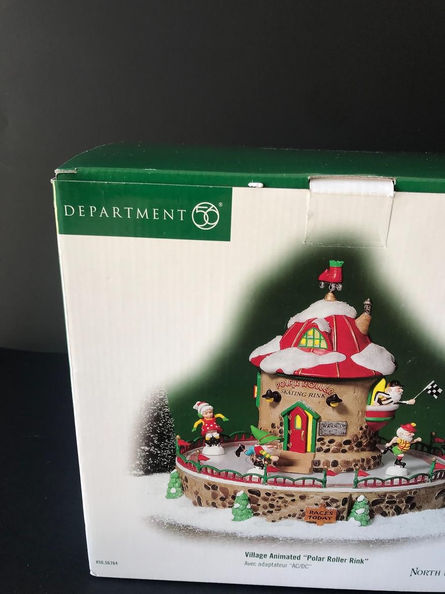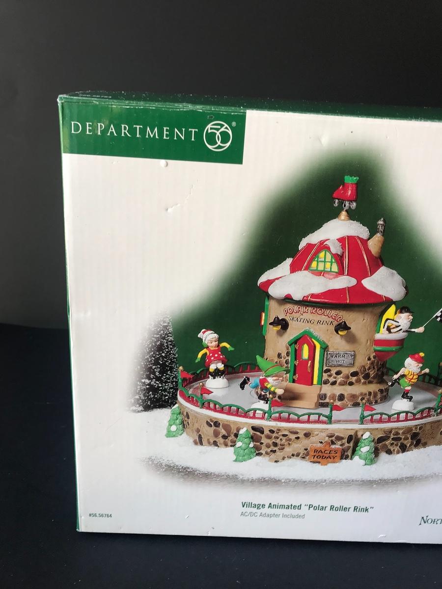 Polar Roller Rink - Department 56 - Christmas Decoration. All Holiday items in this auction are as-seen. The client collected a lot of holiday pieces and some are new in box, some were displayed once and come with original box, and some have been displayed and come with no box. They are all pre-owned in some fashion and have been stored in an attic or on shelf in library. Please see all pictures. The pictures show condition, measurements if taken, and what is included in the lot. Due to the large amount that we photograph and the time frame, we are not always able to take measurements. All items unless noted, are pre-owned and have been used. Thank you
