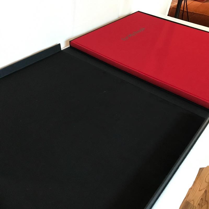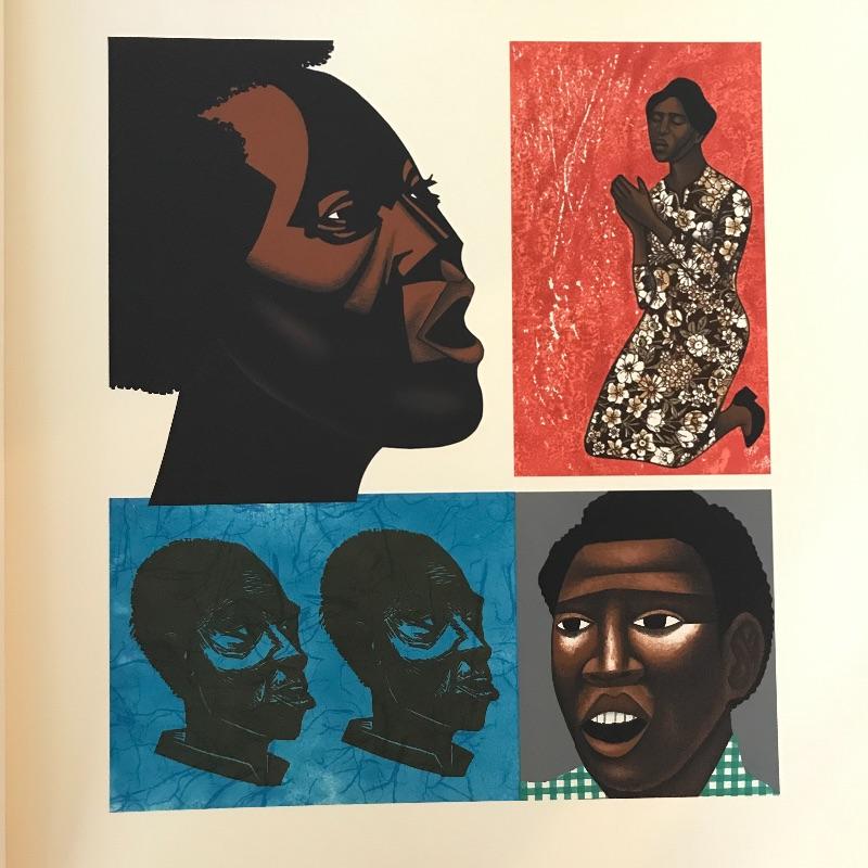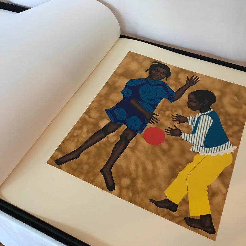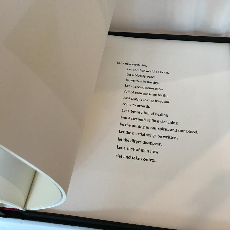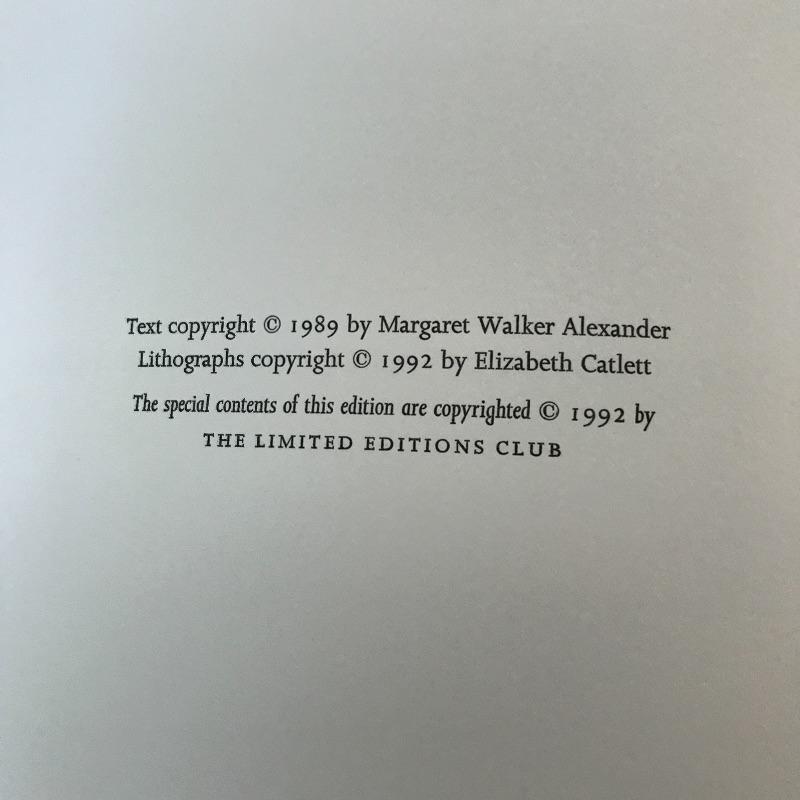 Measuring 23” x 19.5” this large book makes a statement. Margaret Walker’s book called For My People is published by the Limited Editions Club. This incredible piece of art includes colorful lithographs by Elizabeth Catlett. The book is in excellent condition in a bright red fabric. The clamshell case has some sun damage with lightening on the spine. Shipping available.