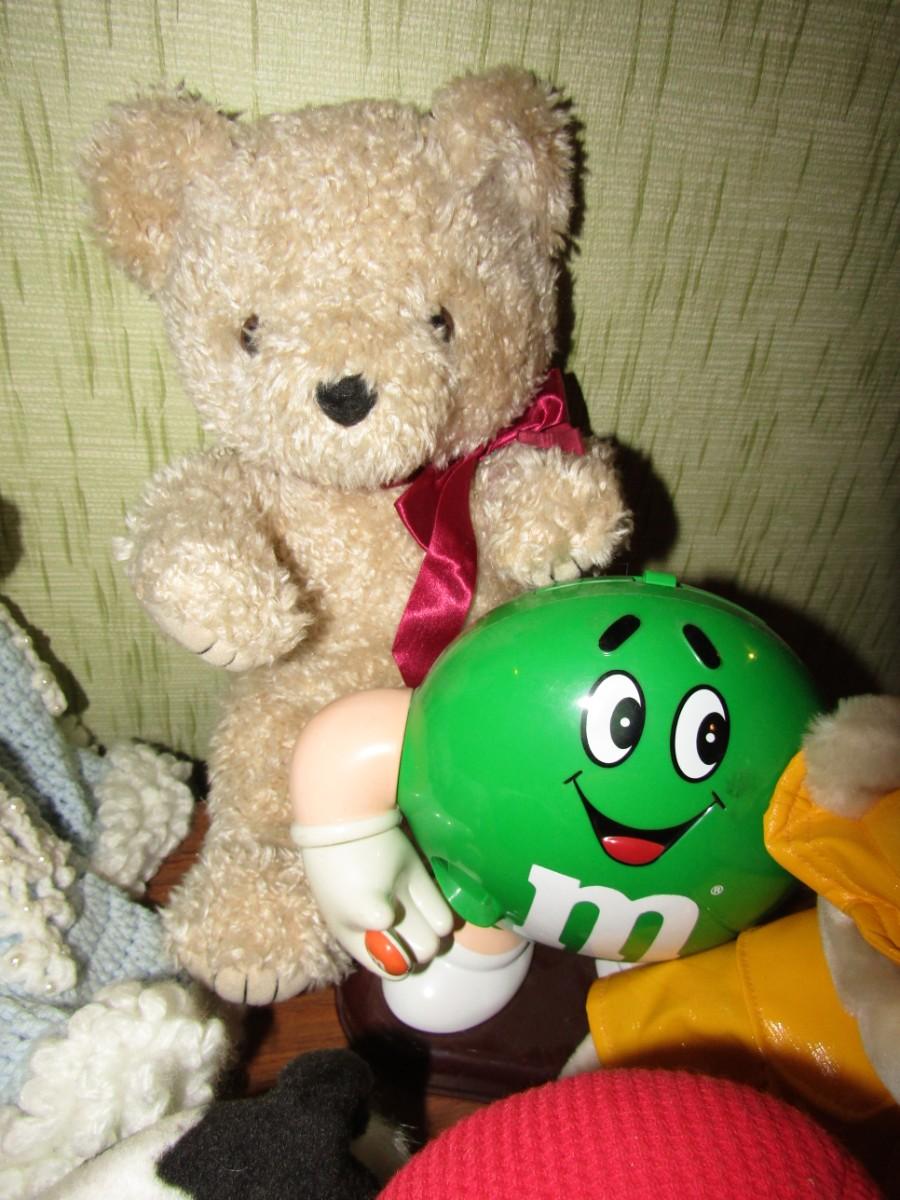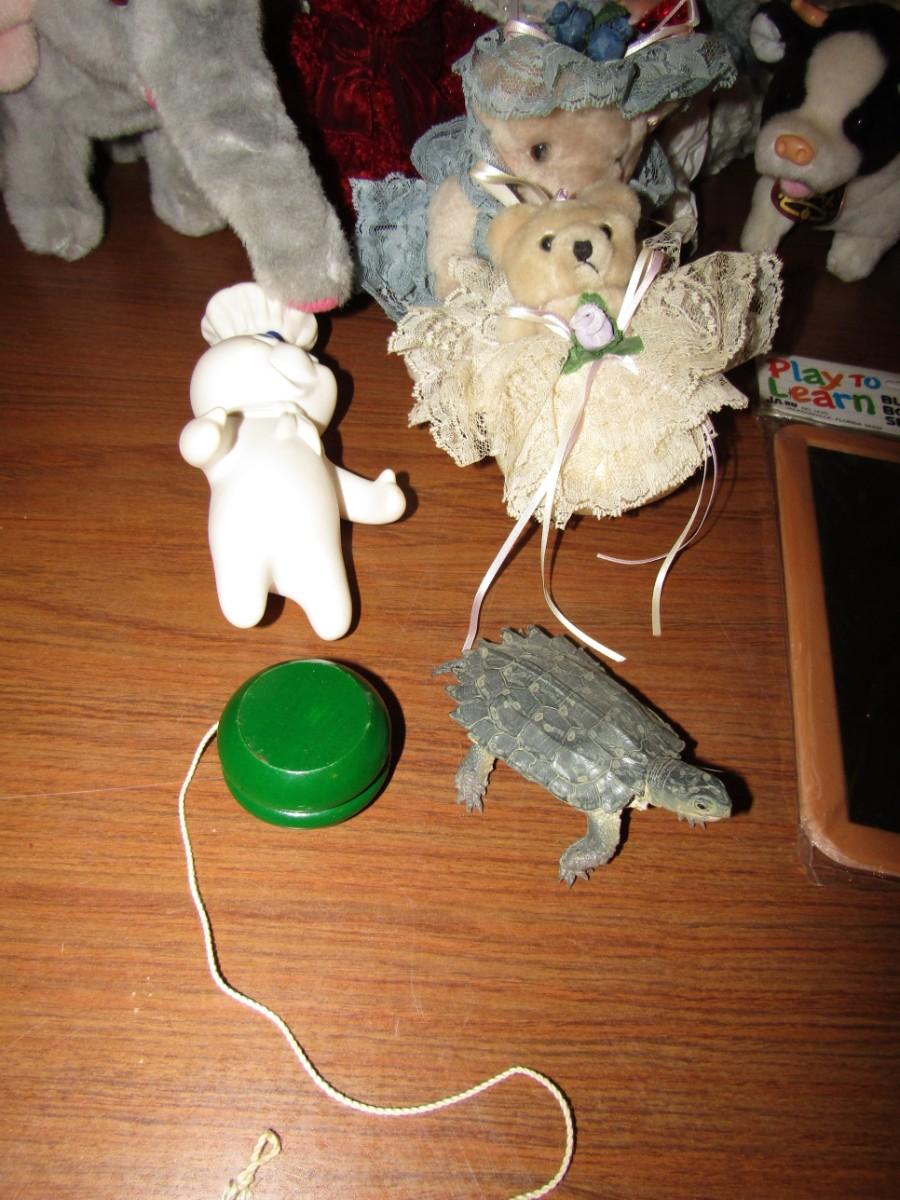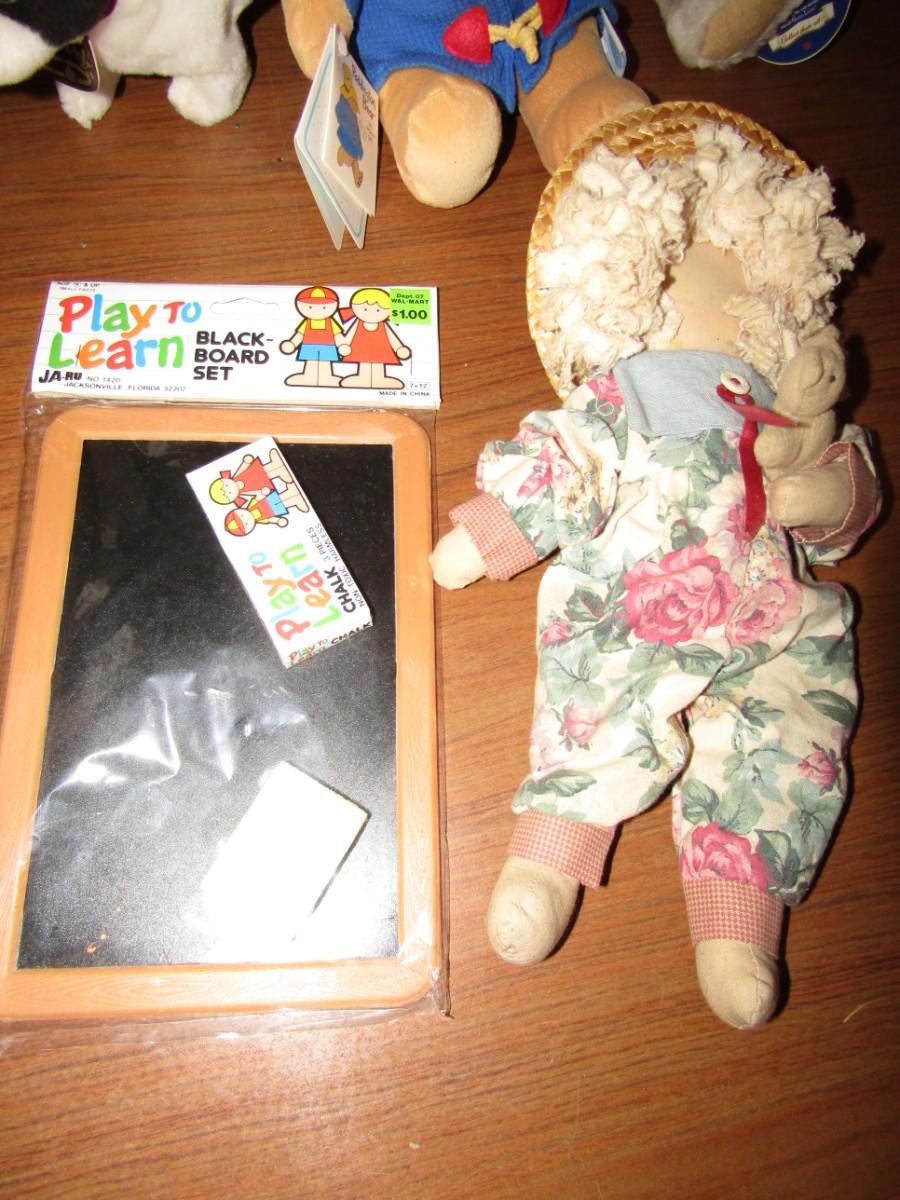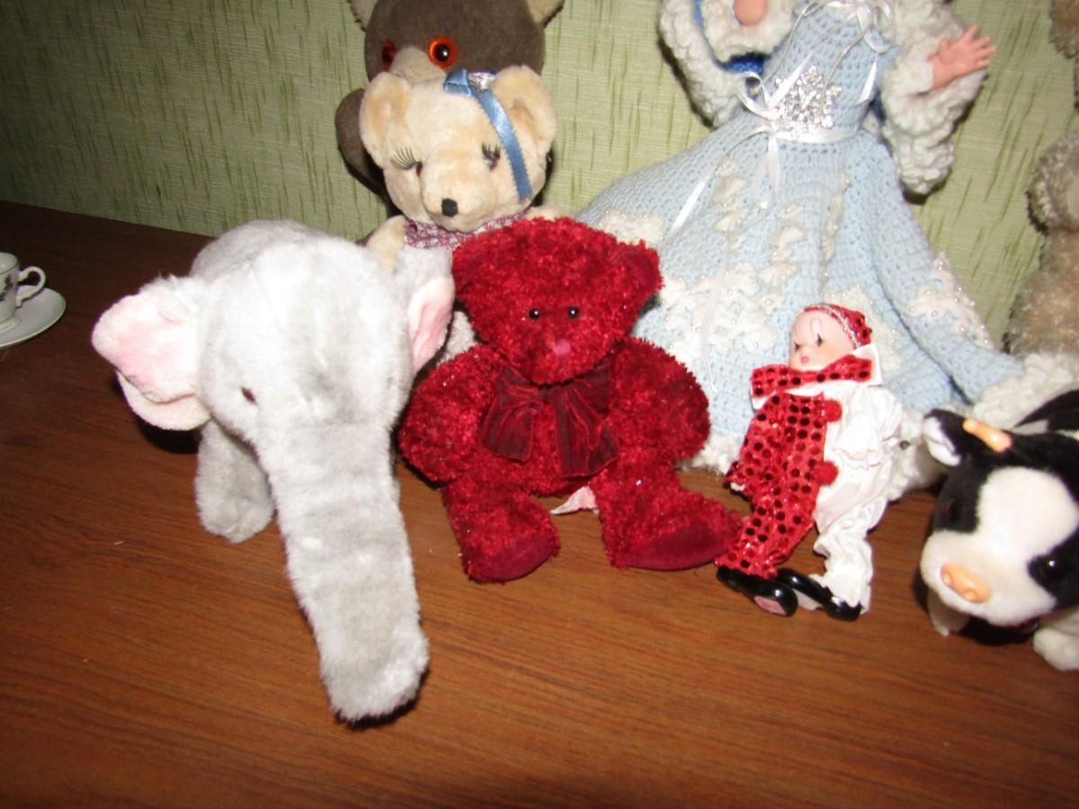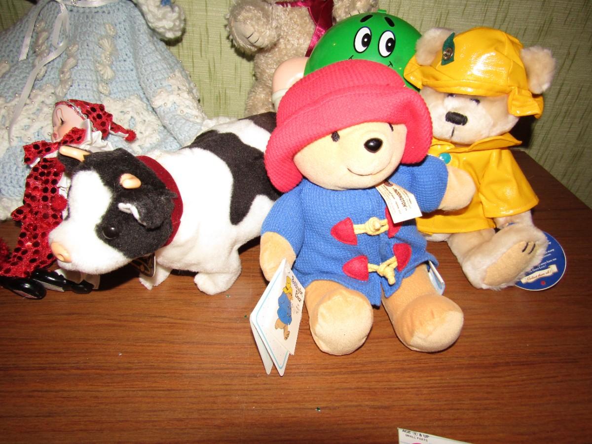 PADDINGTON BEAR, VINTAGE TEDDY BEAR, BATTERY OPERATED ELEPHANT, & COW, HANDMADE DOLL DRESS AND DOLL, YO YO AND MORE