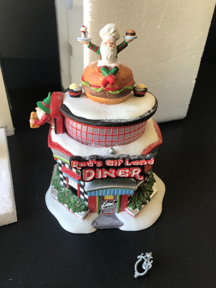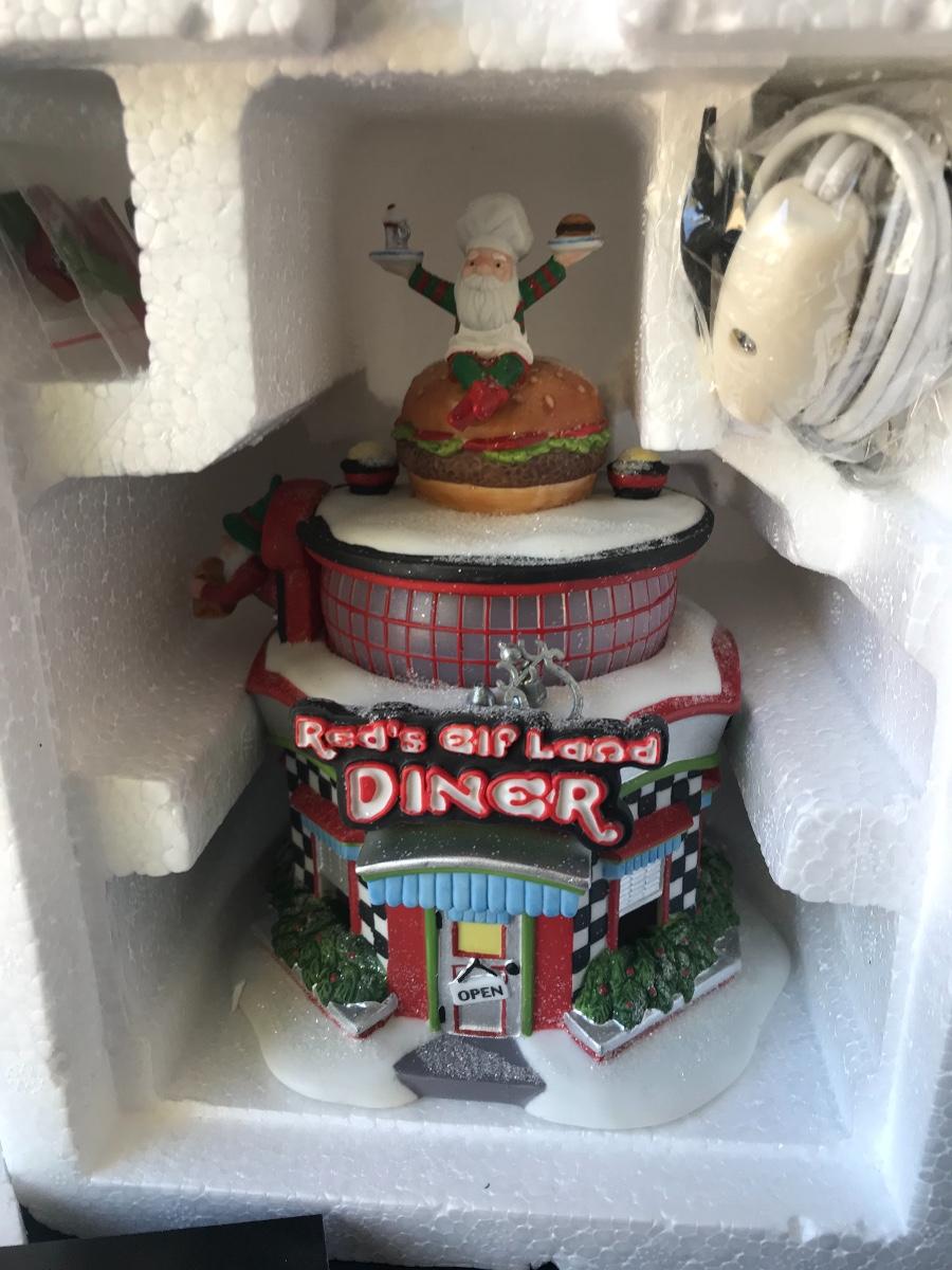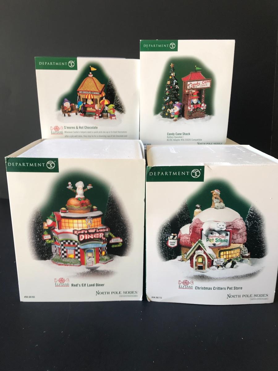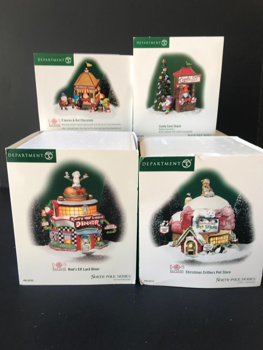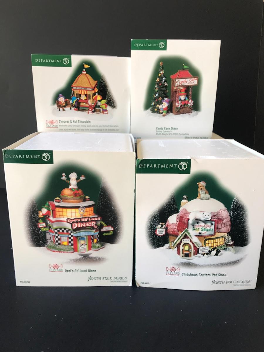 Department 56 Christmas Collectibles - Lot Of 4 - S'Mores & Hot Chocolate, Candy Cane Shack, Red's Elf Land Diner, and Christmas Critters Pet Store. Red's Elf Land Diner has a broken piece, seen in photos. All Holiday items in this auction are as-seen. The client collected a lot of holiday pieces and some are new in box, some were displayed once and come with original box, and some have been displayed and come with no box. They are all pre-owned in some fashion and have been stored in an attic or on shelf in library. Please see all pictures. The pictures show condition, measurements if taken, and what is included in the lot. Due to the large amount that we photograph and the time frame, we are not always able to take measurements. All items unless noted, are pre-owned and have been used. Thank you