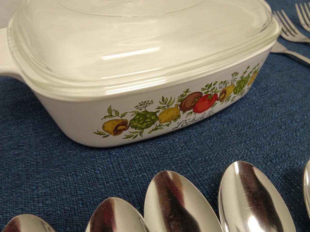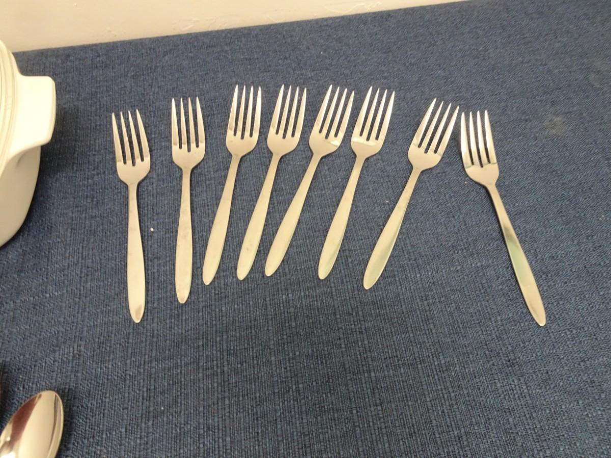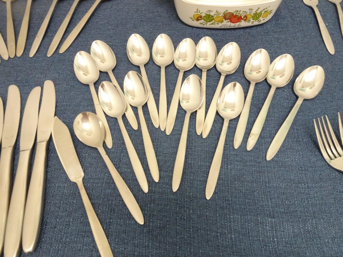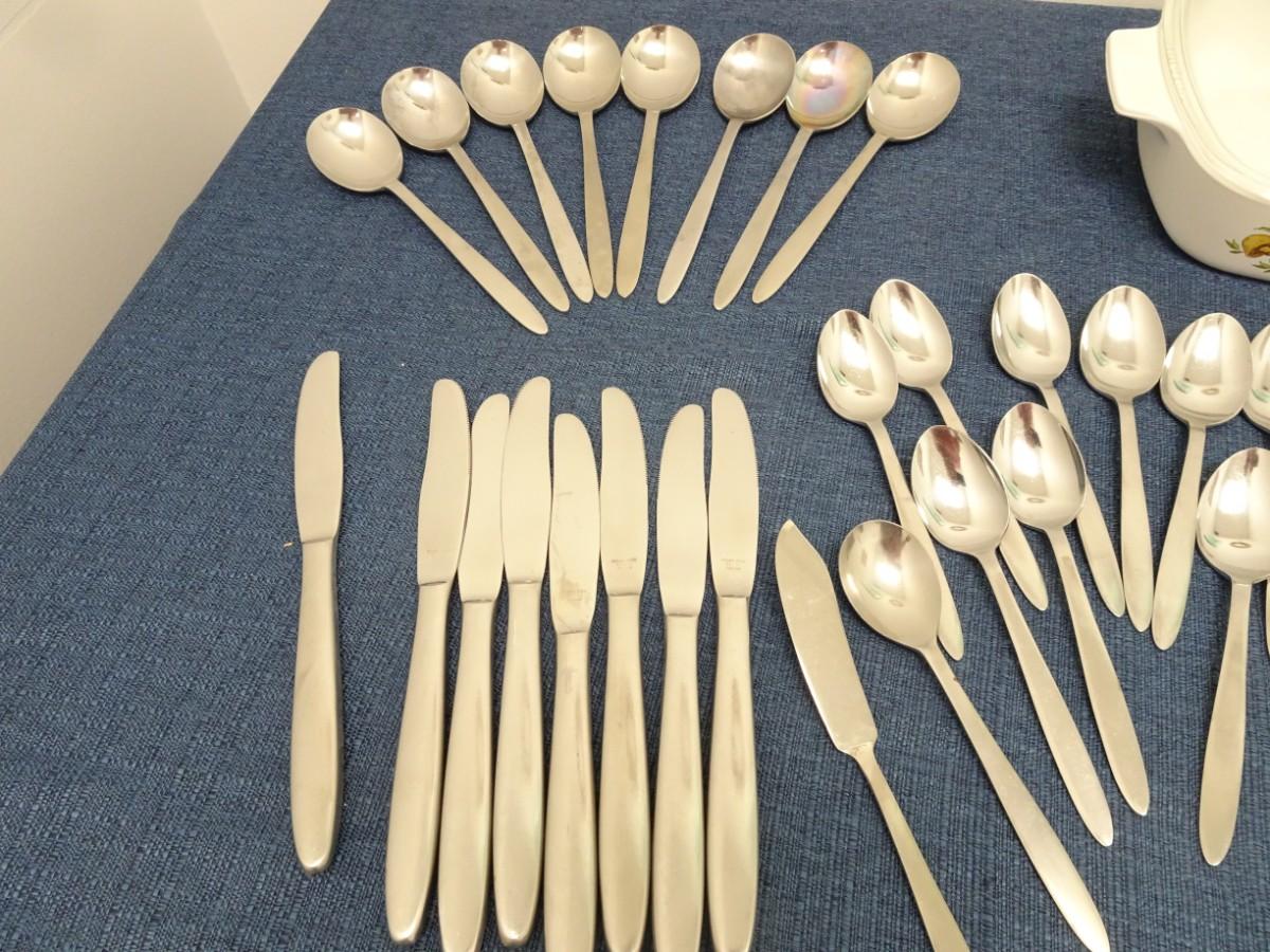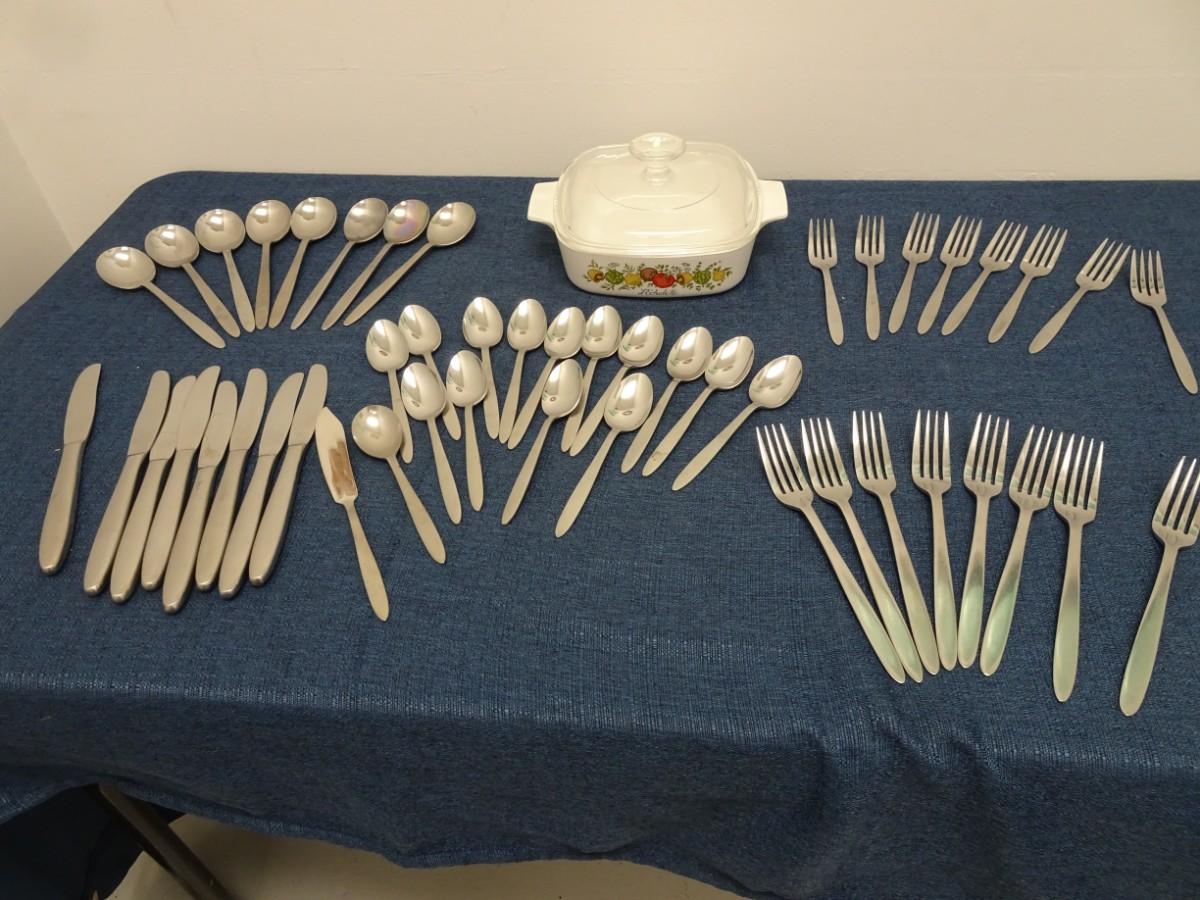 LOT 435 VINTAGE STAINLESS STEEL FLATWARE AND DISH