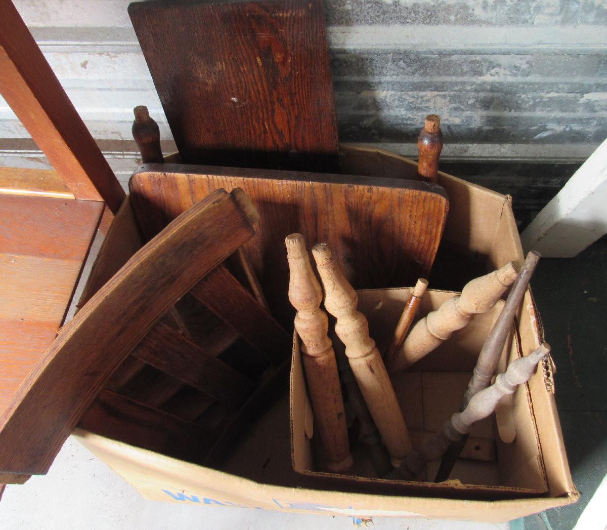 Lot 435: Box of Old Wood Parts For Repair or Repurpose