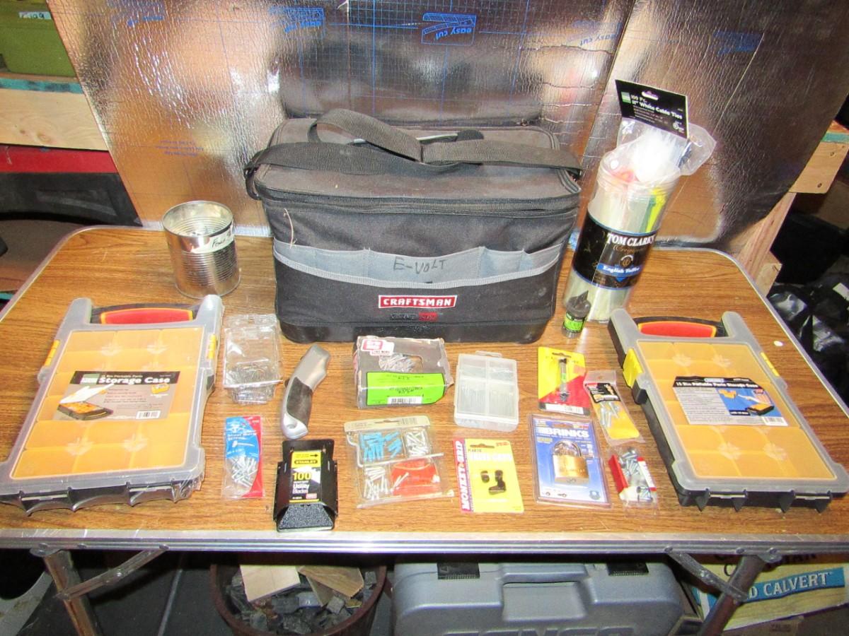 LOT 436 CANVAS TOOL BAG, NEW HARDWARE ORGANIZERS AND HARDWARE