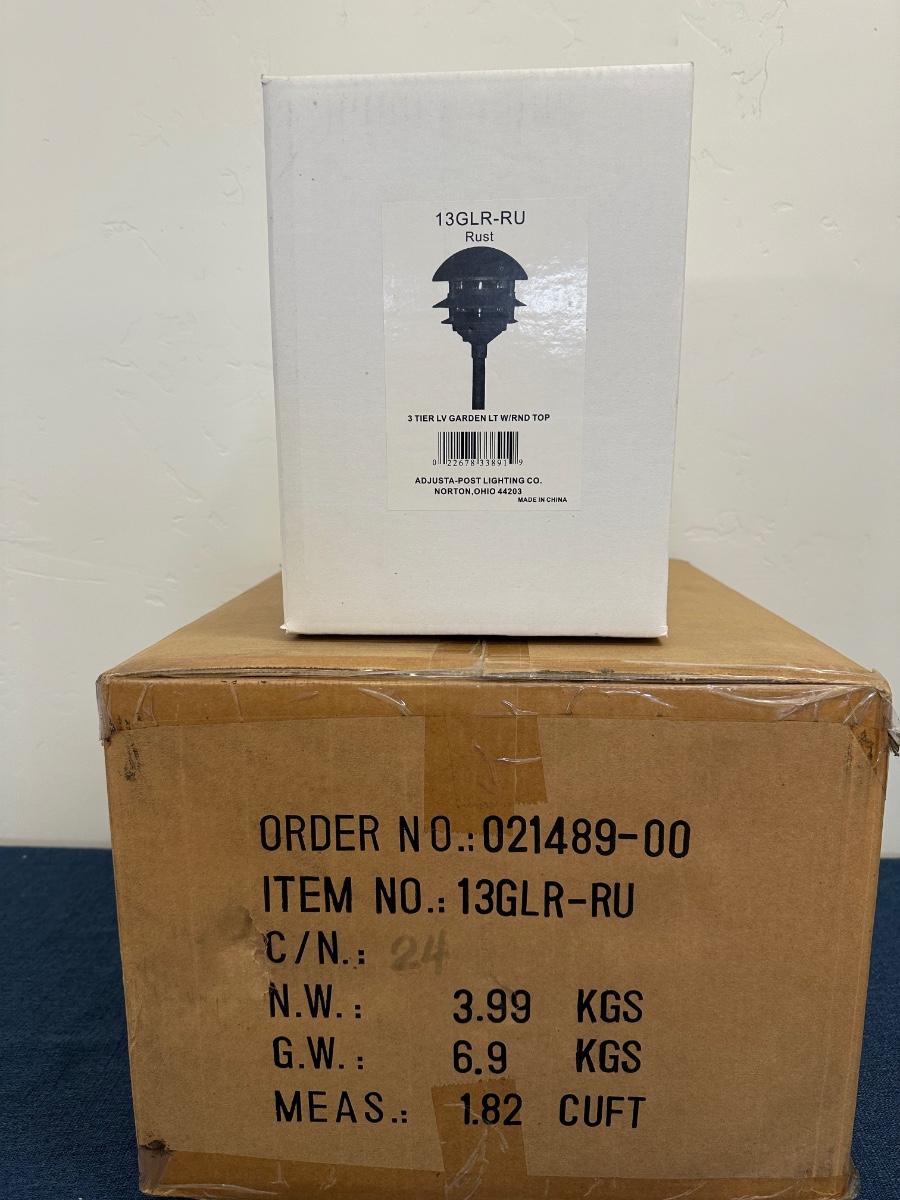 BOX OF FOUR 3 TIER, RUST COLOR LOW VOLTAGE METAL ROUND TOP GARDEN LIGHTS BY ADJUSTA-POST LIGHTING CO. MODEL 13GLR-RU