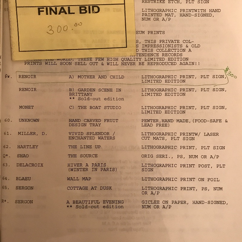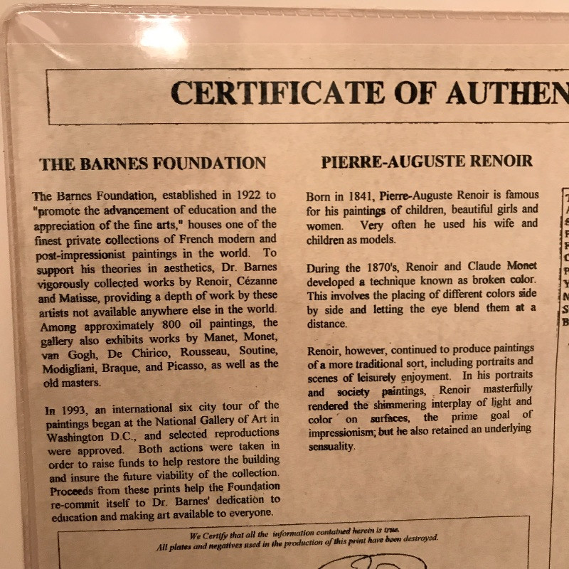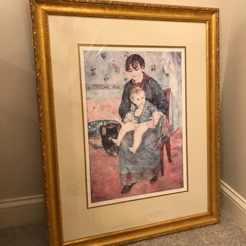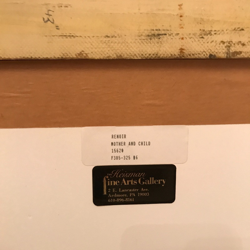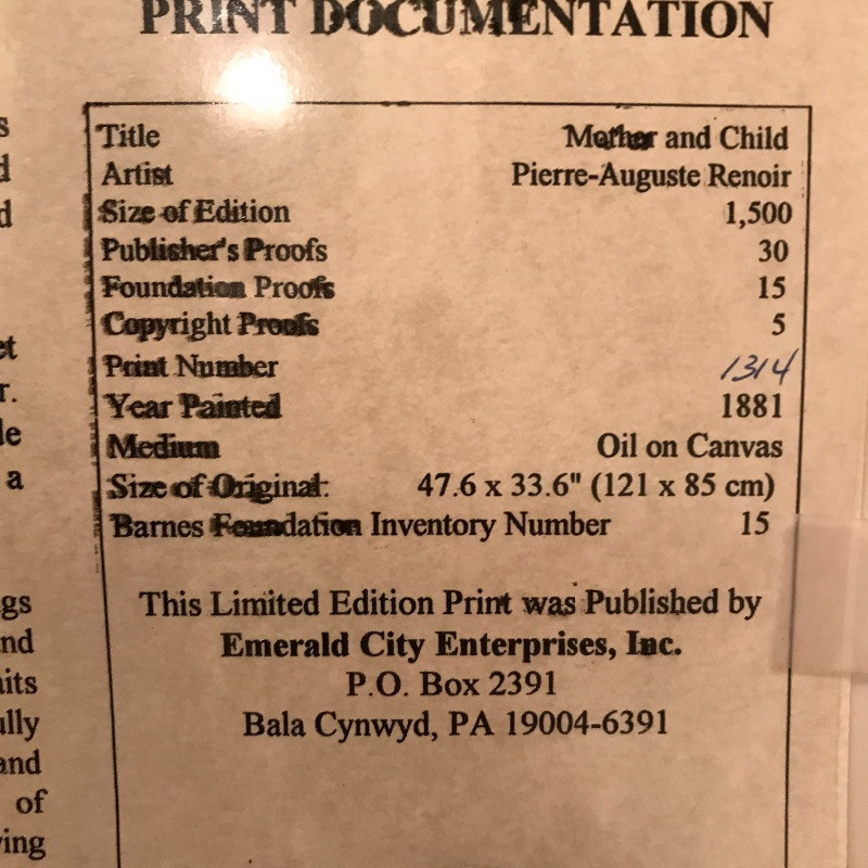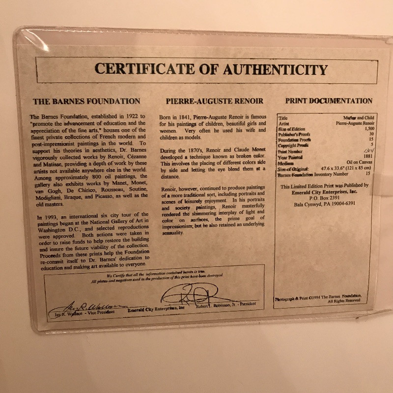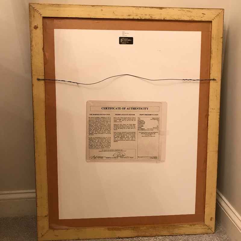 This numbered Print by Renoir comes with a Certificate of Authenticity. Numbered 1314 of 1500. It’s a nice large piece with a wonderful frame called Mother and Child. Measures 34” x 27”. Shipping available. Please call UPS for a quote prior to bidding 828-252-6930