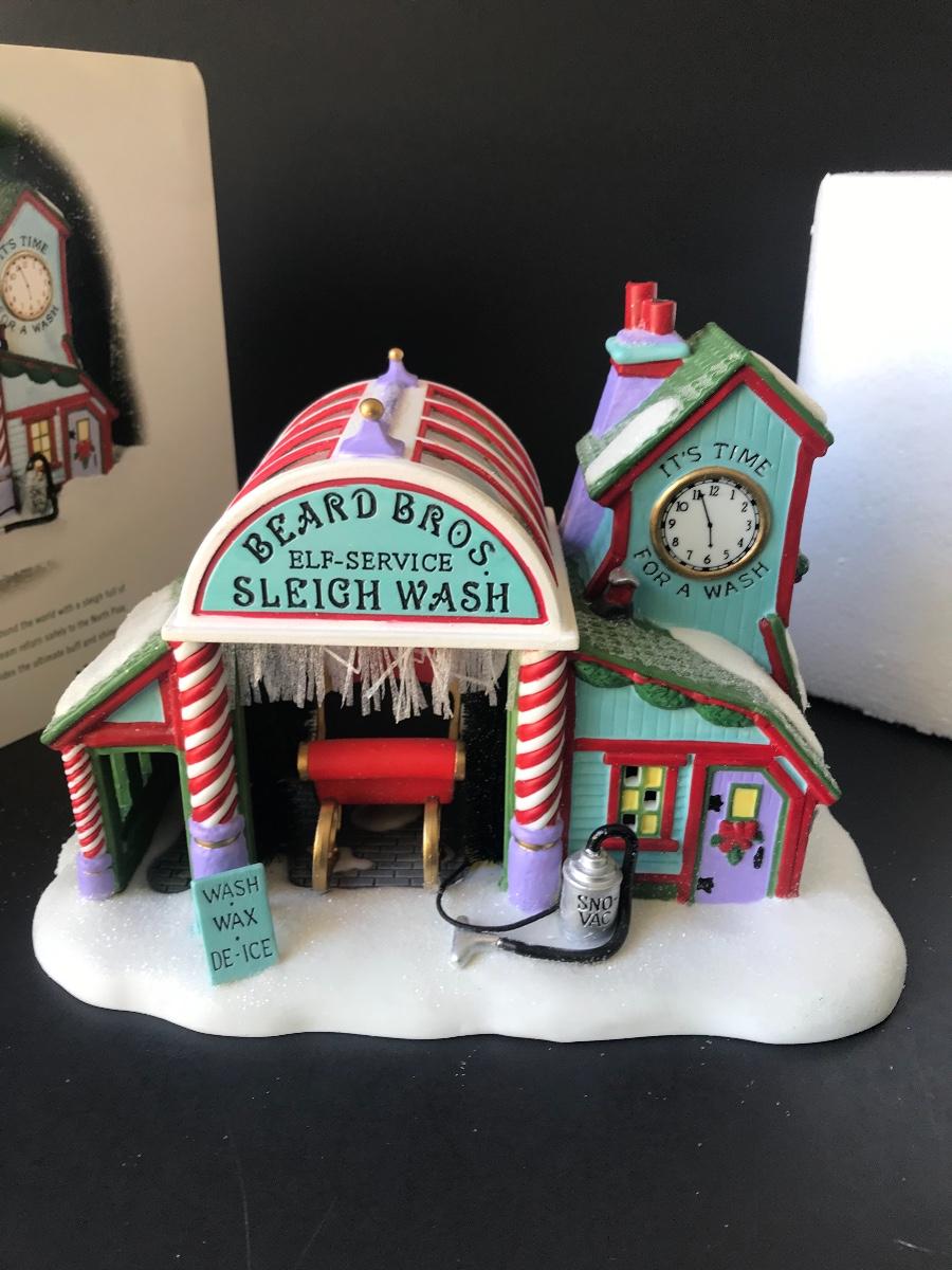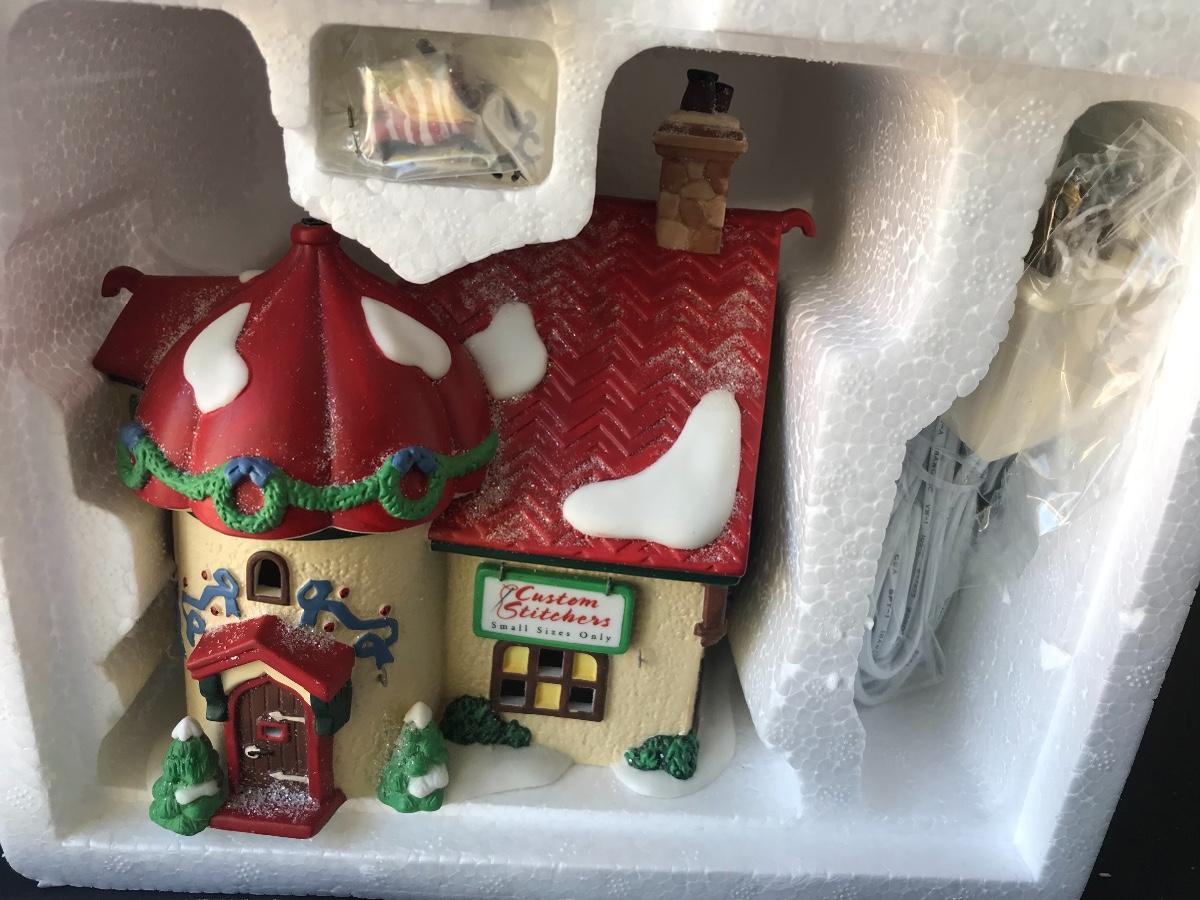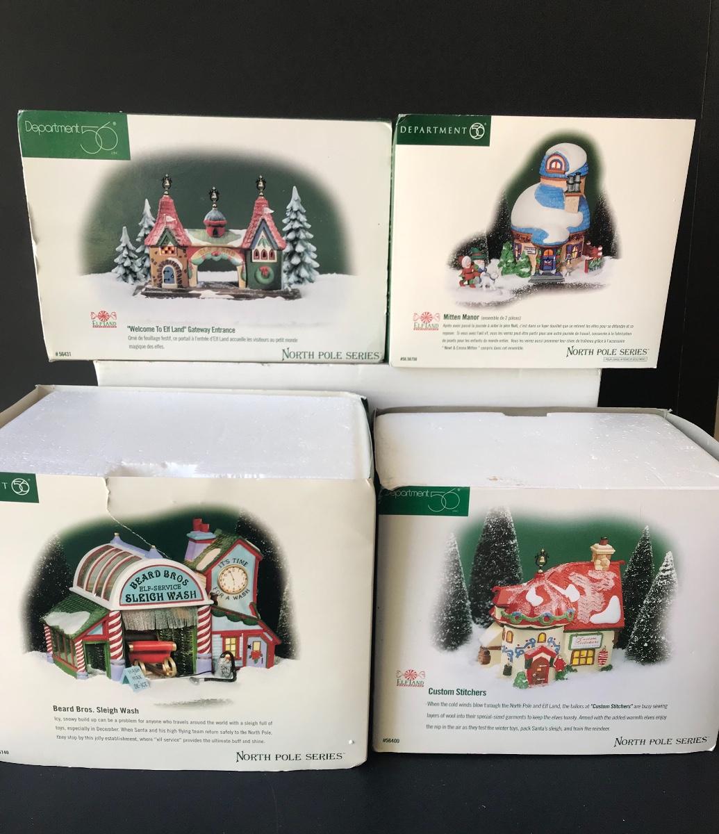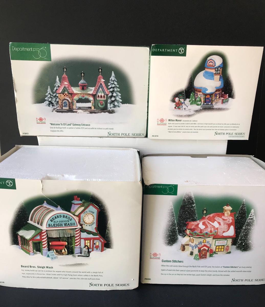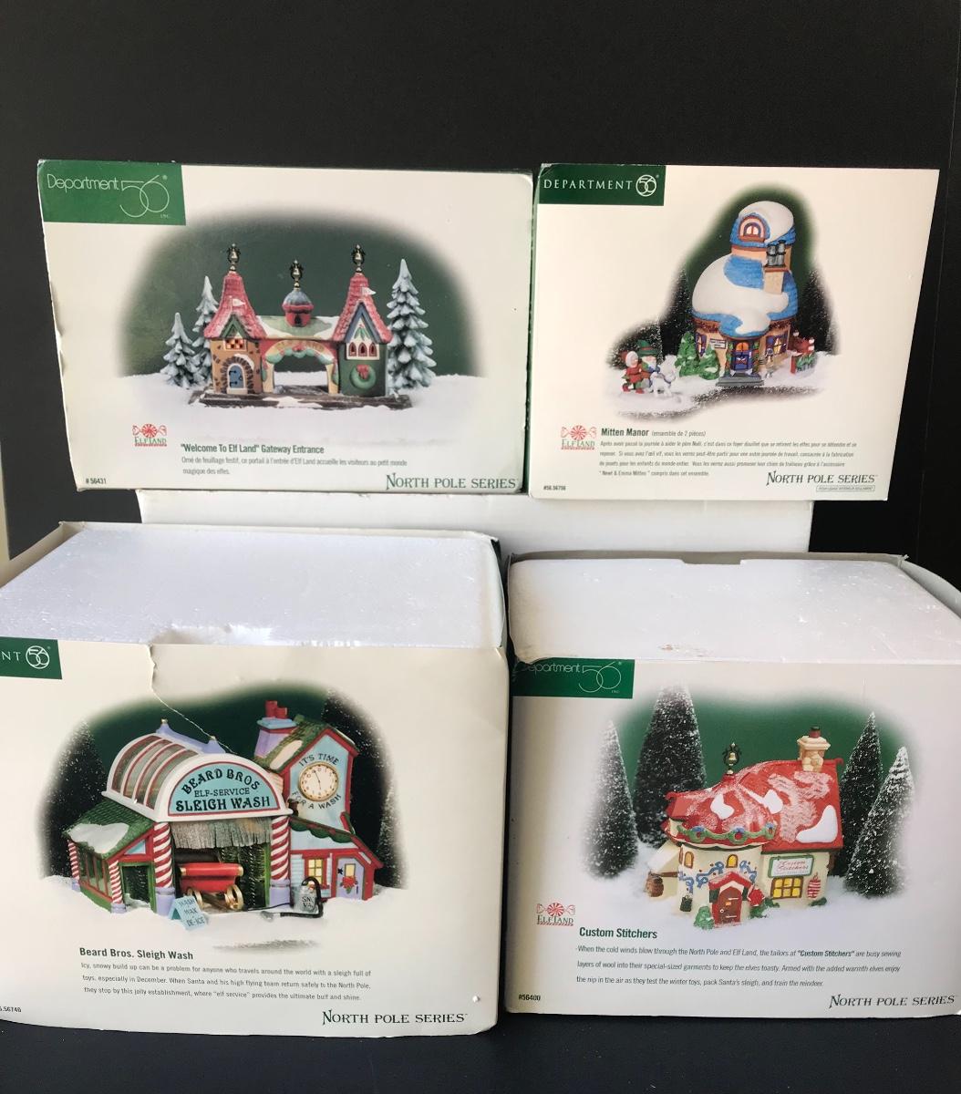Four Department 56 Christmas Display Collectibles - Welcome to Elfland, Mitten Manor, Beard Bros. Sleigh Wash, and Custom Stitchers. All Holiday items in this auction are as-seen. The client collected a lot of holiday pieces and some are new in box, some were displayed once and come with original box, and some have been displayed and come with no box. They are all pre-owned in some fashion and have been stored in an attic or on shelf in library. Please see all pictures. The pictures show condition, measurements if taken, and what is included in the lot. Due to the large amount that we photograph and the time frame, we are not always able to take measurements. All items unless noted, are pre-owned and have been used. Thank you