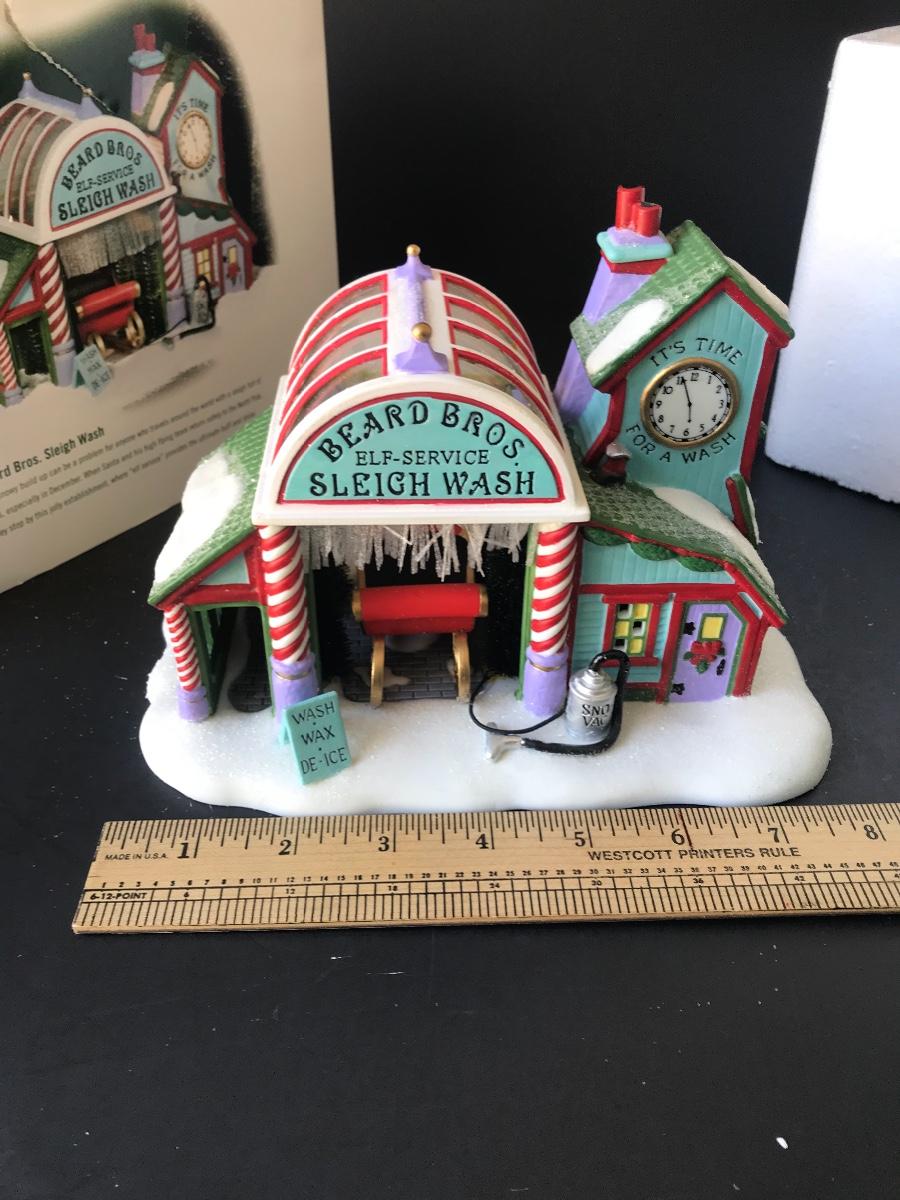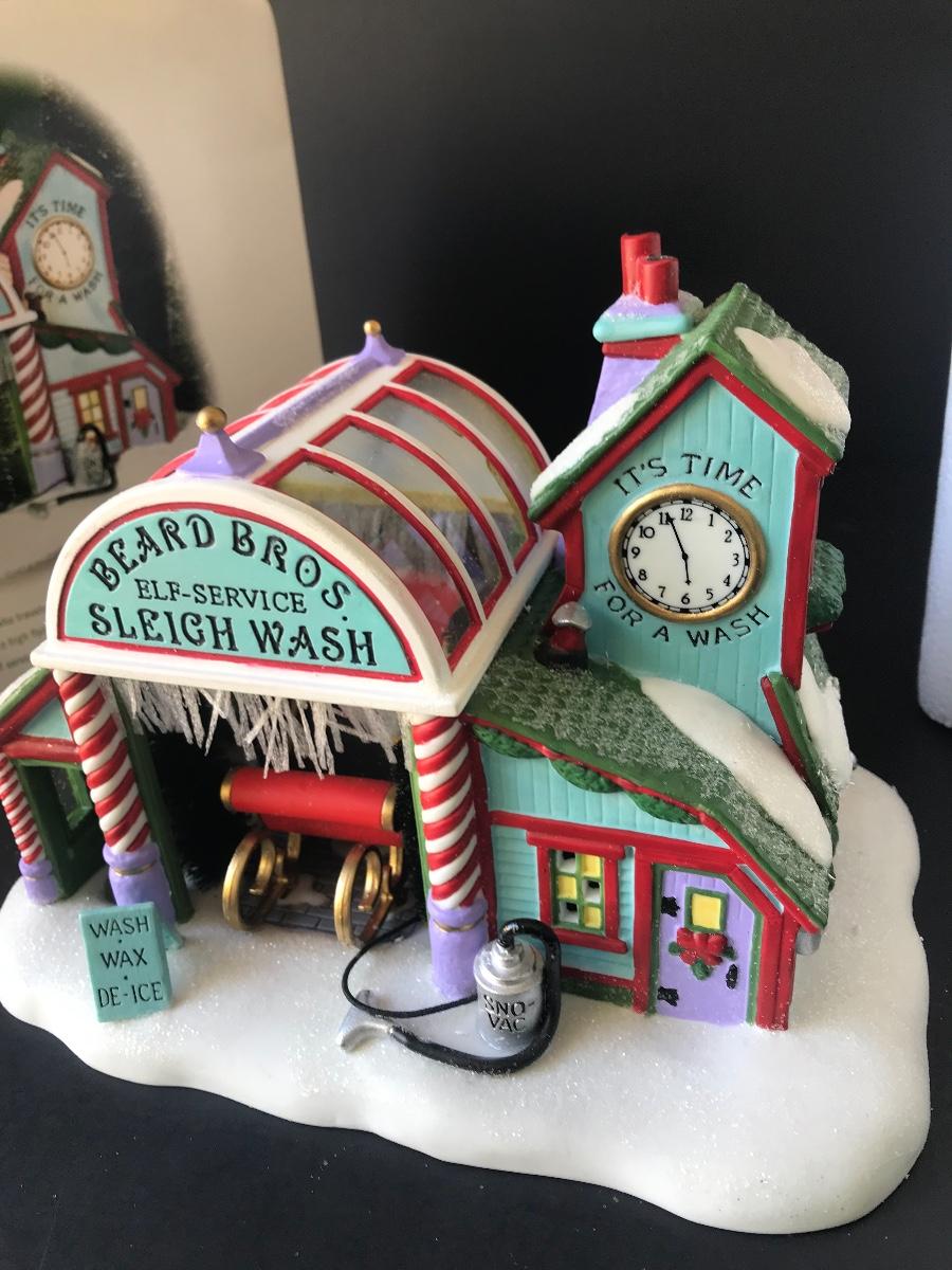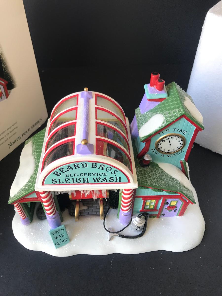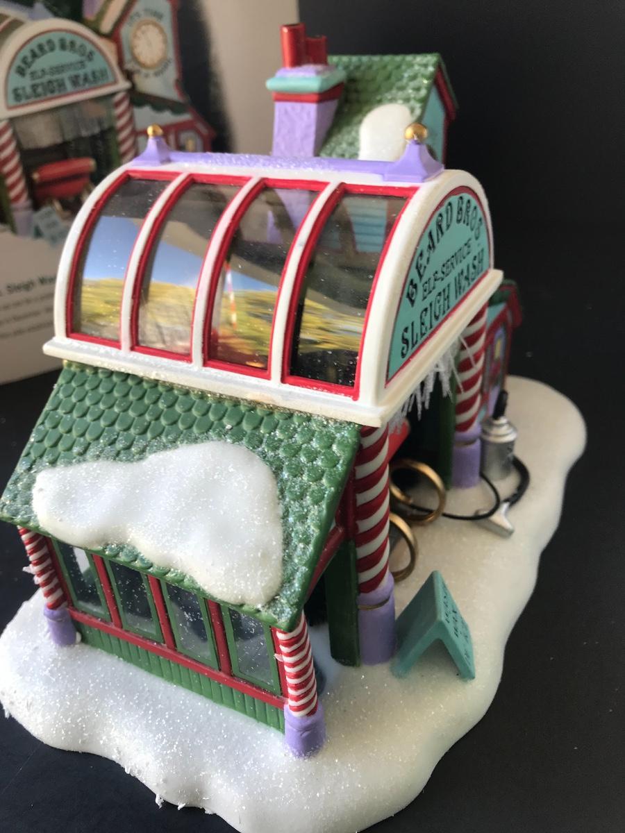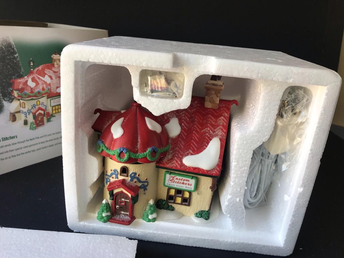 Four Department 56 Christmas Display Collectibles - Welcome to Elfland, Mitten Manor, Beard Bros. Sleigh Wash, and Custom Stitchers. All Holiday items in this auction are as-seen. The client collected a lot of holiday pieces and some are new in box, some were displayed once and come with original box, and some have been displayed and come with no box. They are all pre-owned in some fashion and have been stored in an attic or on shelf in library. Please see all pictures. The pictures show condition, measurements if taken, and what is included in the lot. Due to the large amount that we photograph and the time frame, we are not always able to take measurements. All items unless noted, are pre-owned and have been used. Thank you