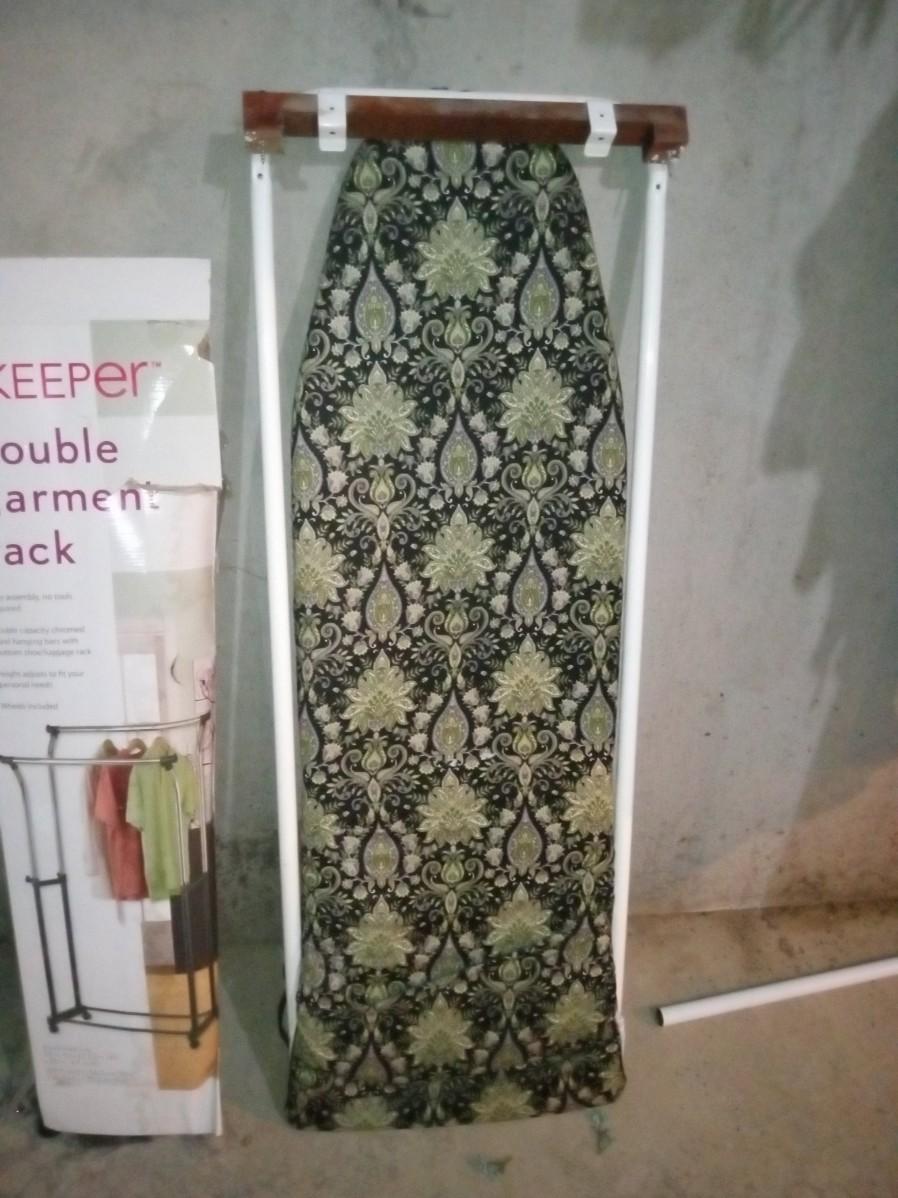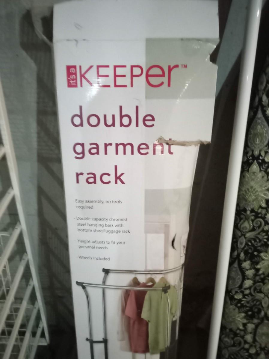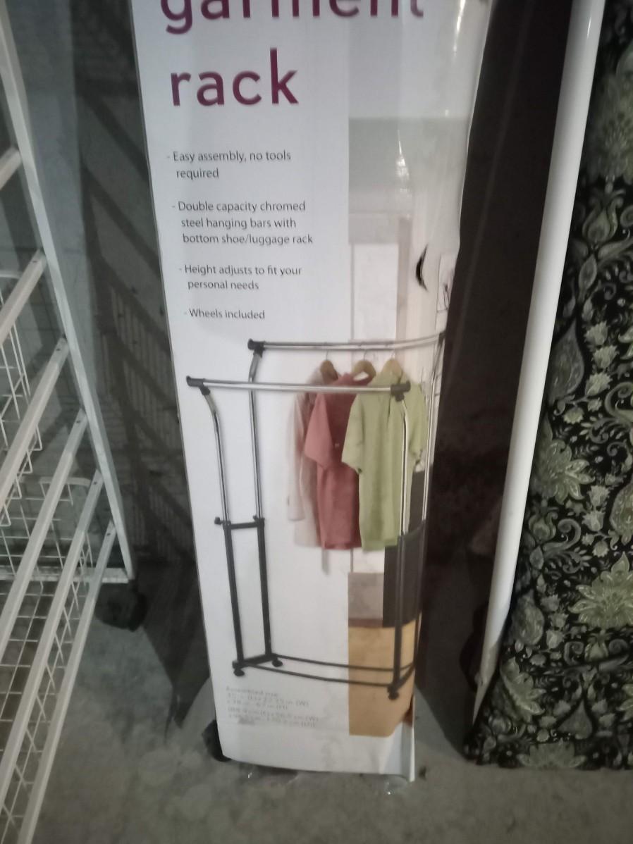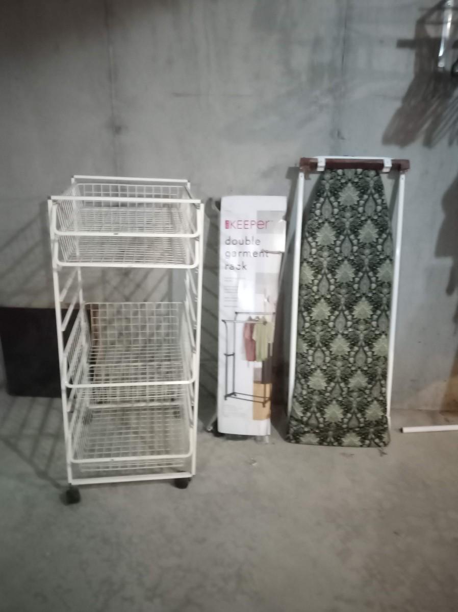 THE DOUBLE GARMENT RACKS BOX IS BARELY HOLDING ON BUT IT APPEARS TO BE COMPLETE, THE METAL CART ON CASTERS MEASURES 18" X 23" X 43" AND HAS 4 PULL OUT TRAYS, THE IRONING BOARD IS INTENDED TO BE MOUNTED ON A WALL