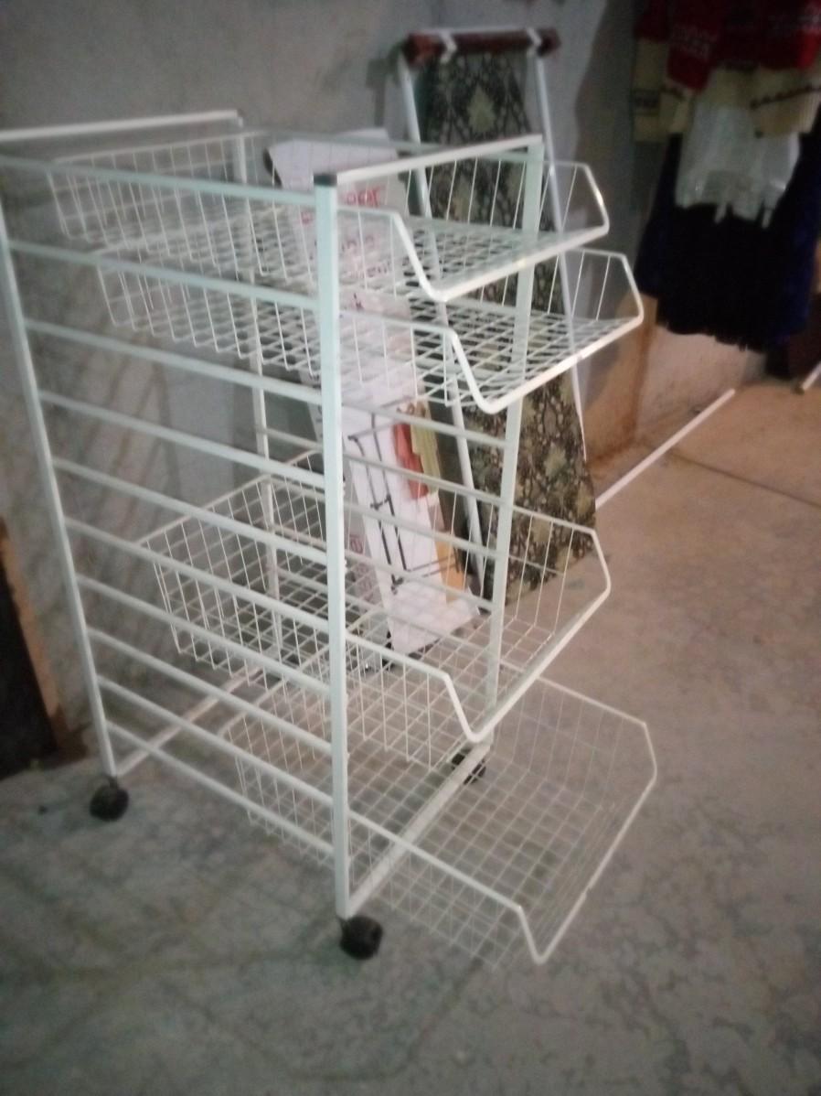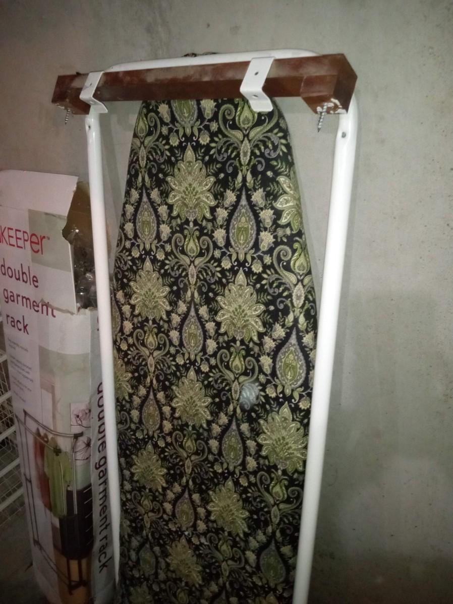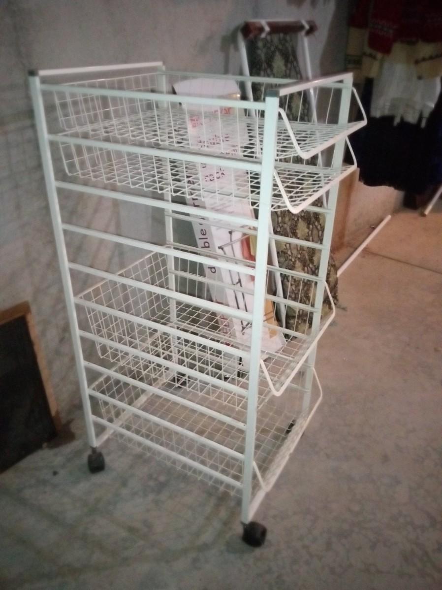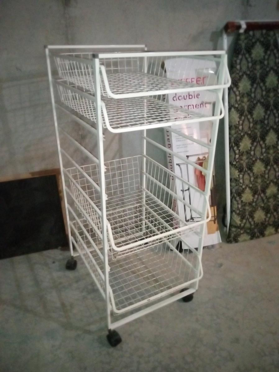 THE DOUBLE GARMENT RACKS BOX IS BARELY HOLDING ON BUT IT APPEARS TO BE COMPLETE, THE METAL CART ON CASTERS MEASURES 18" X 23" X 43" AND HAS 4 PULL OUT TRAYS, THE IRONING BOARD IS INTENDED TO BE MOUNTED ON A WALL