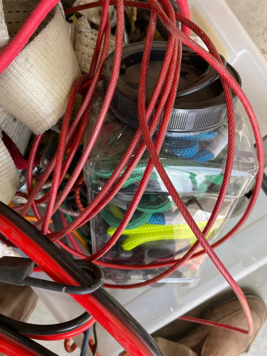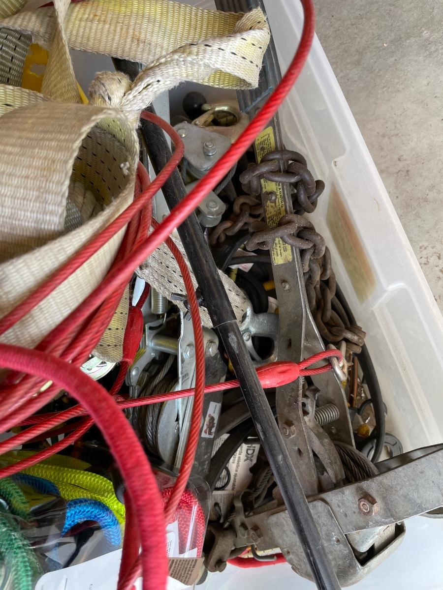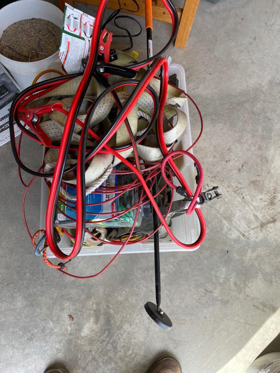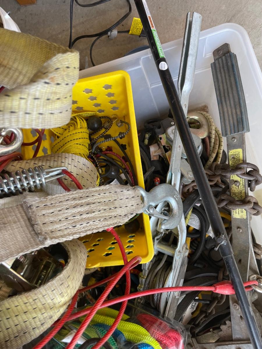 Lot 438 box of tie down straps, bungee cords and jumper cables
