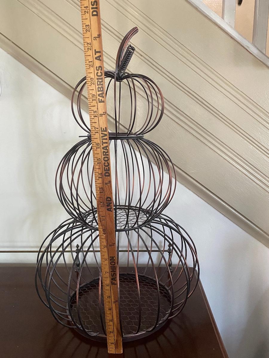 Metal Pumpkin is 23” tall. Pumpkin opens on the top and in the middle to fill for fall decor.