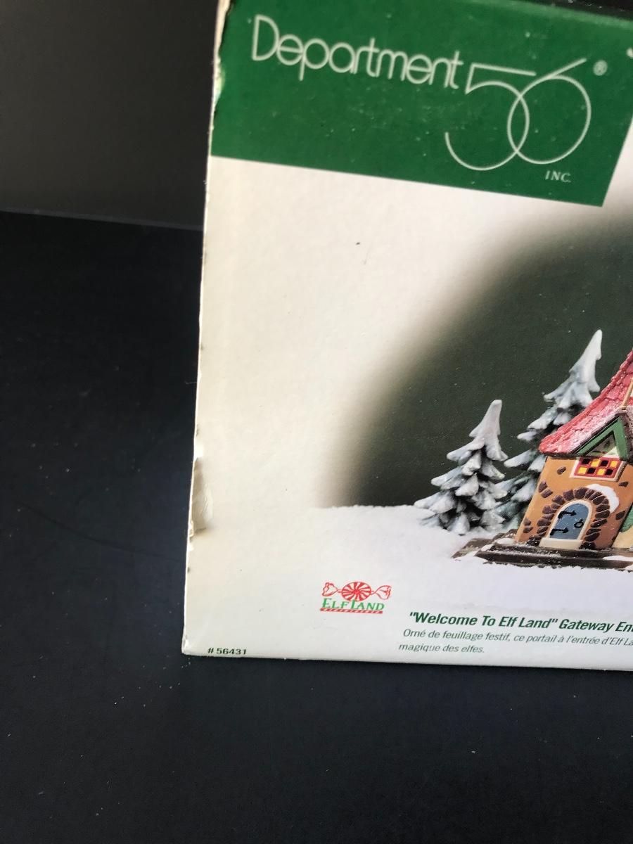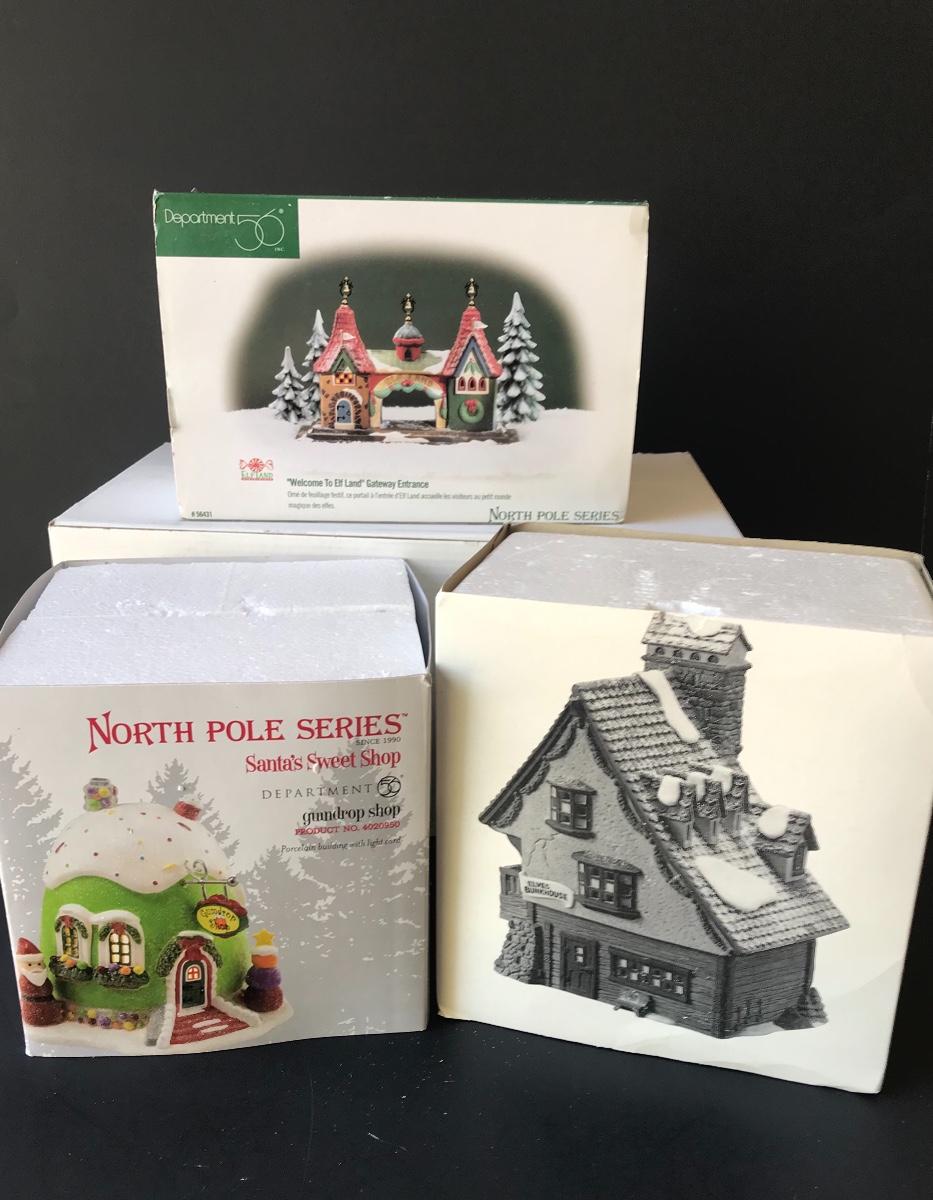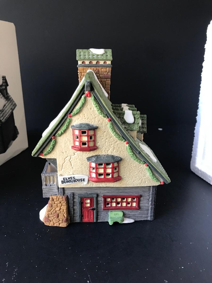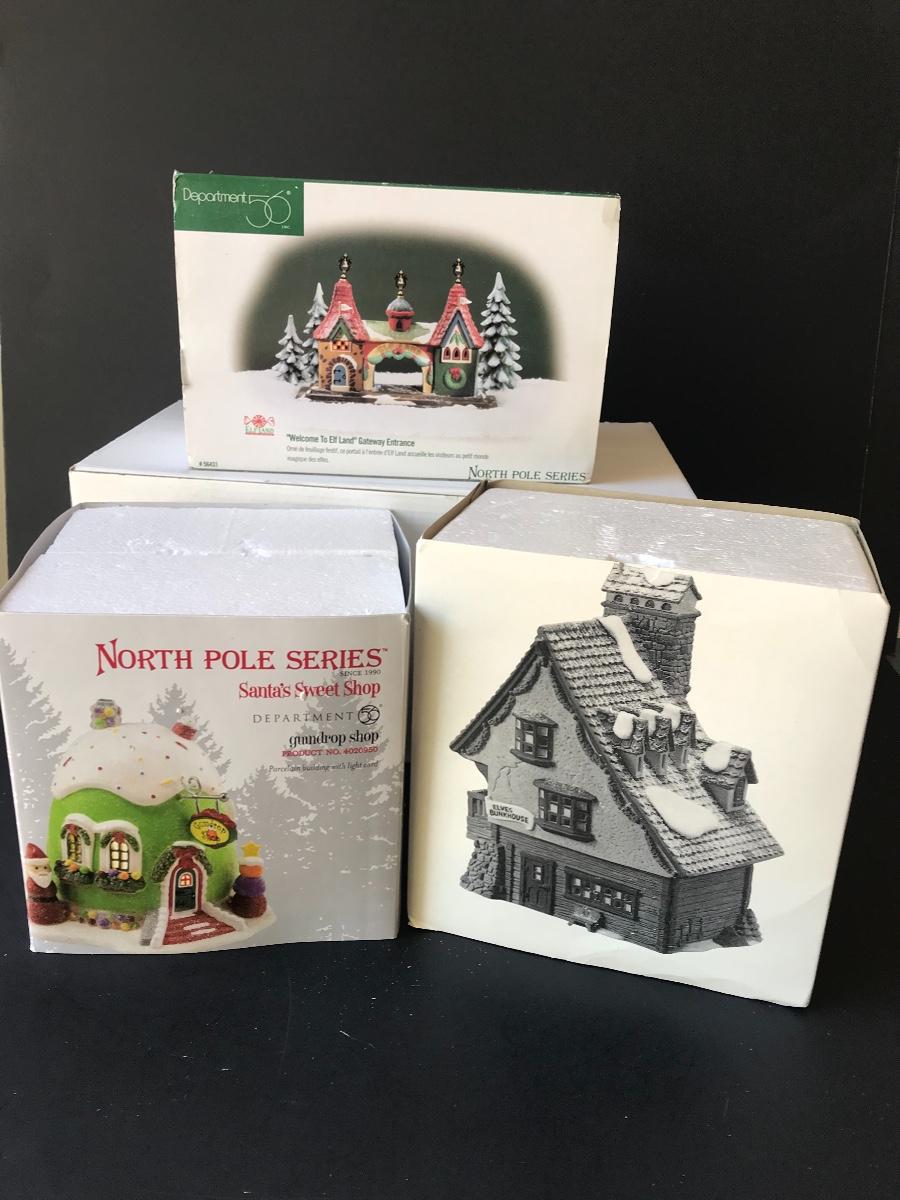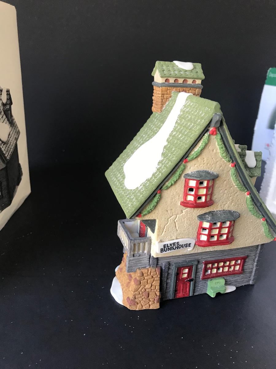Department 56 Christmas Collectibles - Lot of 3 - Welcome To Elfland, Santa's Sweet Shop and Elf Bunkhouse. All Holiday items in this auction are as-seen. The client collected a lot of holiday pieces and some are new in box, some were displayed once and come with original box, and some have been displayed and come with no box. They are all pre-owned in some fashion and have been stored in an attic or on shelf in library. Please see all pictures. The pictures show condition, measurements if taken, and what is included in the lot. Due to the large amount that we photograph and the time frame, we are not always able to take measurements. All items unless noted, are pre-owned and have been used. Thank you