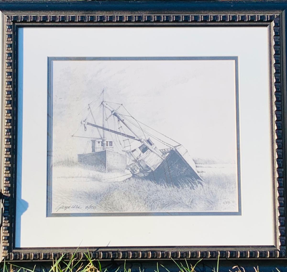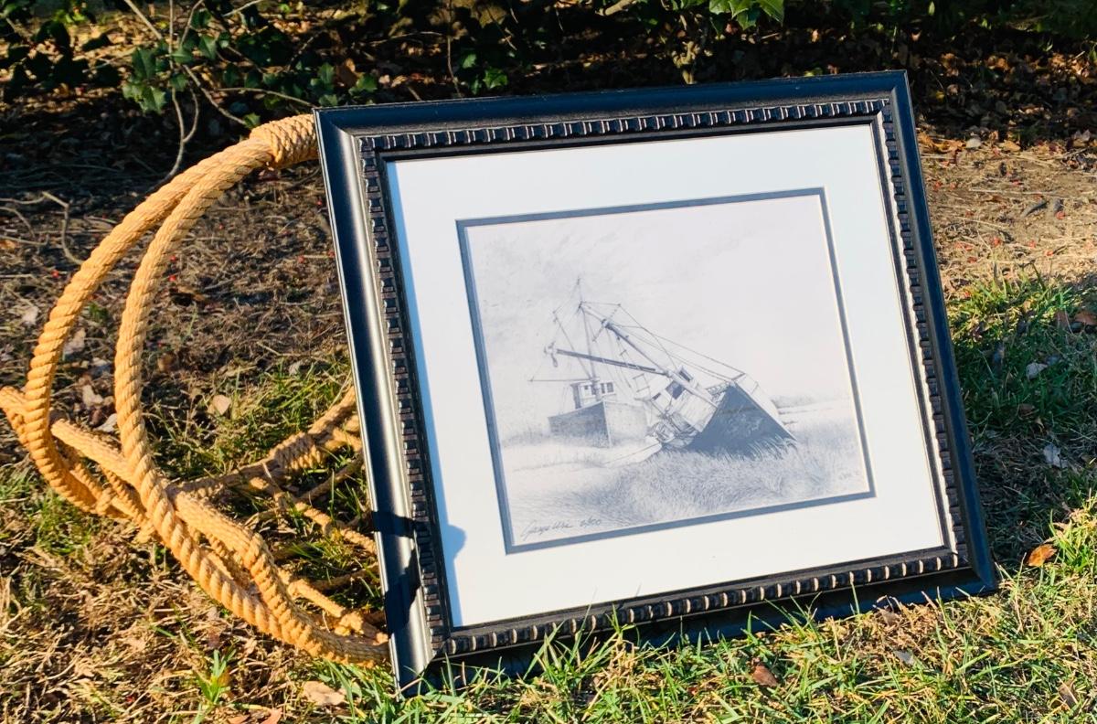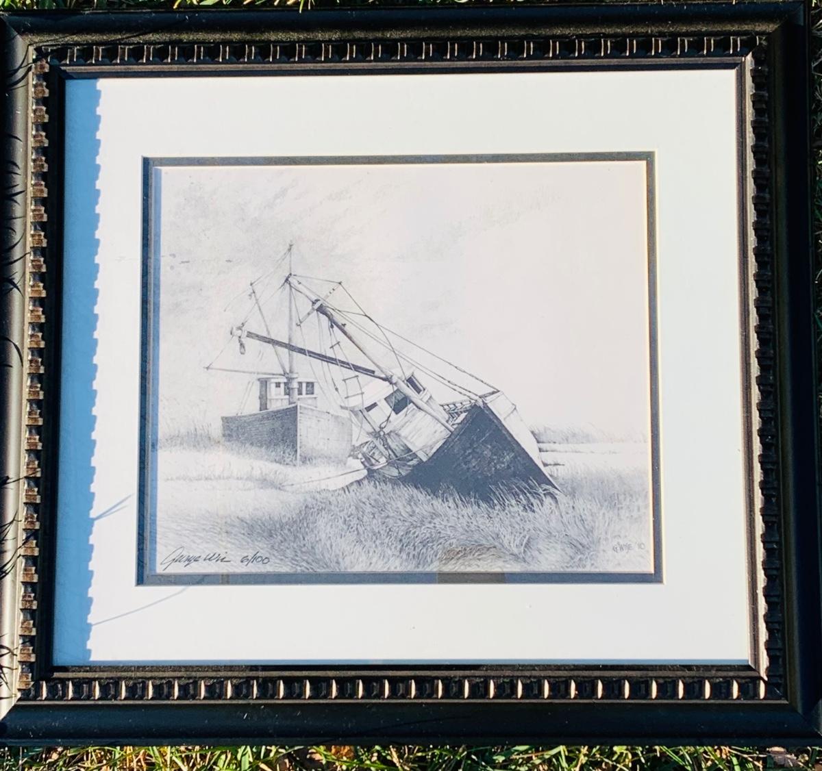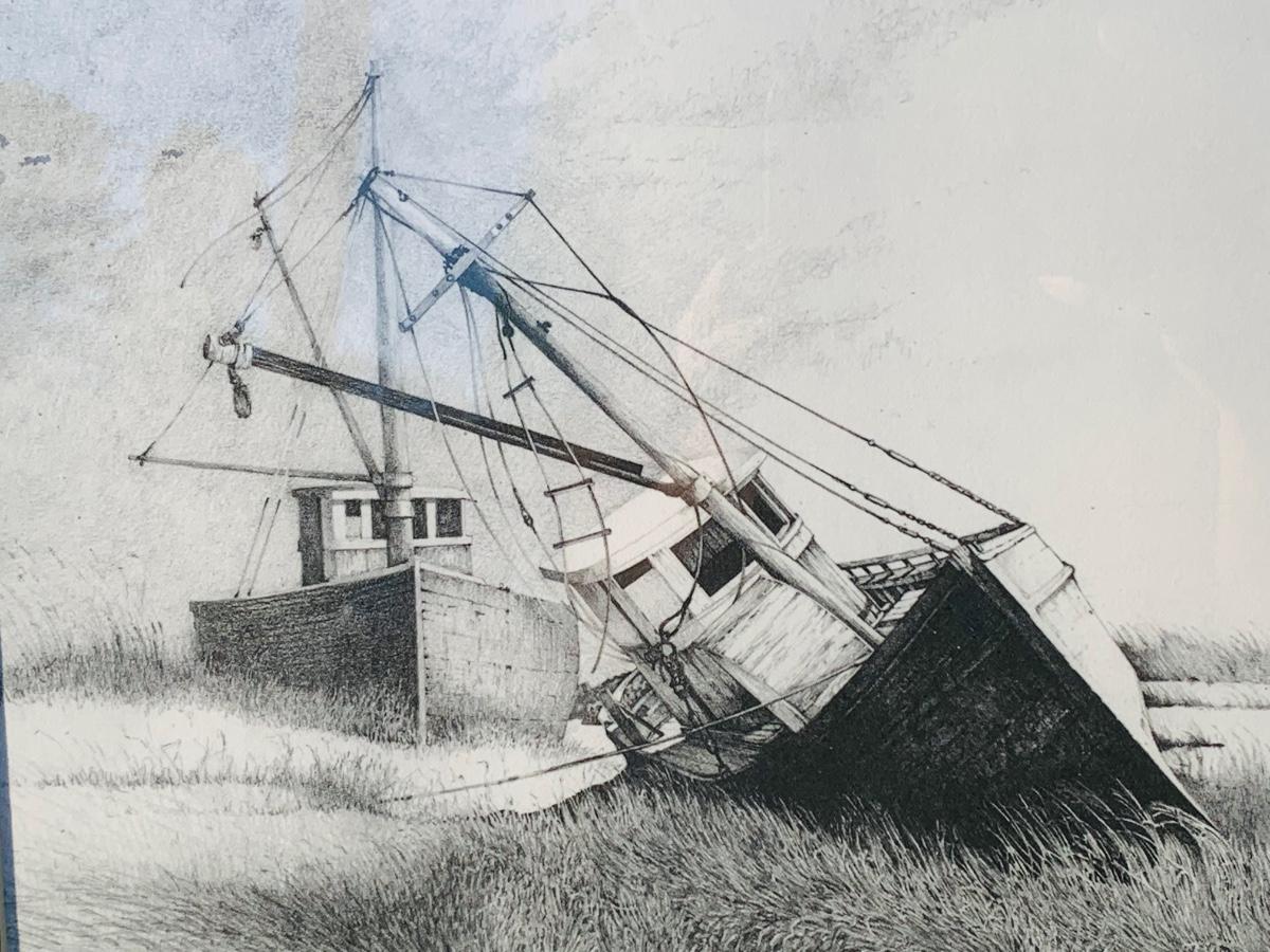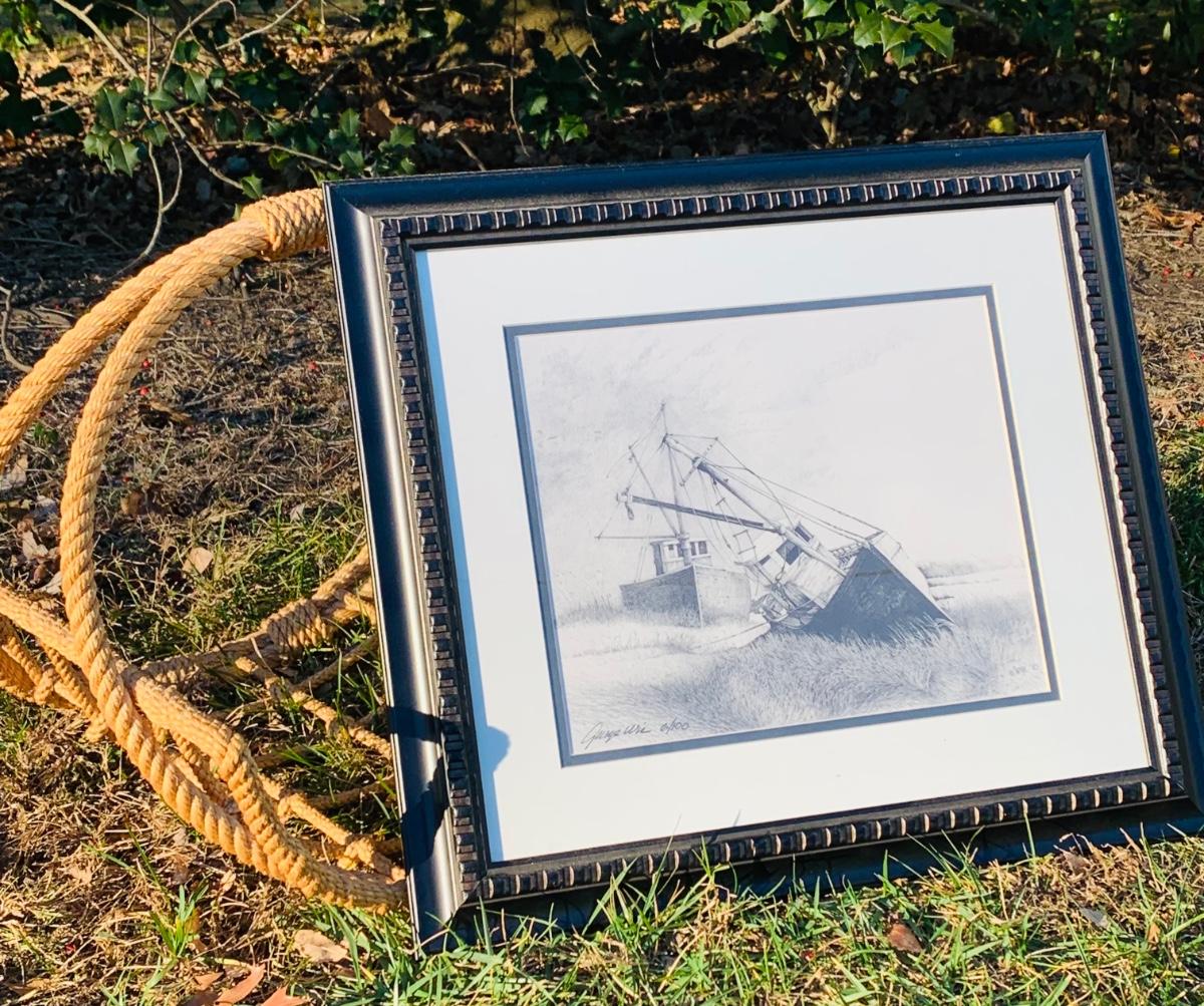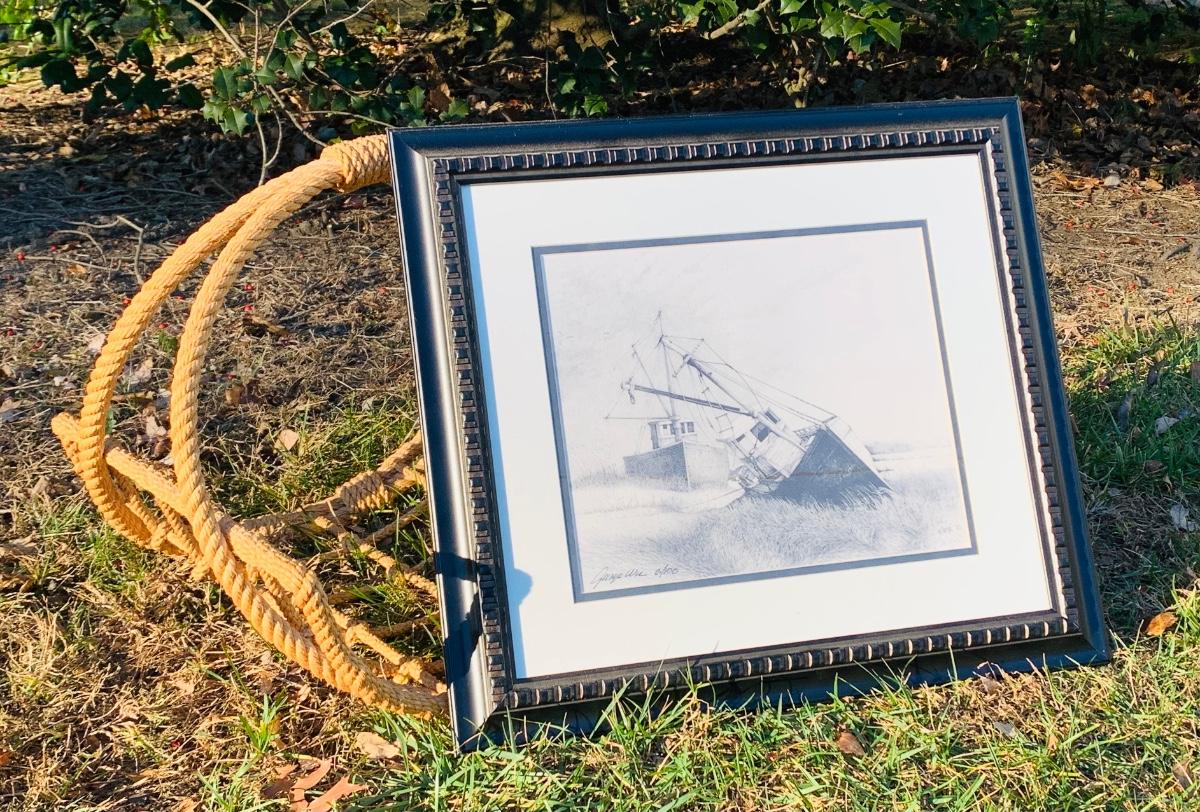 Nautical themed etching signed, numbered and dated along with an awesome rope/knotted versatile basket.