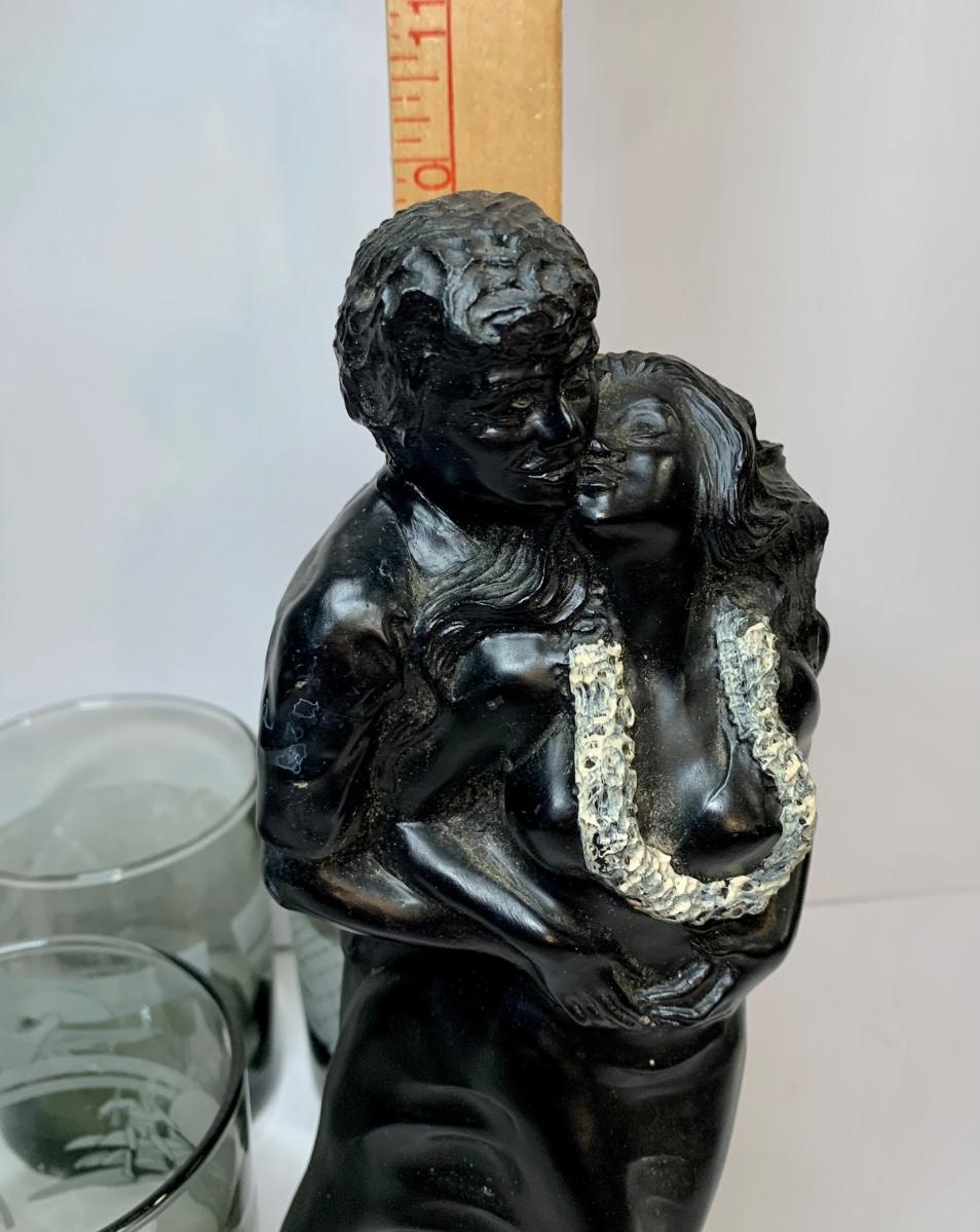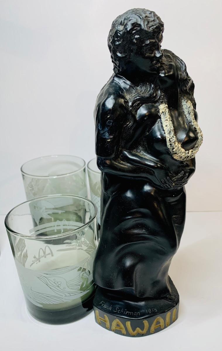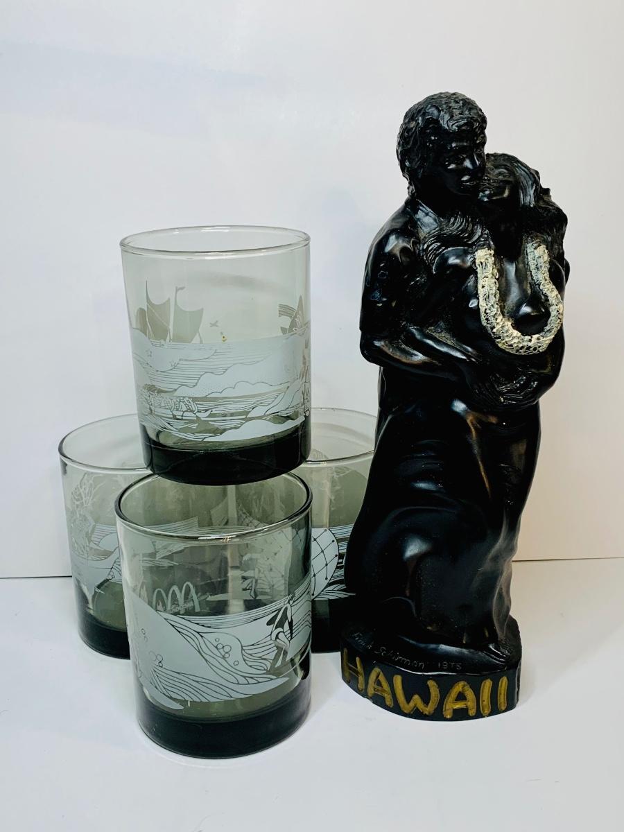 Lot 438: Vintage Black Coral Sculpture: "Pilialoha" & McDonald's Hawaii Glasses