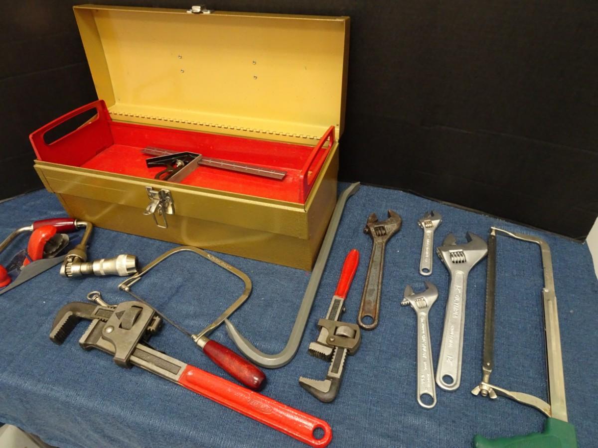 LOT 438  TOOL BOX, TOOLS AND WRENCHES