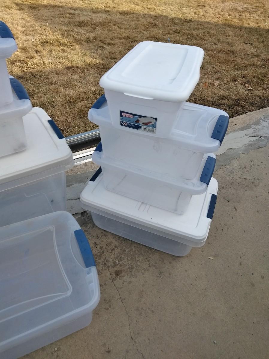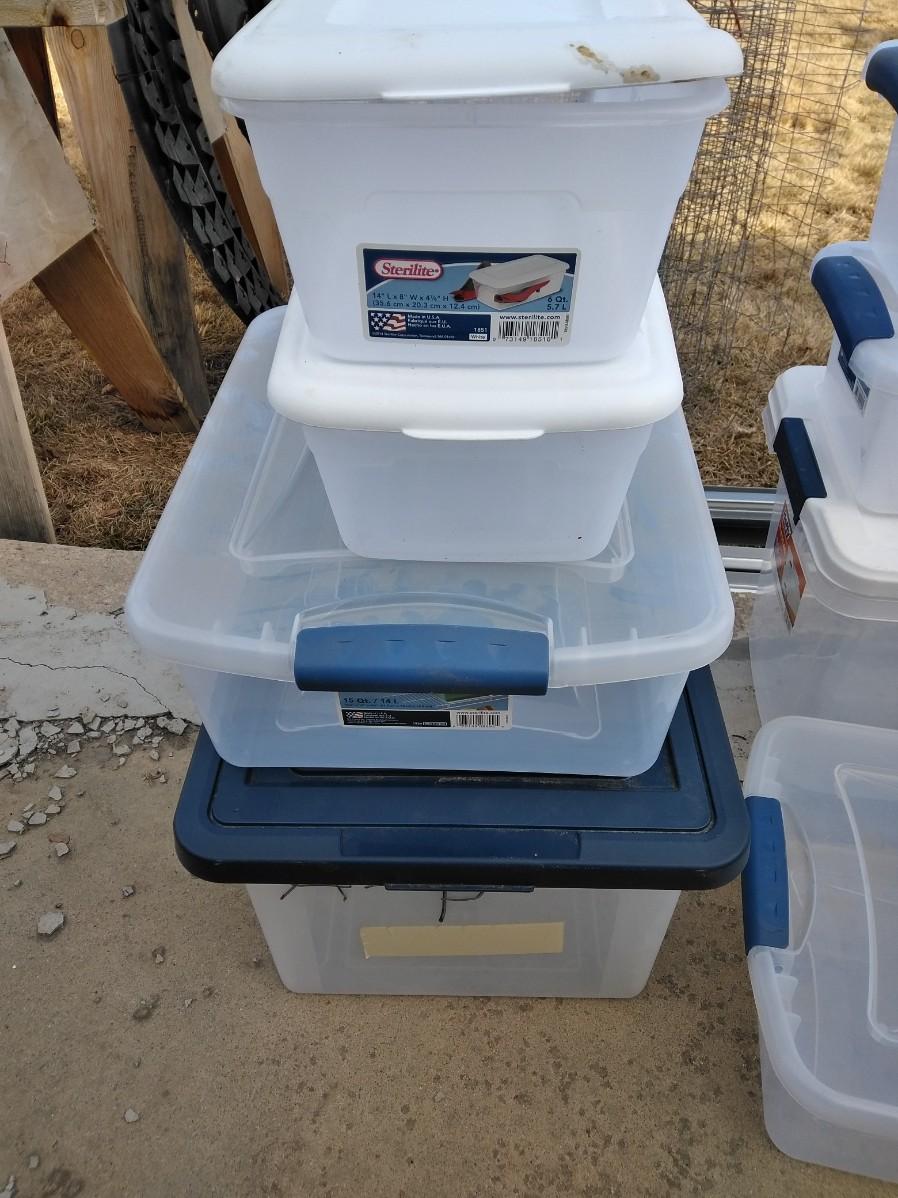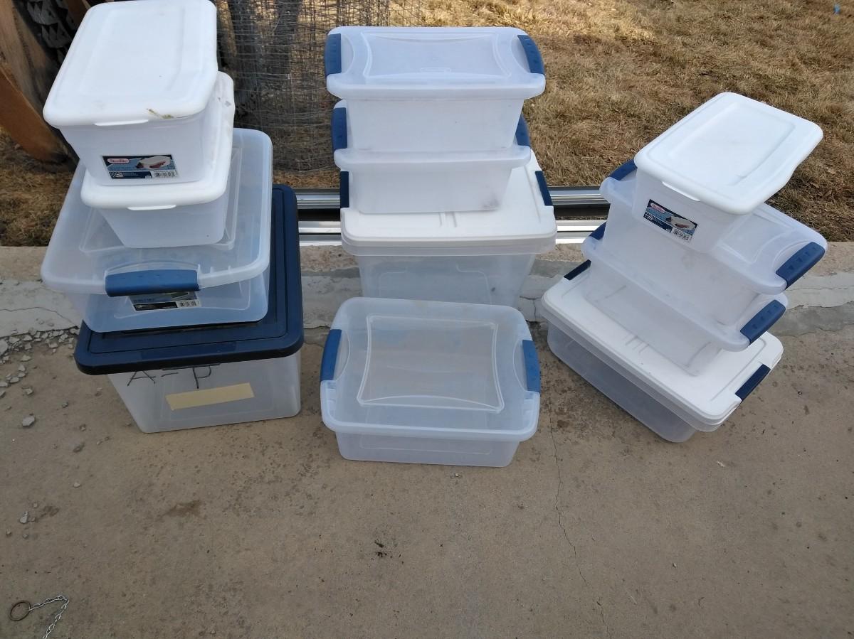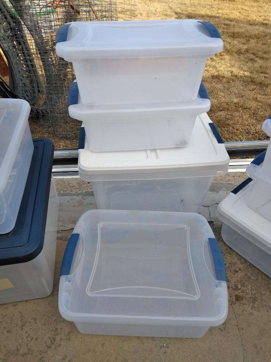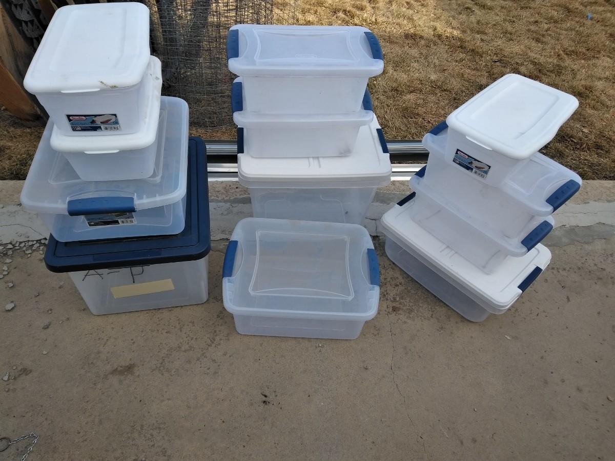 12 MEDIUM AND SMALL STORAGE TOTES WITH LIDS