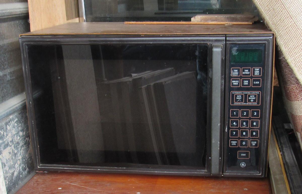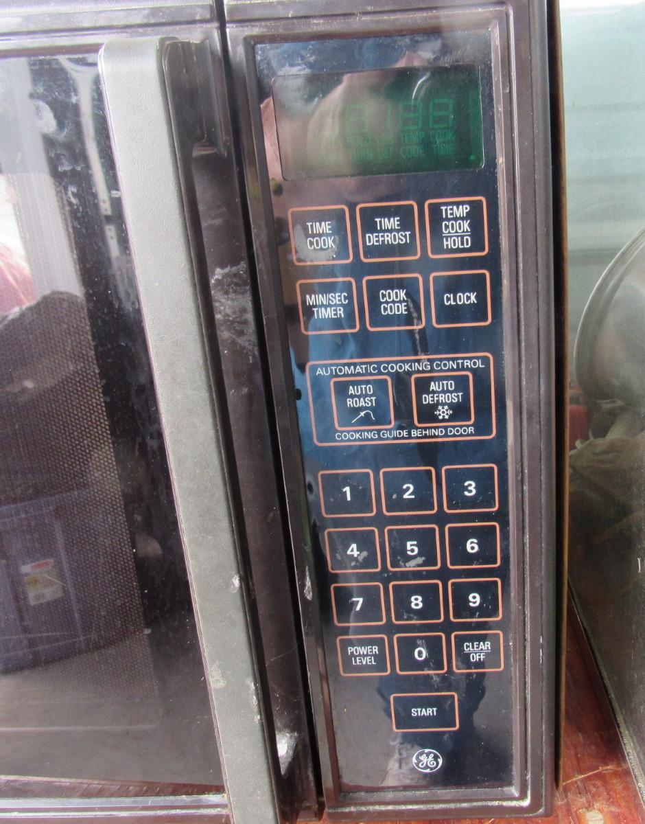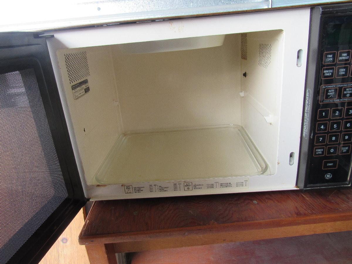 This is an old one but it was working last time client used it a few years ago. Outside needs cleaning, inside is pretty clean. There is no shelf, one peg is missing. There is a glass tray on bottom.