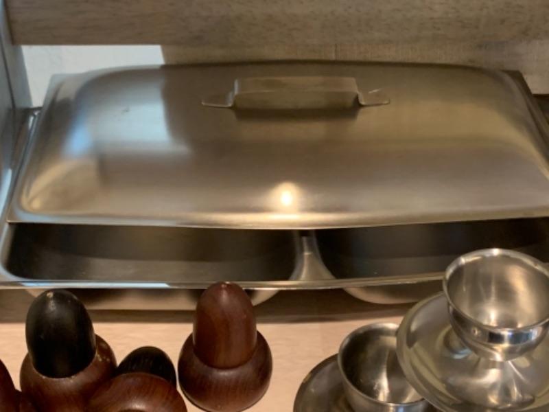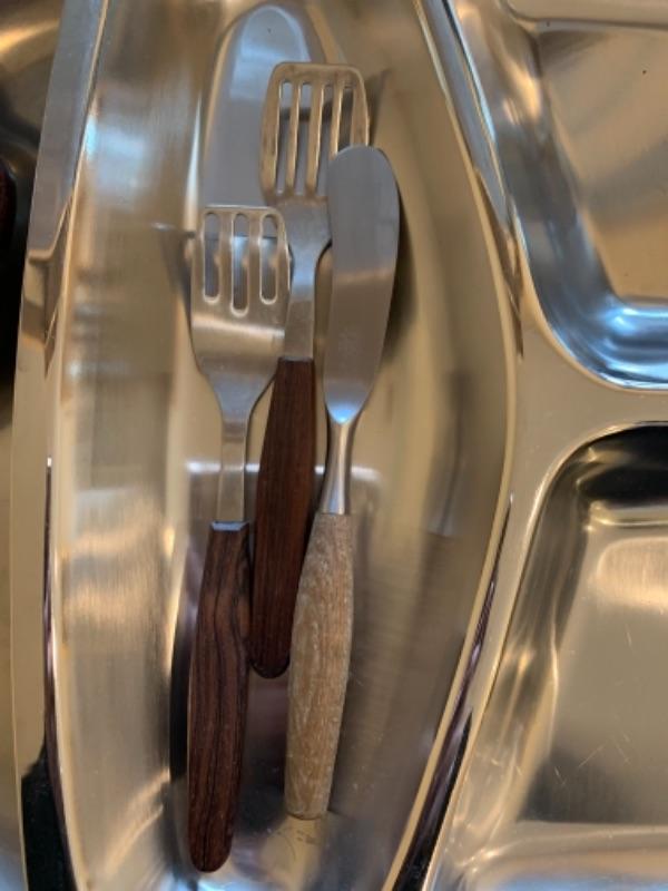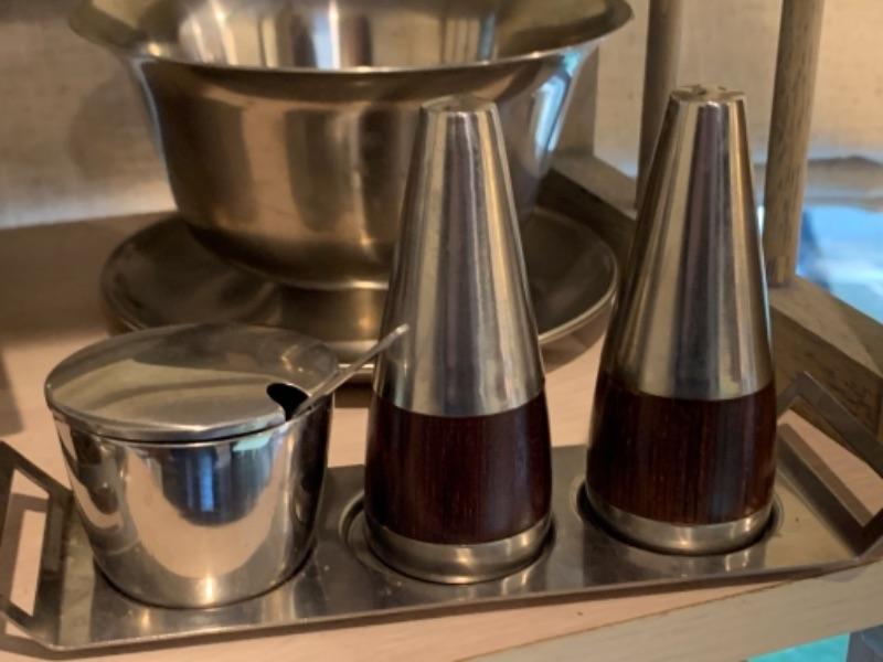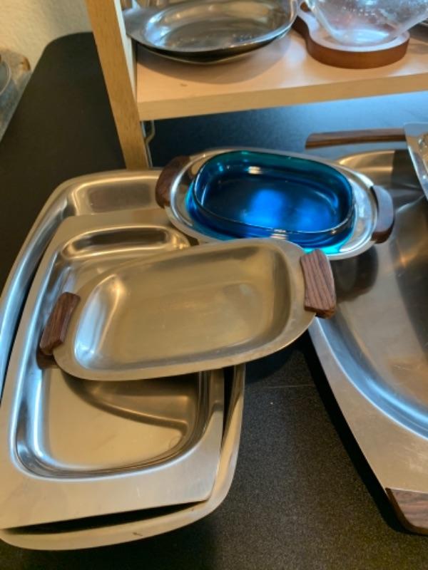 Lot 43D. Assortment of mid-century wooden service pieces, stainless steel, chargers (8), wooden salad bowl, salt and pepper set with relish tray, etc.--$150