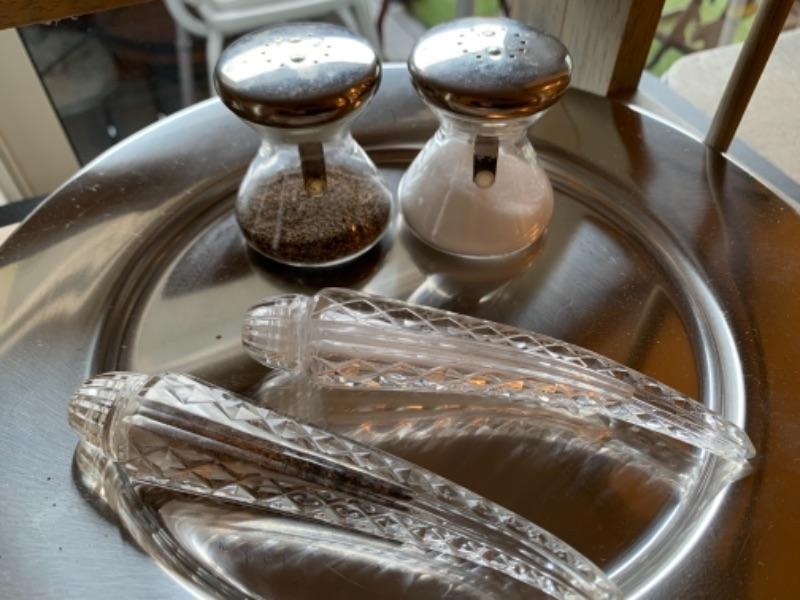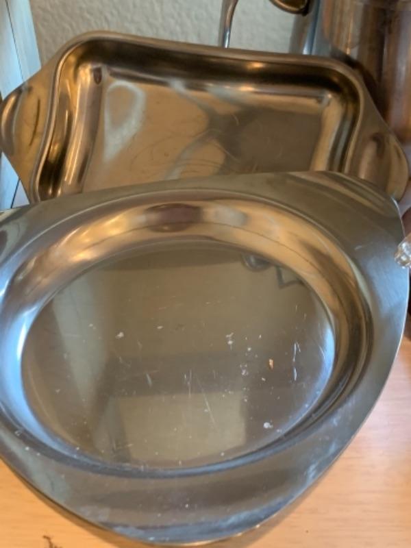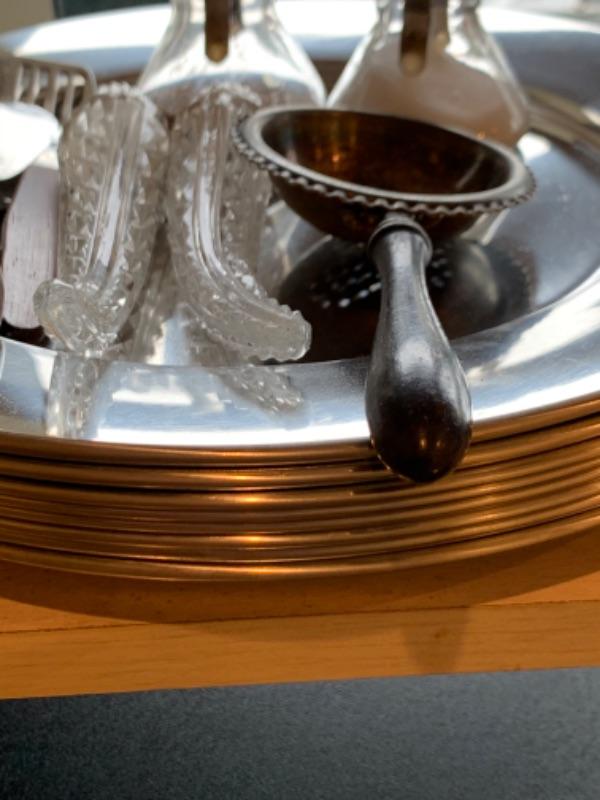 Lot 43D. Assortment of mid-century wooden service pieces, stainless steel, chargers (8), wooden salad bowl, salt and pepper set with relish tray, etc.--Was $225-Now$150