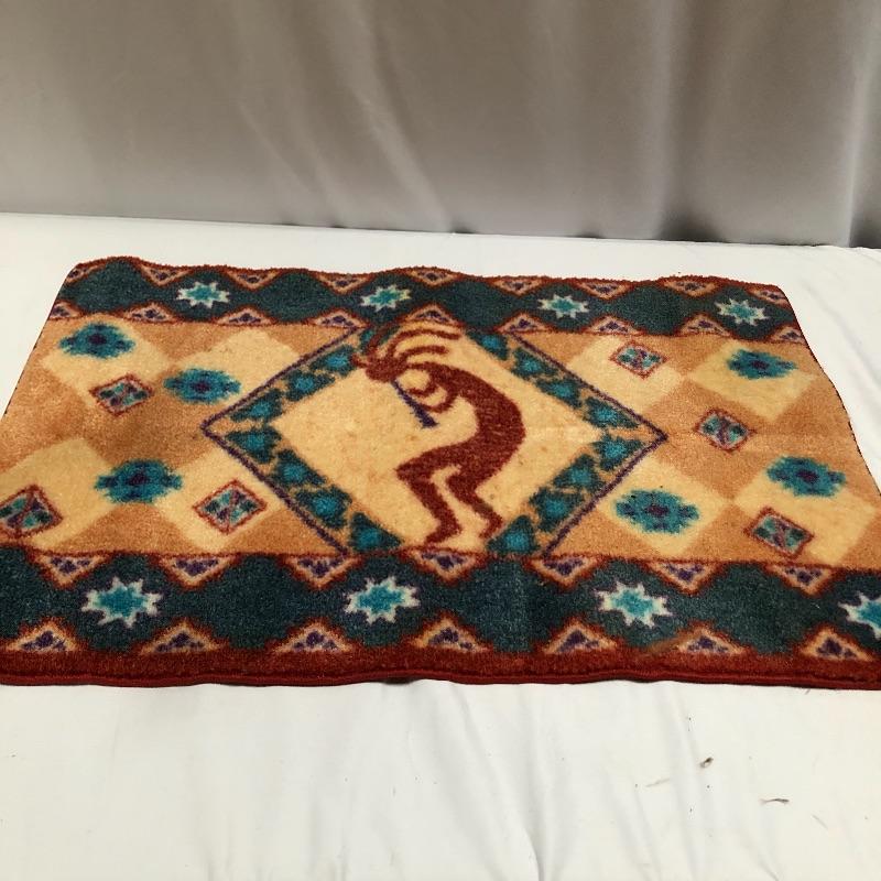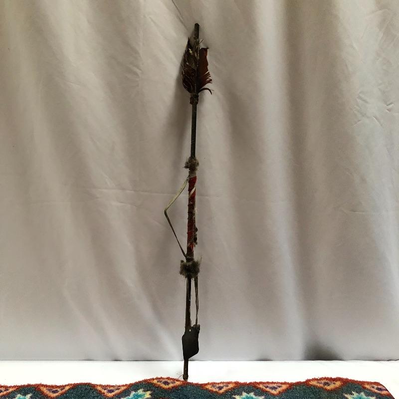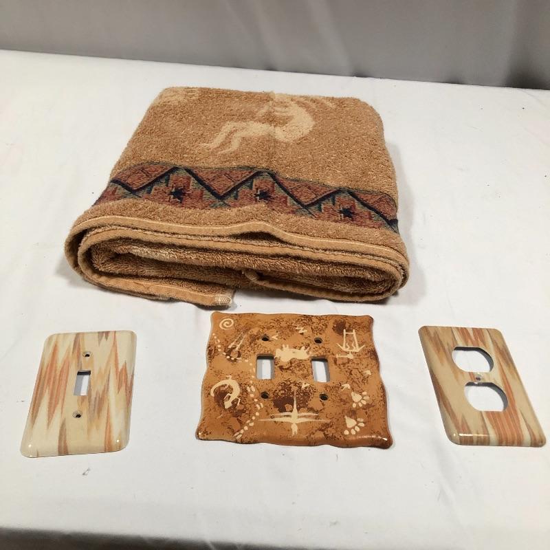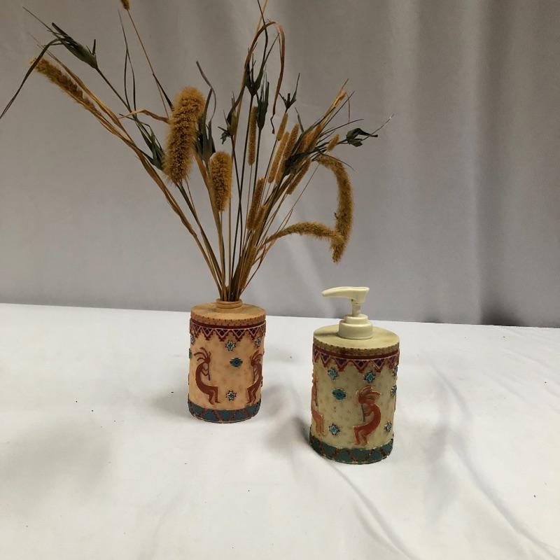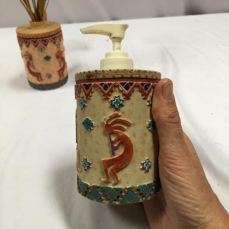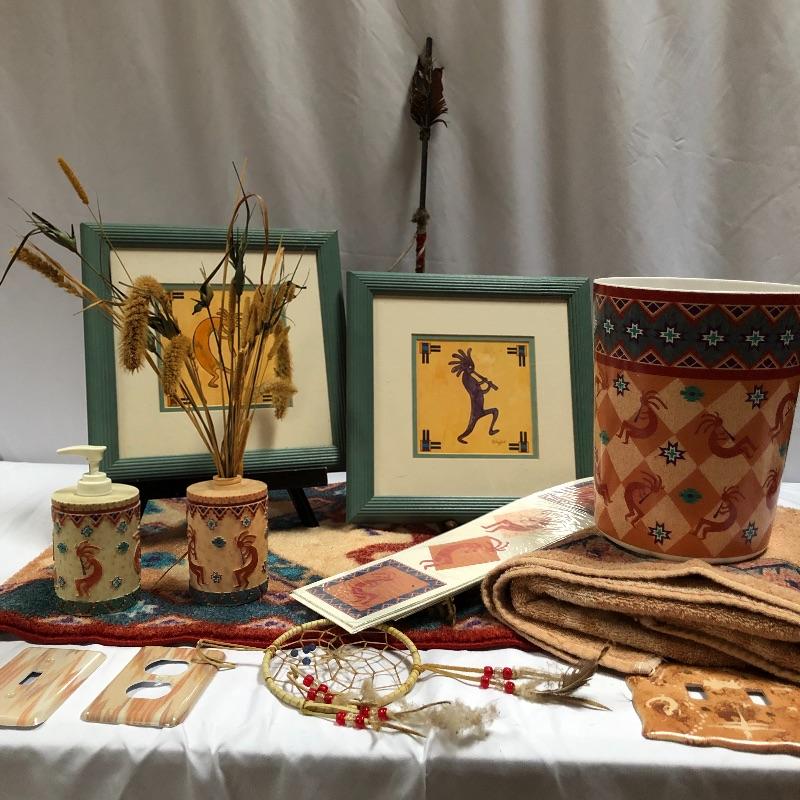 A lovely assortment of Aztec themed bathroom decor in this lot. Included is a bath mat, appliqués, framed art, hand soap dispenser and more. The spear has a label dictating “˜John Wilbur, Oreida, from the Hootchoo collection. It measures 24” long.