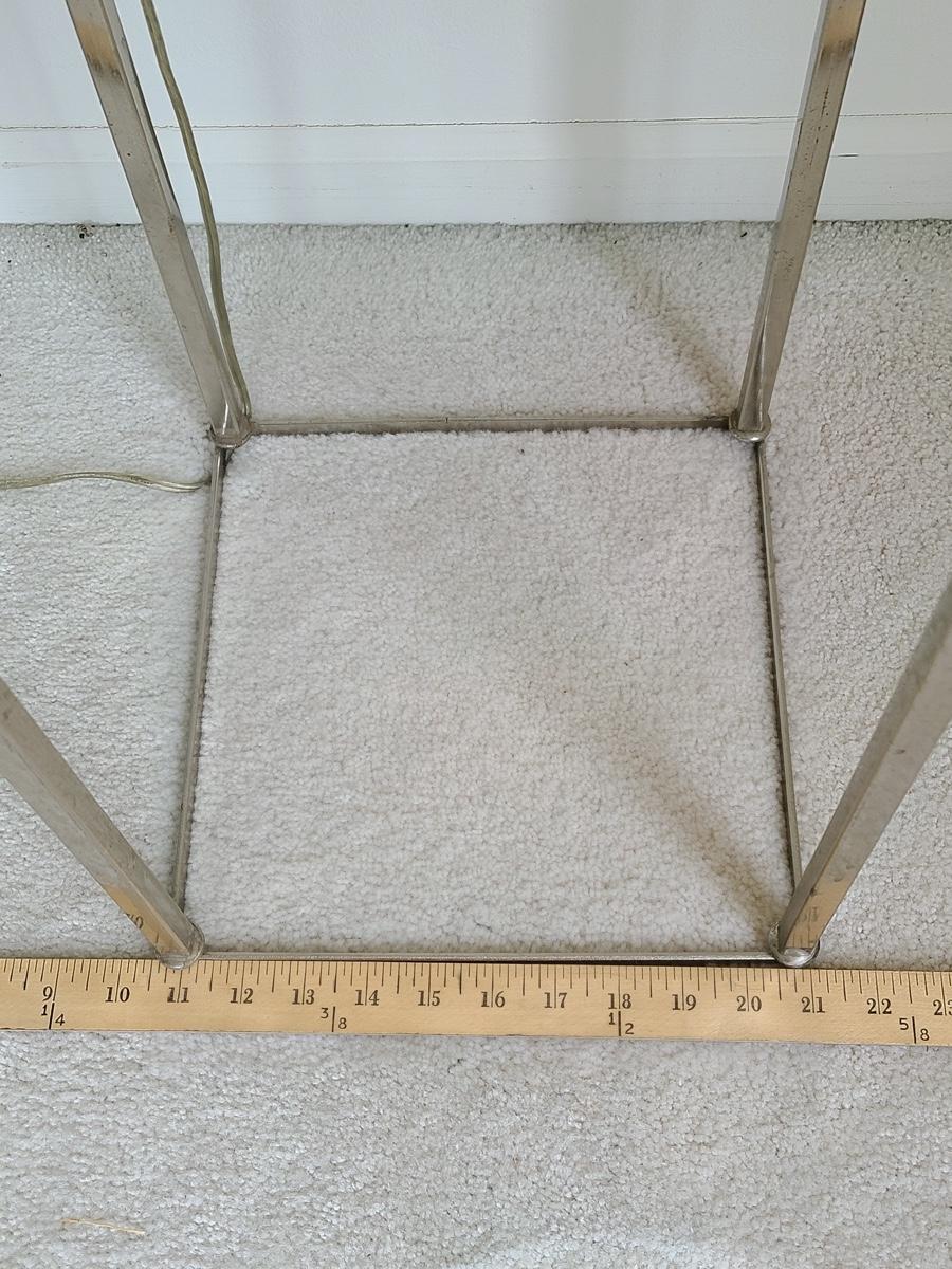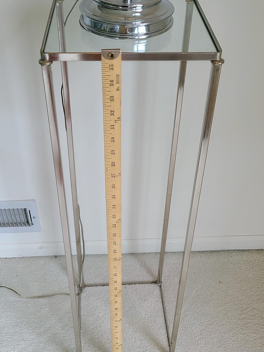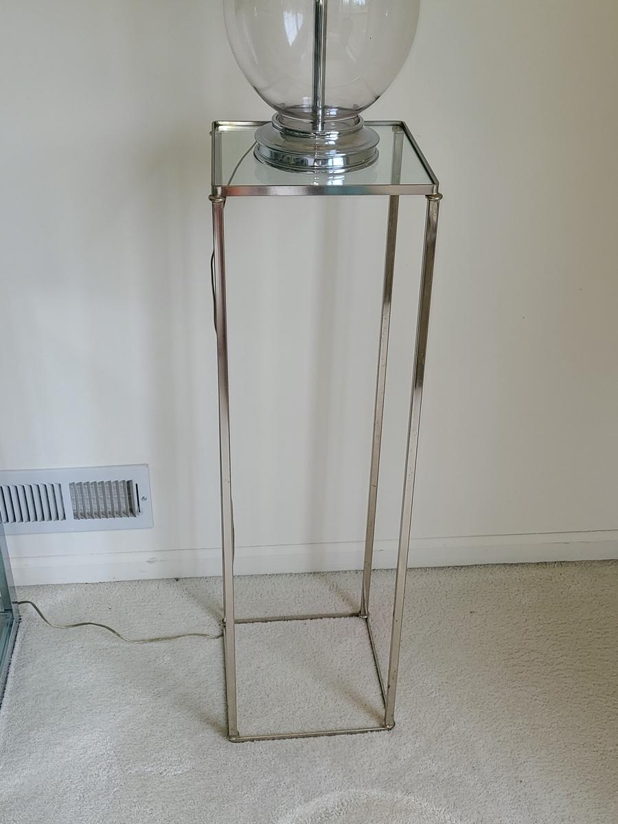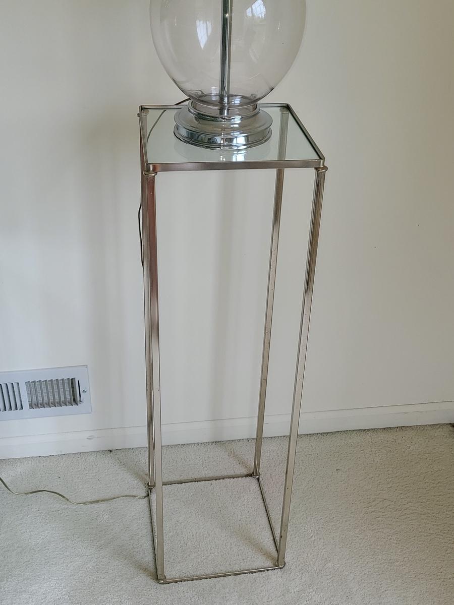This lot is for a MCM chrome metal plant stand with glass top, and modern chrome based lamp with white shade. The white shade does have marks on back and either needs to be turned to the wall or replaced. Please see all pictures for content of the lot, condition of the lot, and measurements if taken. Pictures are the best representation of the items listed and items are untested unless indicated in description. Thank you for looking and have fun bidding![