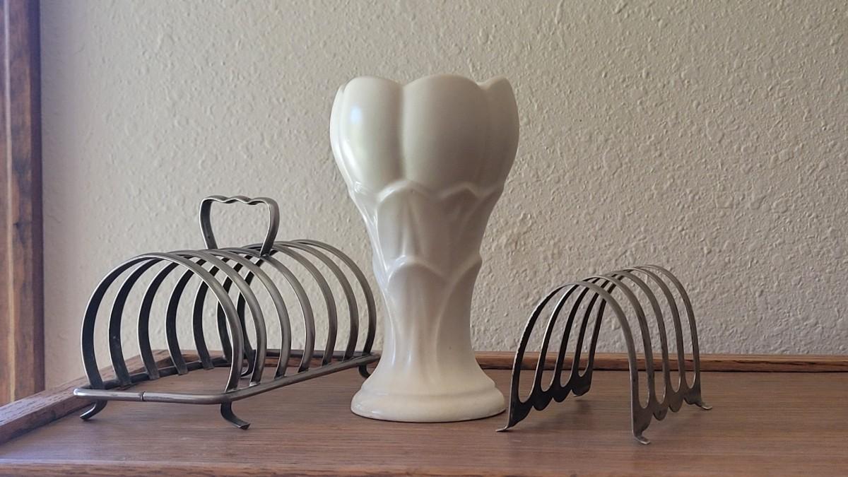 Lot 39: Vintage White Ceramic Vase and 2 Metal Letter Holders