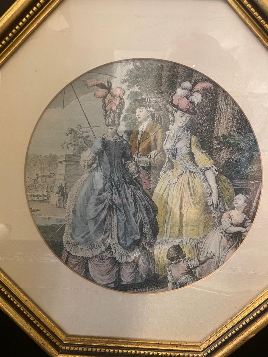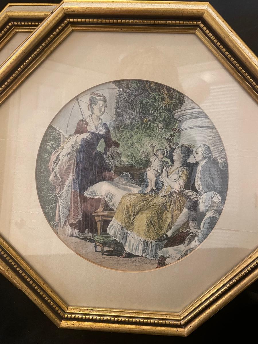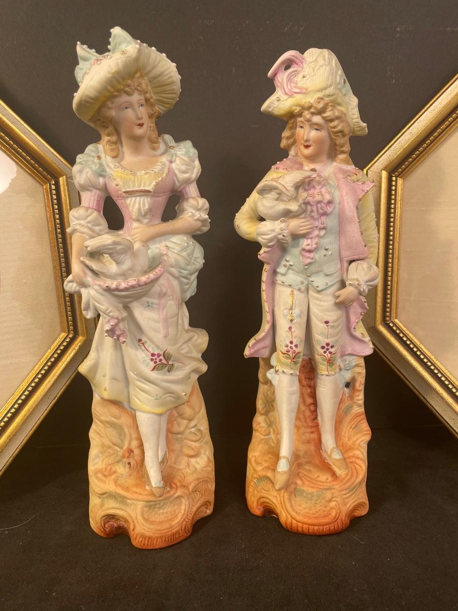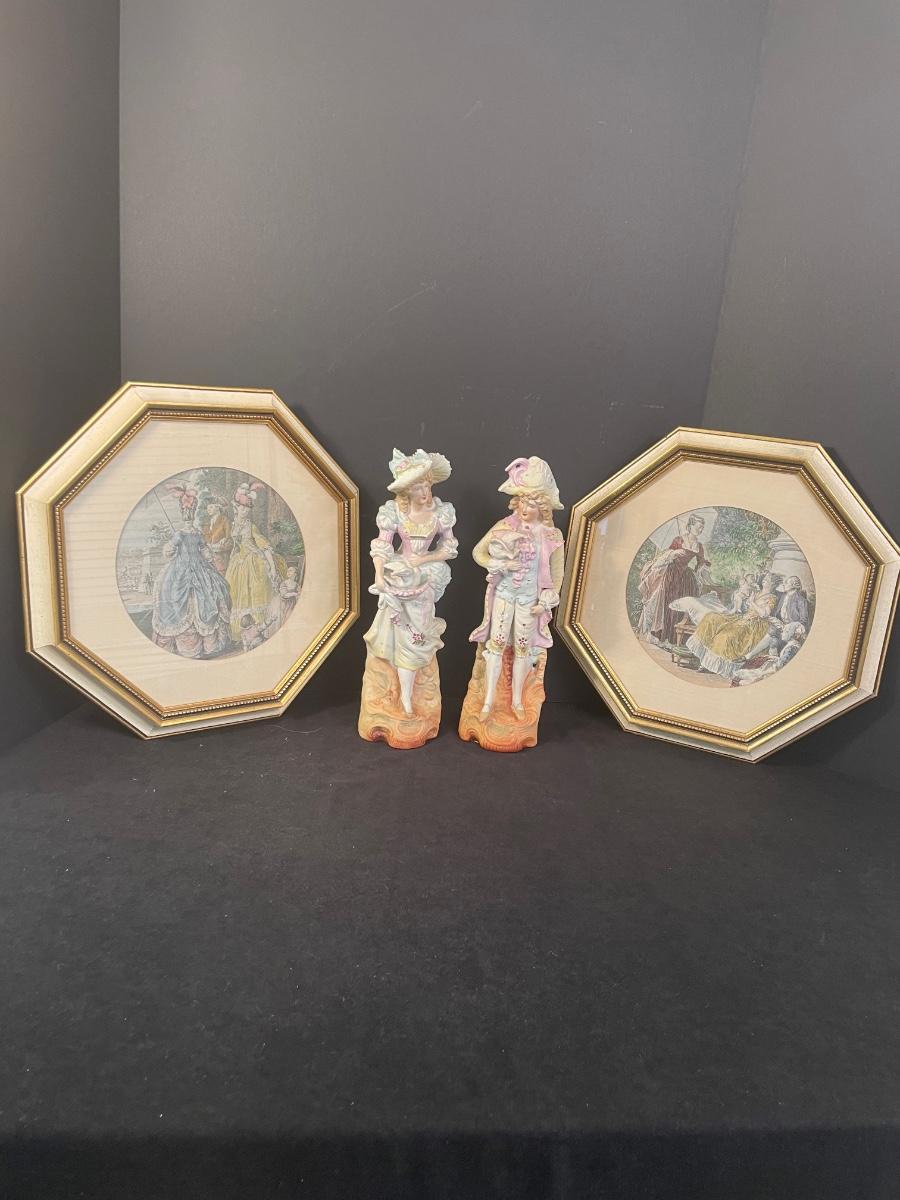 Set of 2 Victorian figurines made in Japan and set of 2 octagon shaped framed Victorian prints.